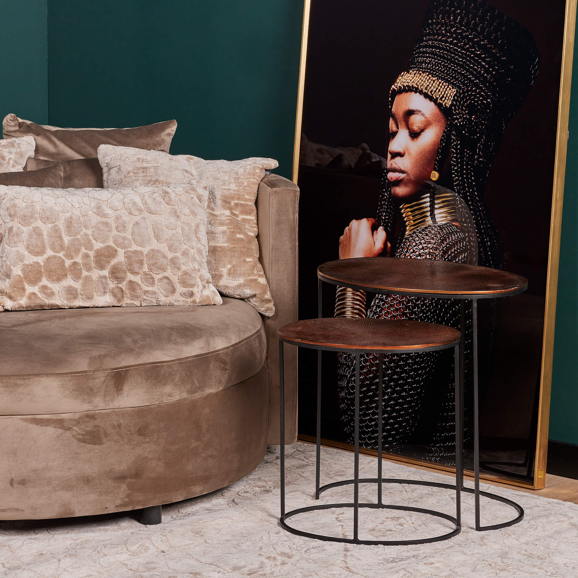 Das Beistelltisch-Set Floria besteht aus zwei Beistelltischen. Die ovalen Tischplatten sind aus Aluminium gefertigt und mit einem Kupfer-Gold-Finish versehen. Die Gestelle der Tische sind aus Eisen gefertigt und mit einer schwarzen Finish versehen. Hinweis:Abmessungen großer Tisch Breite:35 cm Tiefe: 50 cm Höhe: 53 cmAbmessungen kleiner Tisch Breite: 30 cm Tiefe: 40 cm Höhe: 43 cmPflege: mit einem leicht feuchten Tuch abwischen.