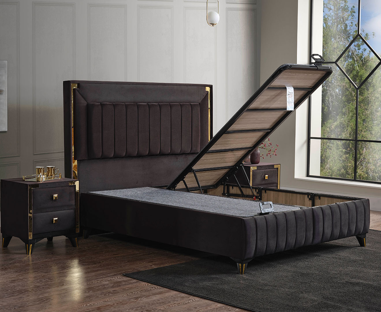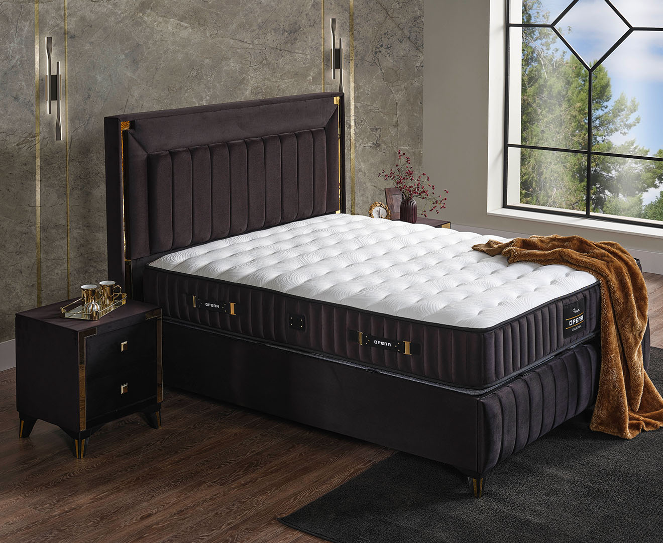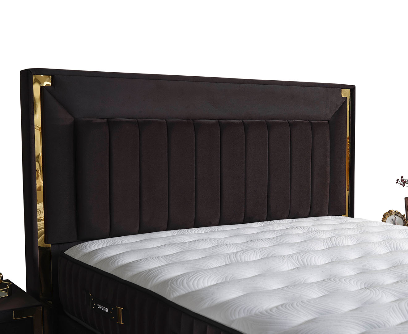 Das luxuriöse Opera Bett Set in edlem Schwarz Samtstoff verwandelt Ihr Schlafzimmer in eine stilvolle Wohlfühloase. Das aufwendig gepolsterte Kopfteil mit vertikalen Steppungen und goldfarbenen Details sorgt für ein glamouröses Ambiente. Robuste, schwarz-goldene Füße aus Kunststoff Gold Schwarz setzen zusätzliche edle Akzente und gewährleisten Stabilität. Der praktische integrierte Bettkasten bietet großzügigen Stauraum für Ihre Bettwäsche oder weitere Utensilien. Das Opera Bett Set kombiniert exquisites Design mit höchstem Komfort und Funktionalität.