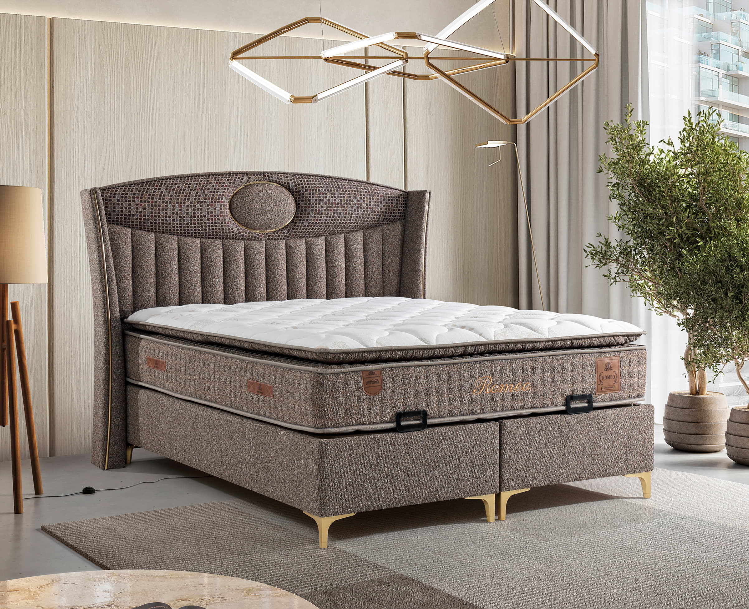 Das Romeo Bett-Set besticht mit einem extravaganten Design und königlichem Charme. Das kunstvoll gestaltete Kopfteil mit gesteppter Polsterung und edlen Lederakzenten schafft eine luxuriöse Atmosphäre. Die hochwertige Matratze und das stabile Boxspring-System bieten optimalen Schlafkomfort und garantieren Langlebigkeit und Stabilität.