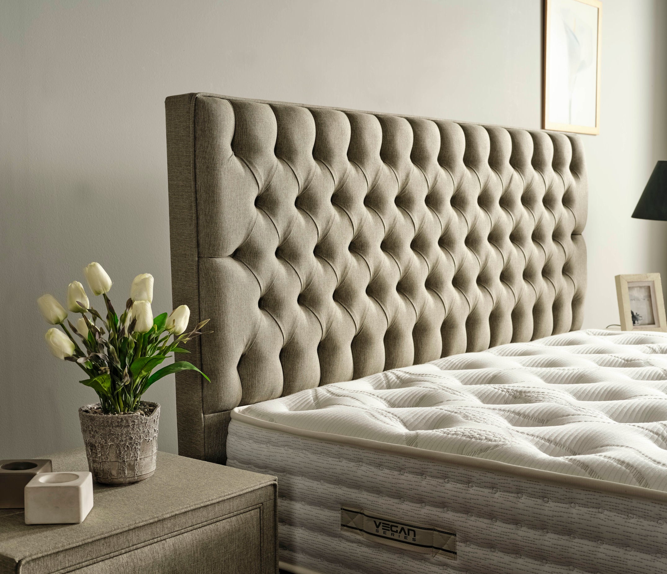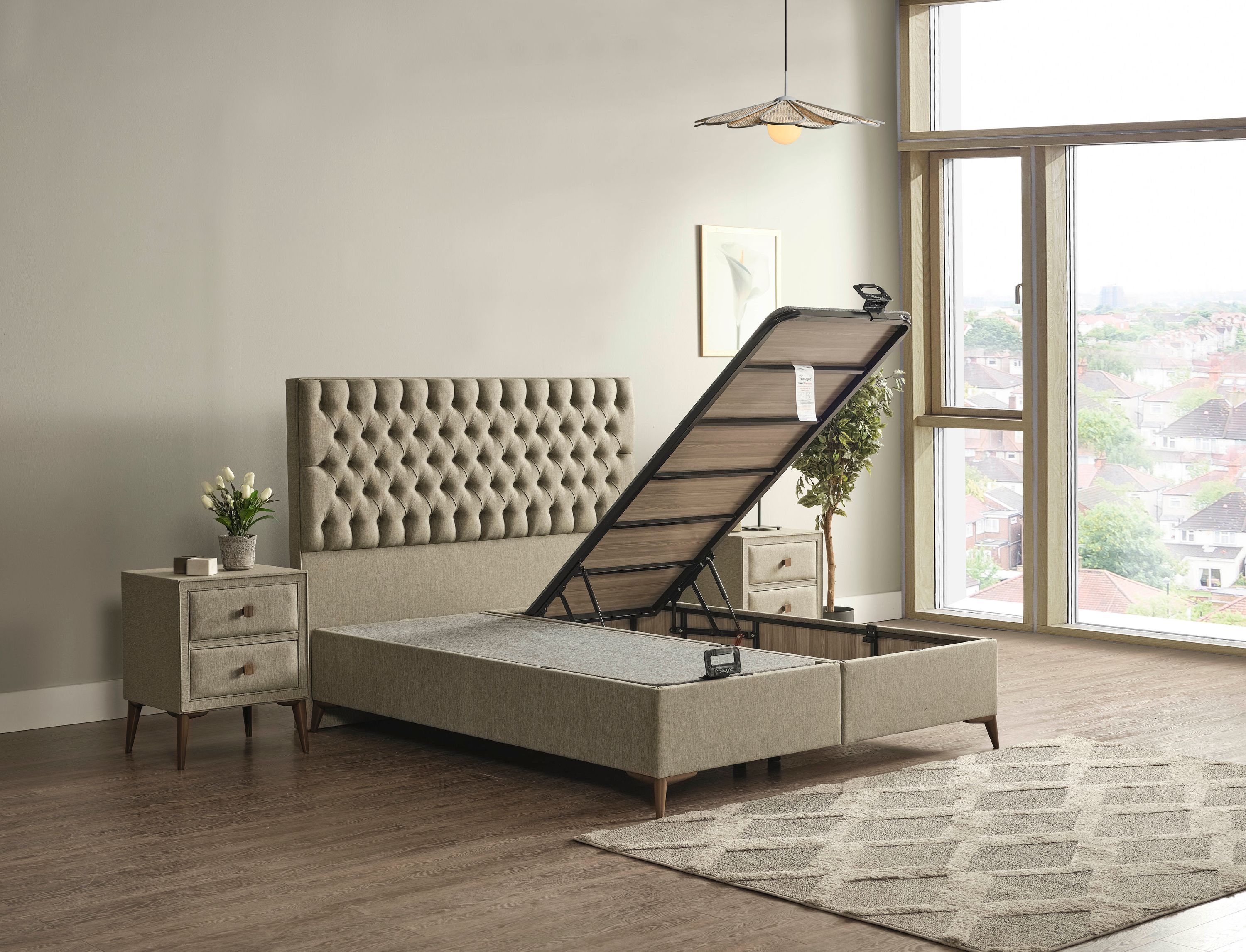 Das Vegan Bett Set kombiniert luxuriöses Design mit nachhaltiger Eleganz. Der hochwertige Webstoff-Bezug sorgt für eine angenehme Haptik und eine stilvolle Optik. Das imposante, gesteppte Chesterfield-Kopfteil verleiht dem Bett eine zeitlose Ausstrahlung und bietet eine komfortable Rückenlehne. Dank des integrierten Bettkastens mit praktischem Stauraum lassen sich Bettwäsche und Kissen mühelos verstauen. Die stabilen Kunststofffüße in Braun sorgen für sicheren Halt und eine lange Lebensdauer. Die edlen Details machen dieses Bett zu einem Highlight in jedem Schlafzimmer. Erhältlich in verschiedenen Größen, passt sich das Vegan Bett Set ideal Ihren individuellen Bedürfnissen an.