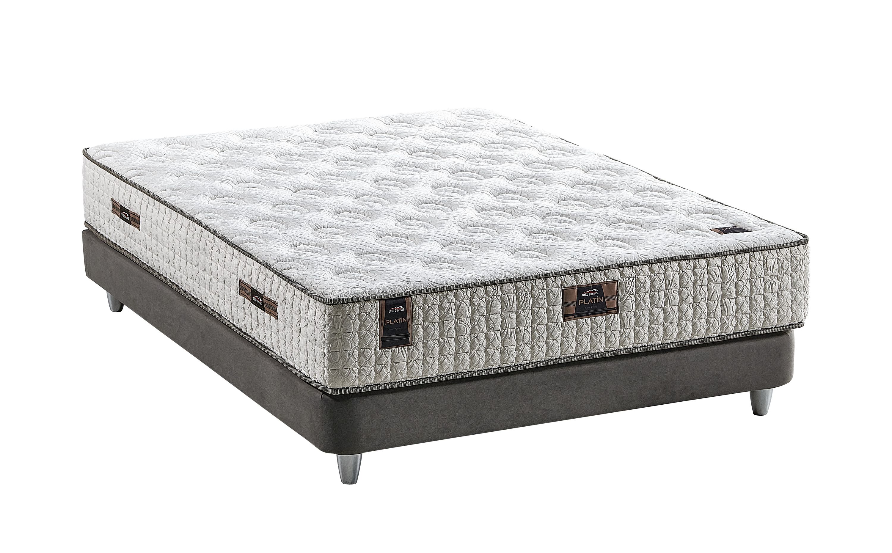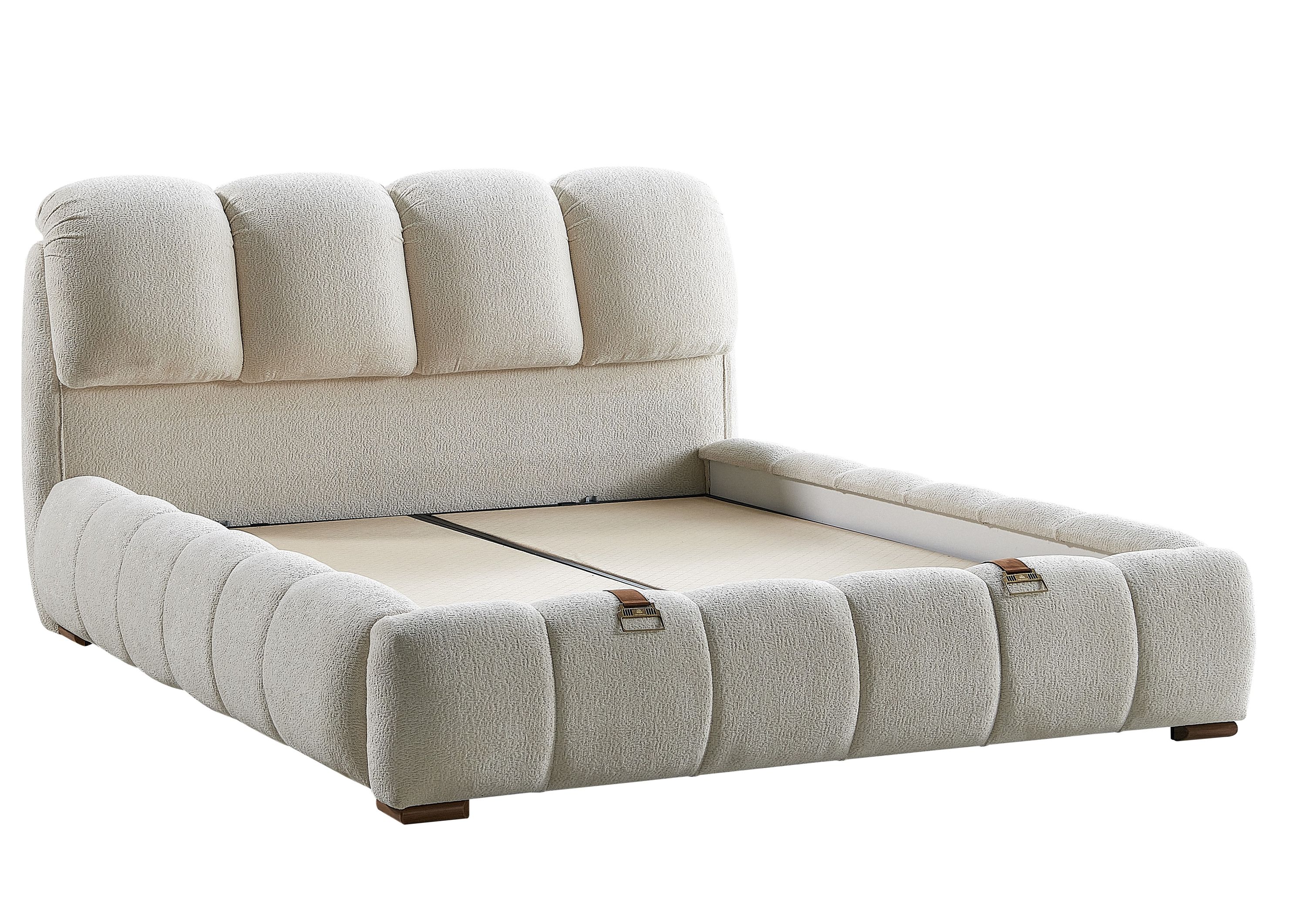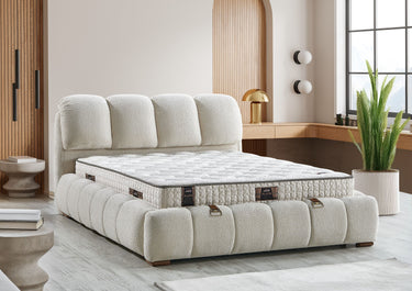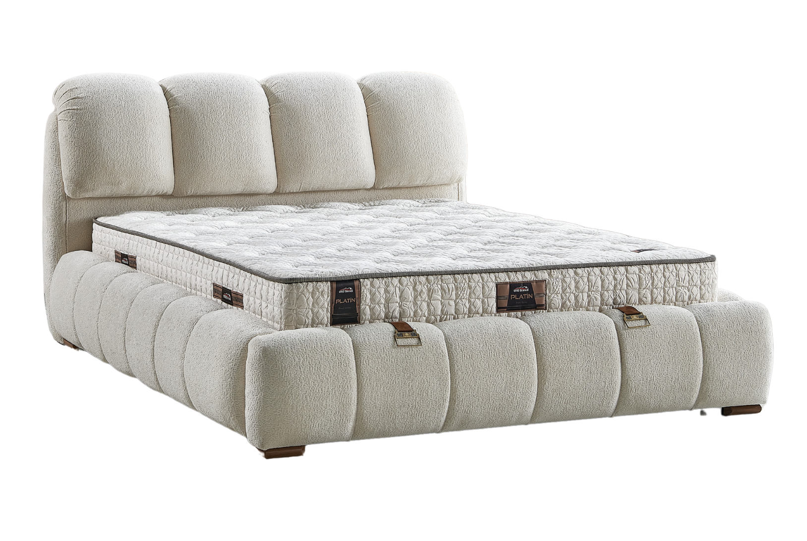 Das Platin Bett-Set bietet ein modernes und luxuriöses Design mit gepolstertem Kopfteil und robustem Unterbau. Der hochwertige Bouclé-Stoff sorgt für eine weiche Haptik, während die großzügige Polsterung ein gemütliches Ambiente schafft. Der integrierte Stauraum ermöglicht eine platzsparende Organisation, während die stabile Konstruktion für Langlebigkeit sorgt. Die mitgelieferte Matratze bietet ergonomischen Liegekomfort und eine optimale Unterstützung für einen erholsamen Schlaf.