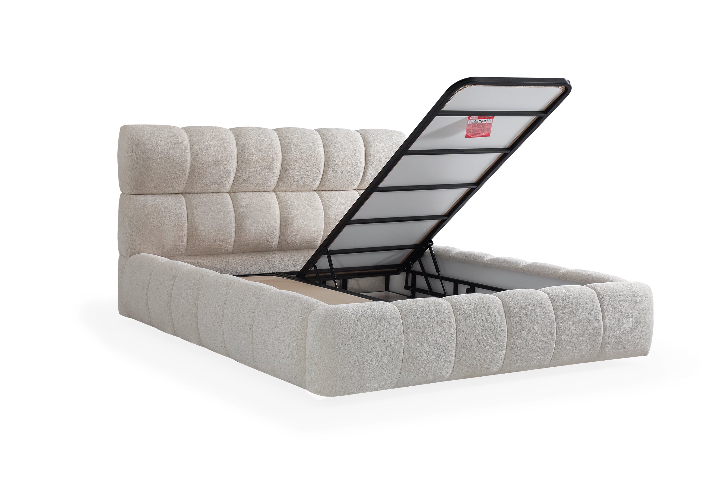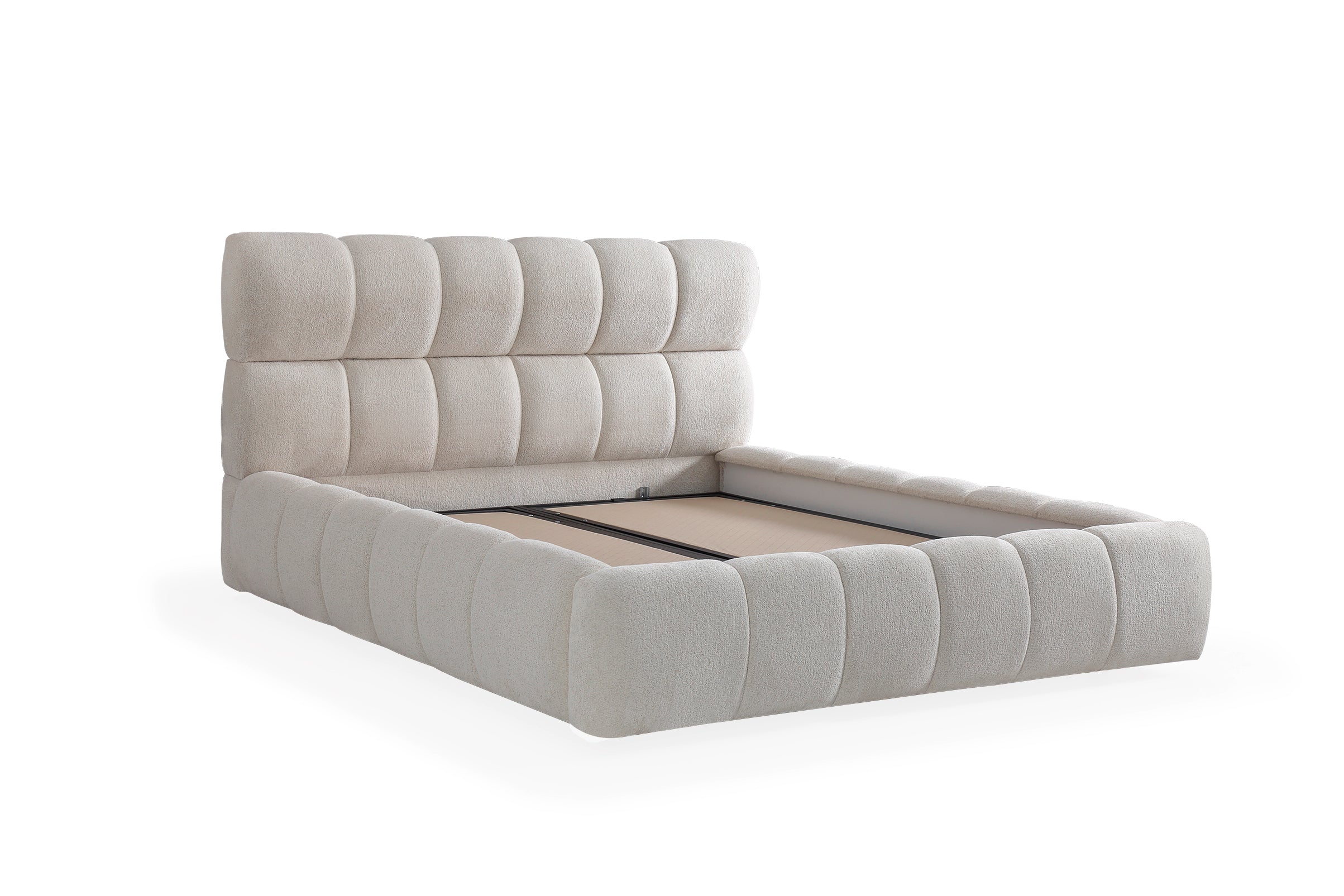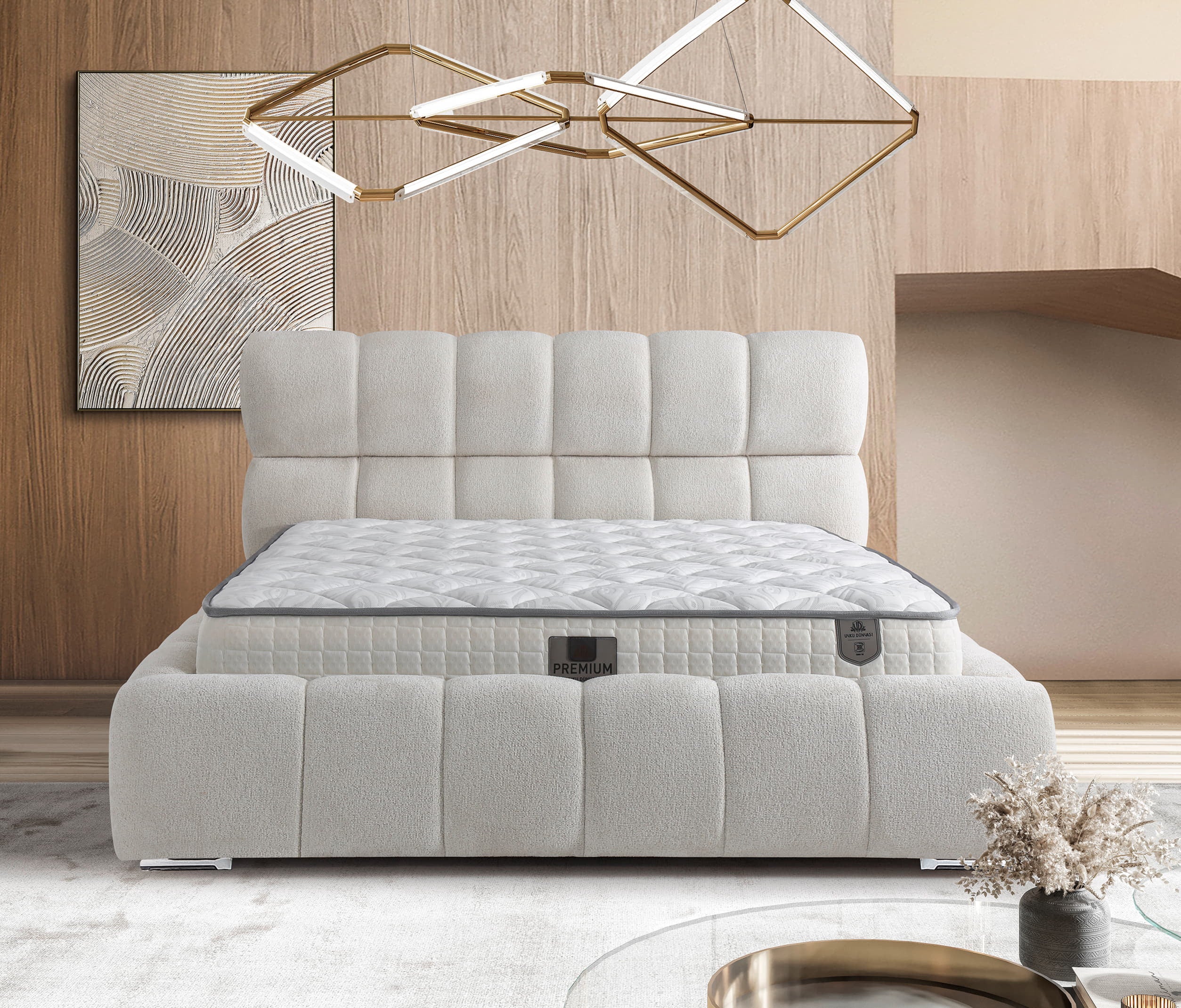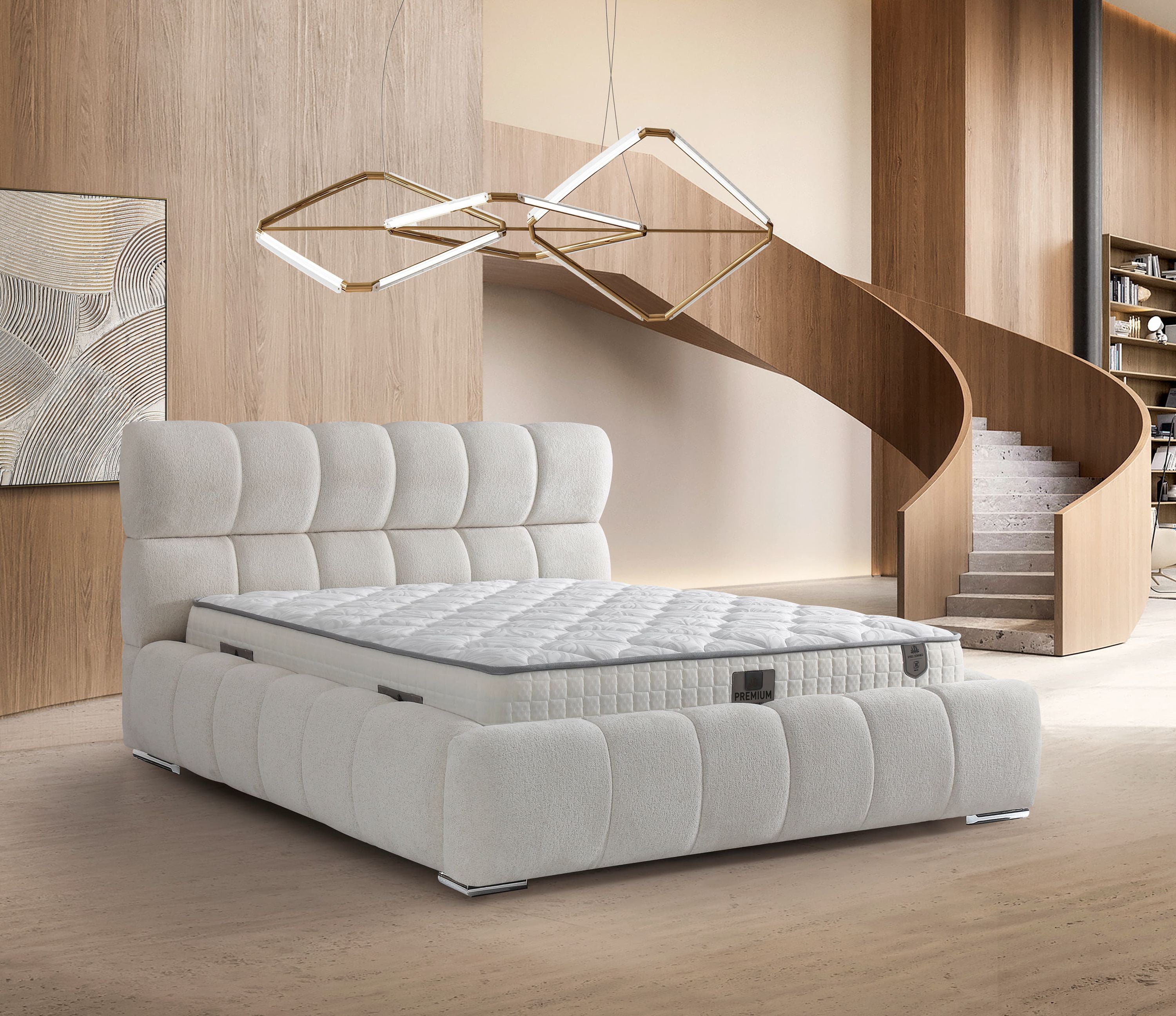 Das Premium Bett mit Bettkasten in Fendi 01-02 Creme bietet luxuriösen Komfort und ein außergewöhnliches Design. Das weich gepolsterte, aufwendig gesteppte Kopfteil verleiht dem Bett eine stilvolle und moderne Optik. Die großzügige Federkernmatratze mit Pillow-Top passt sich optimal an den Körper an und sorgt für einen tiefen, erholsamen Schlaf. Der integrierte Bettkasten bietet viel Stauraum für Bettwäsche, Kissen oder saisonale Textilien und lässt sich dank eines leichtgängigen Öffnungssystems mühelos bedienen. Der hochwertige Fendi 01-02 Stoff in Creme ist besonders weich, pflegeleicht und langlebig. Das Premium Bett mit Bettkasten ist in verschiedenen Größen, Matratzenarten und Kopfteilvarianten erhältlich – die perfekte Wahl für alle, die auf maximalen Komfort und edles Design setzen.