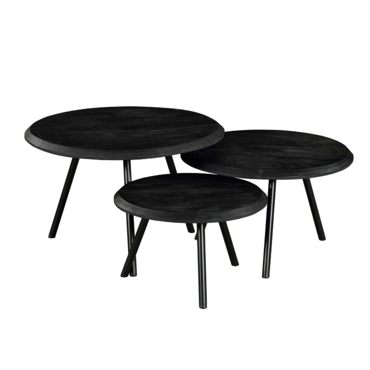 Das Couchtisch-Set Ovaro Black besteht aus drei einzelnen Tischen mit massiven Mangoholzplatten, die schwarz lackiert sind. Jede Tischplatte ist mit 3 Metallbeinen ausgestattet.Abmessungen größte Tisch Durchmesser Ø70 cm Höhe: 45 cmAbmessungen Mittlerer Tisch Durchmesser Ø60 cm Höhe: 38 cmAbmessungen kleine Tisch Durchmesser: Ø50 cm Höhe: 31 cmPflege: mit einem leicht feuchten Tuch abwischen.
