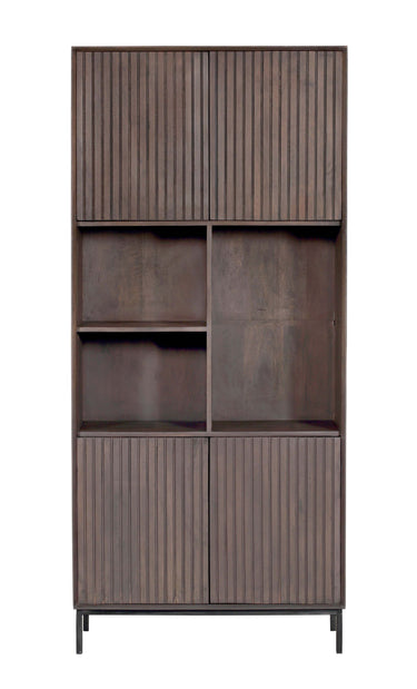 Der Fächerschrank Ellison ist aus Mangoholz gefertigt. Der Metallrahmen ist schwarz lackiert. Dieses Modell verf ügt über vier T üren und drei offene Fächer. Die T üren sind mit einem vertikalen Lamellenmuster versehen und haben eine Walnuss-Oberflächenbehandlung.Abmessungen Breite: 90 cm Tiefe: 45 cm Höhe: 200 cmPflege: mit einem leicht feuchten Tuch abwischen.