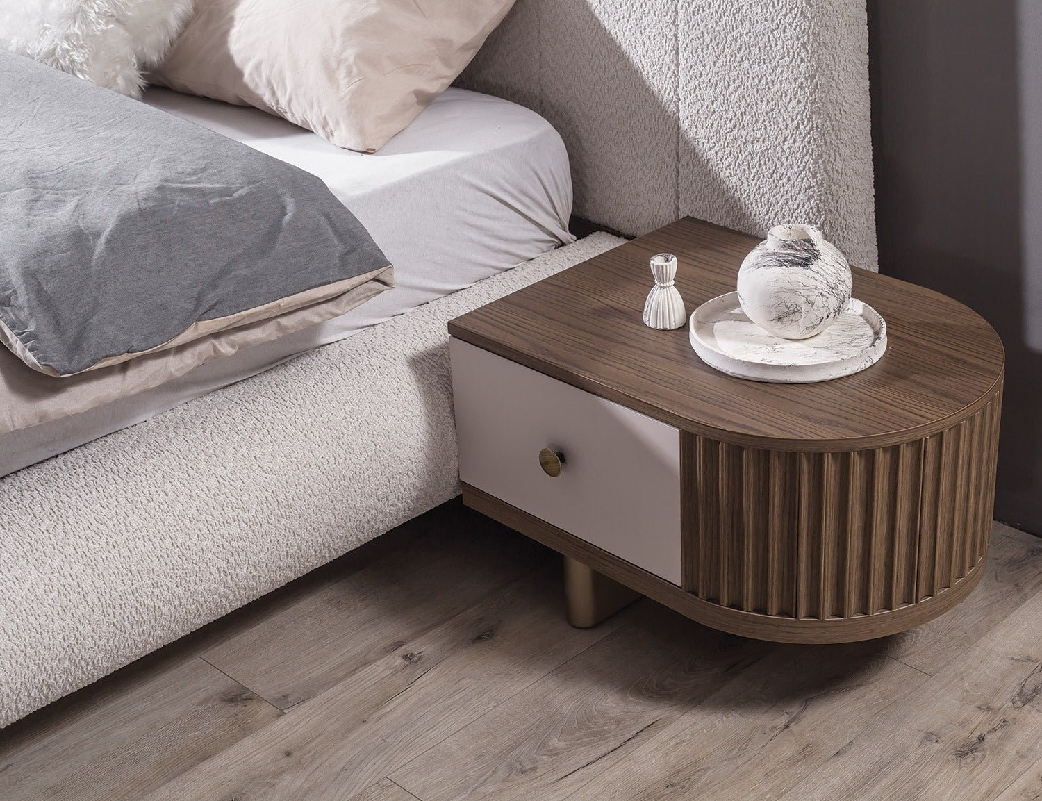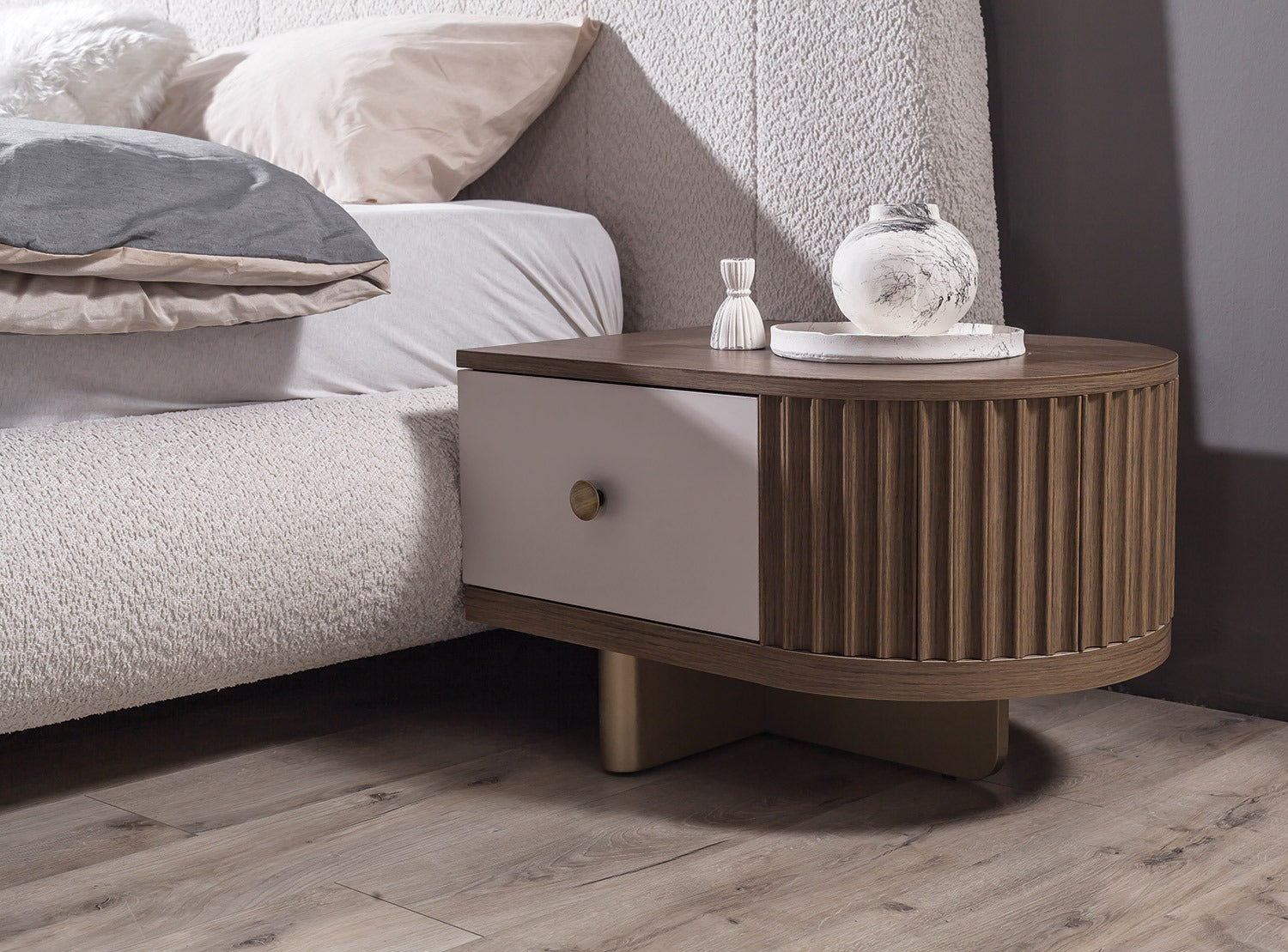 Das Rubato Schlafzimmer-Set kombiniert weich geschwungene Formen mit einem modernen Farbspiel aus warmem Walnuss und klarem Weiß. Die Polsterstruktur des Bettes und die gerillten Oberflächen verleihen dem Raum stilvolle Geborgenheit.