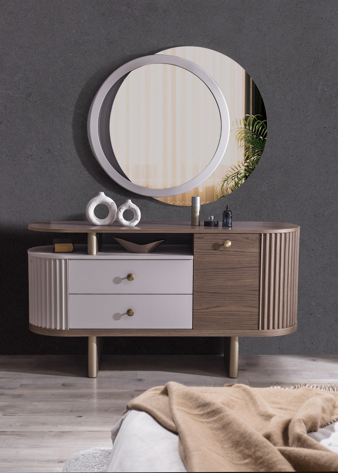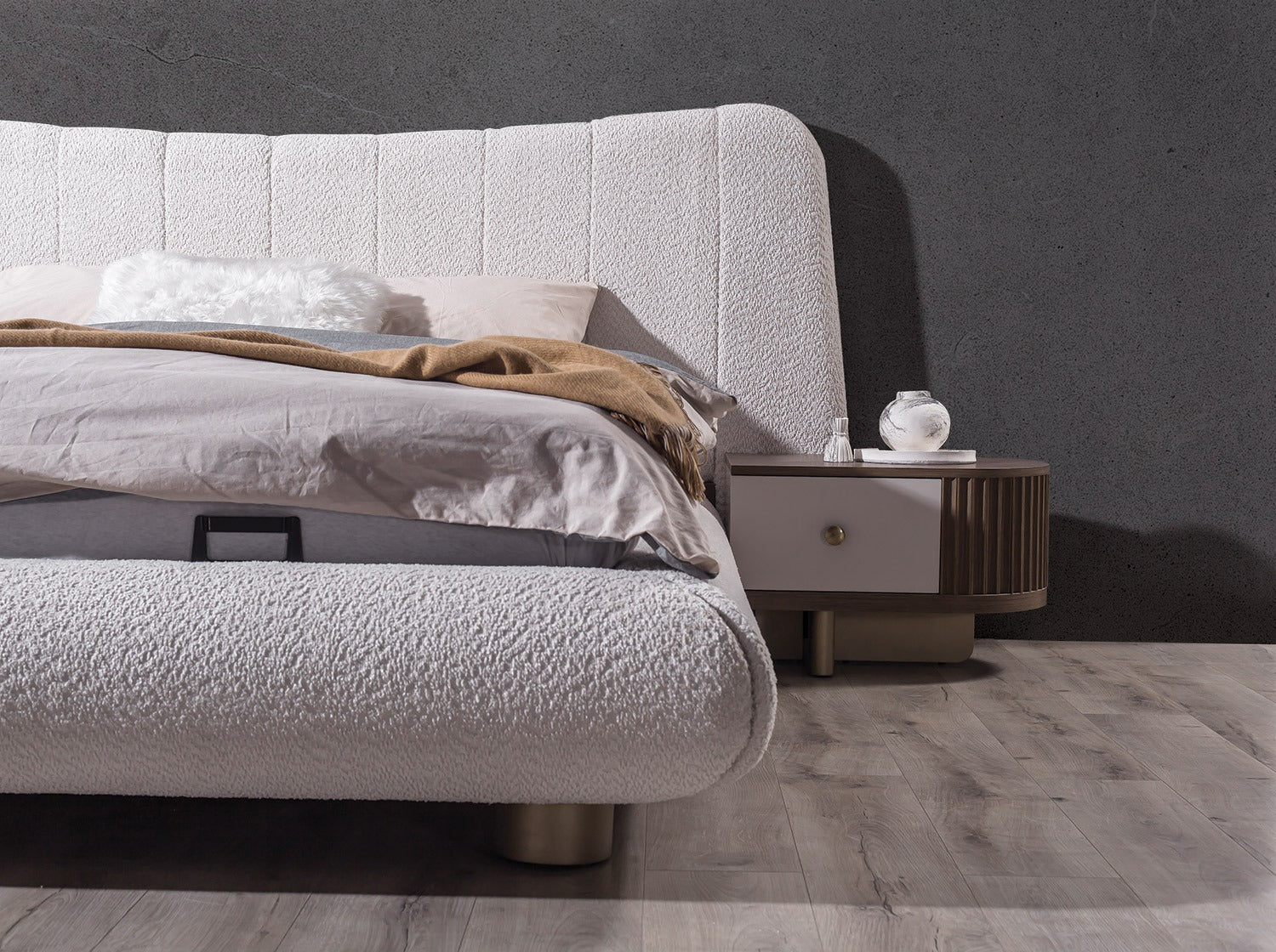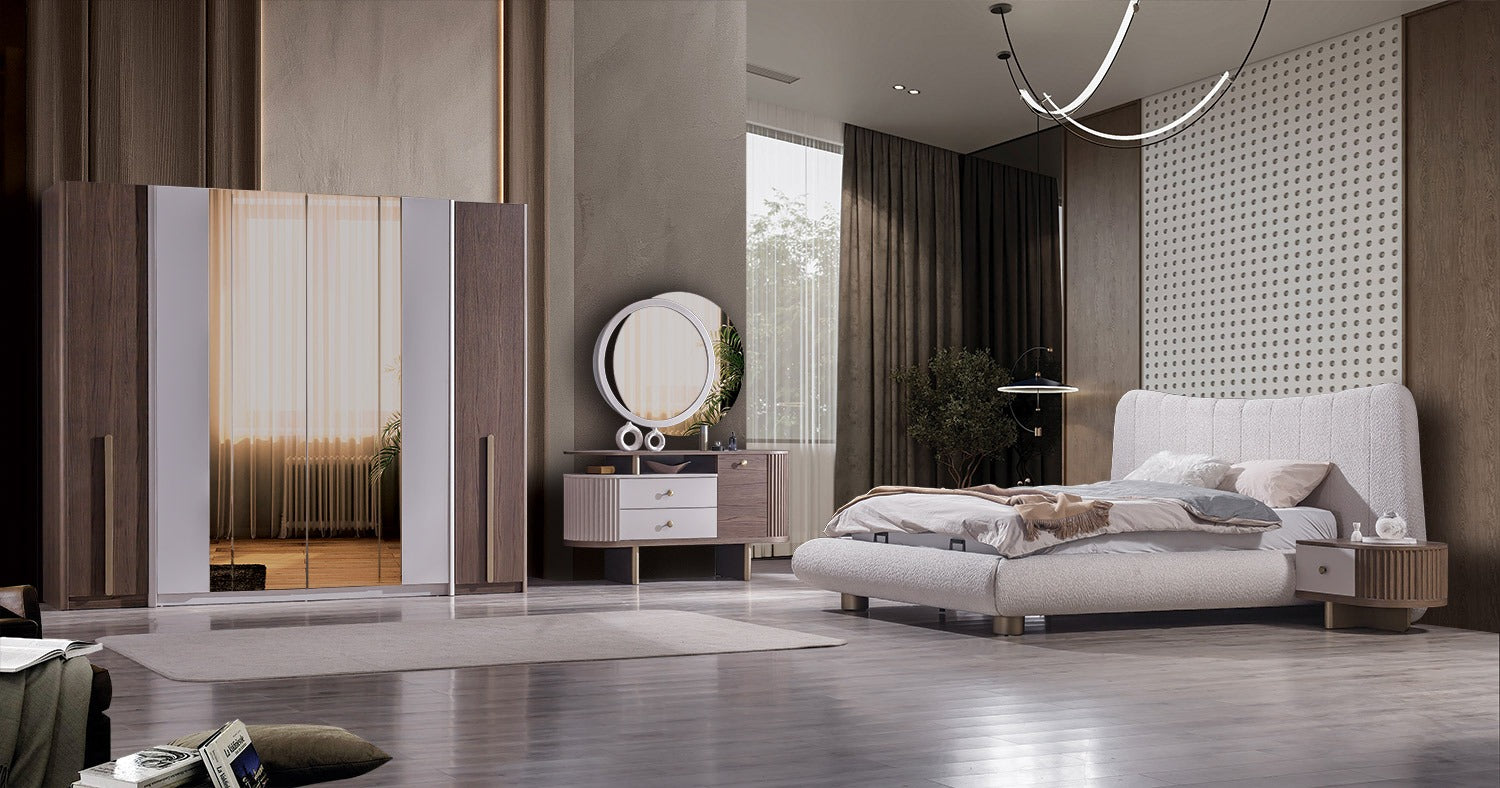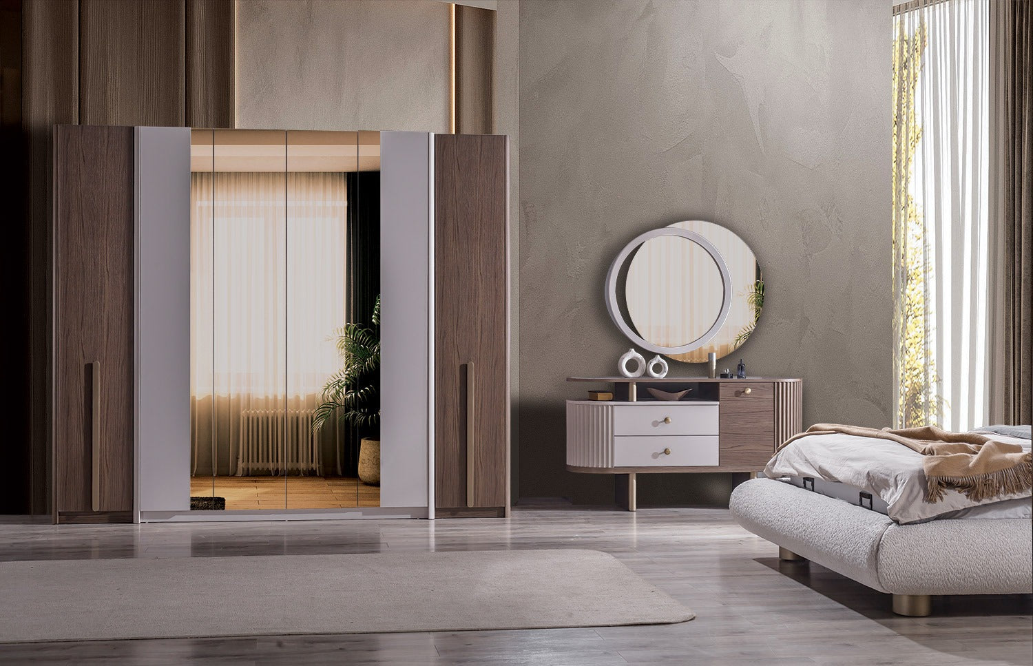 Die Kombination aus melaminbeschichteten MDF-Platten, strukturiertem Stoffbezug und verspiegelten Fronten bringt Hochwertigkeit in jedes Schlafzimmer. Warme Walnuss-Holzoptik trifft auf elegante Weißtöne – ideal für eine ruhige und edle Schlafumgebung.