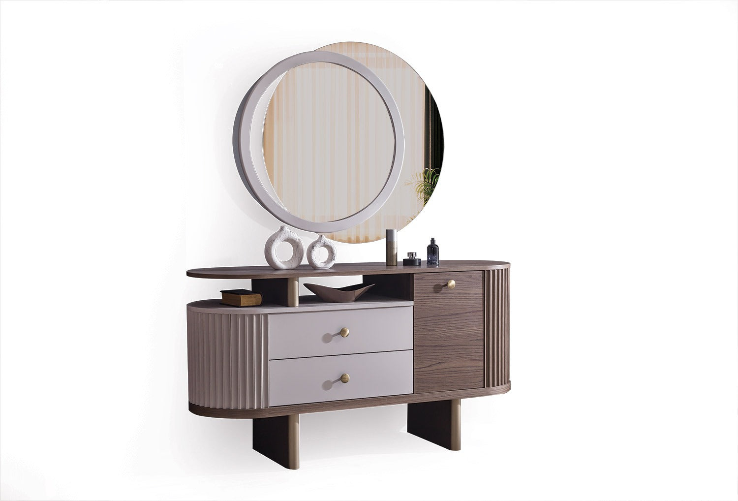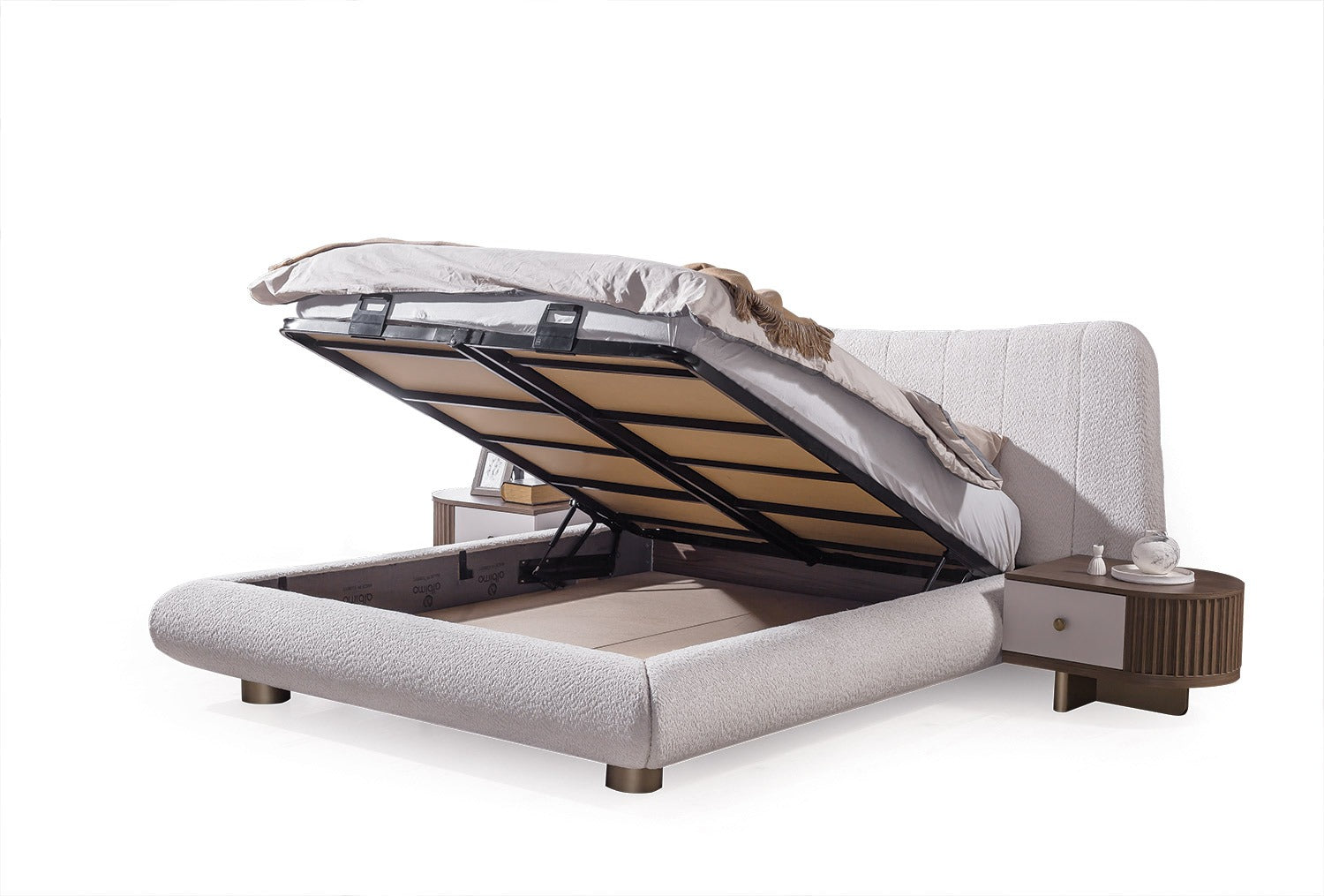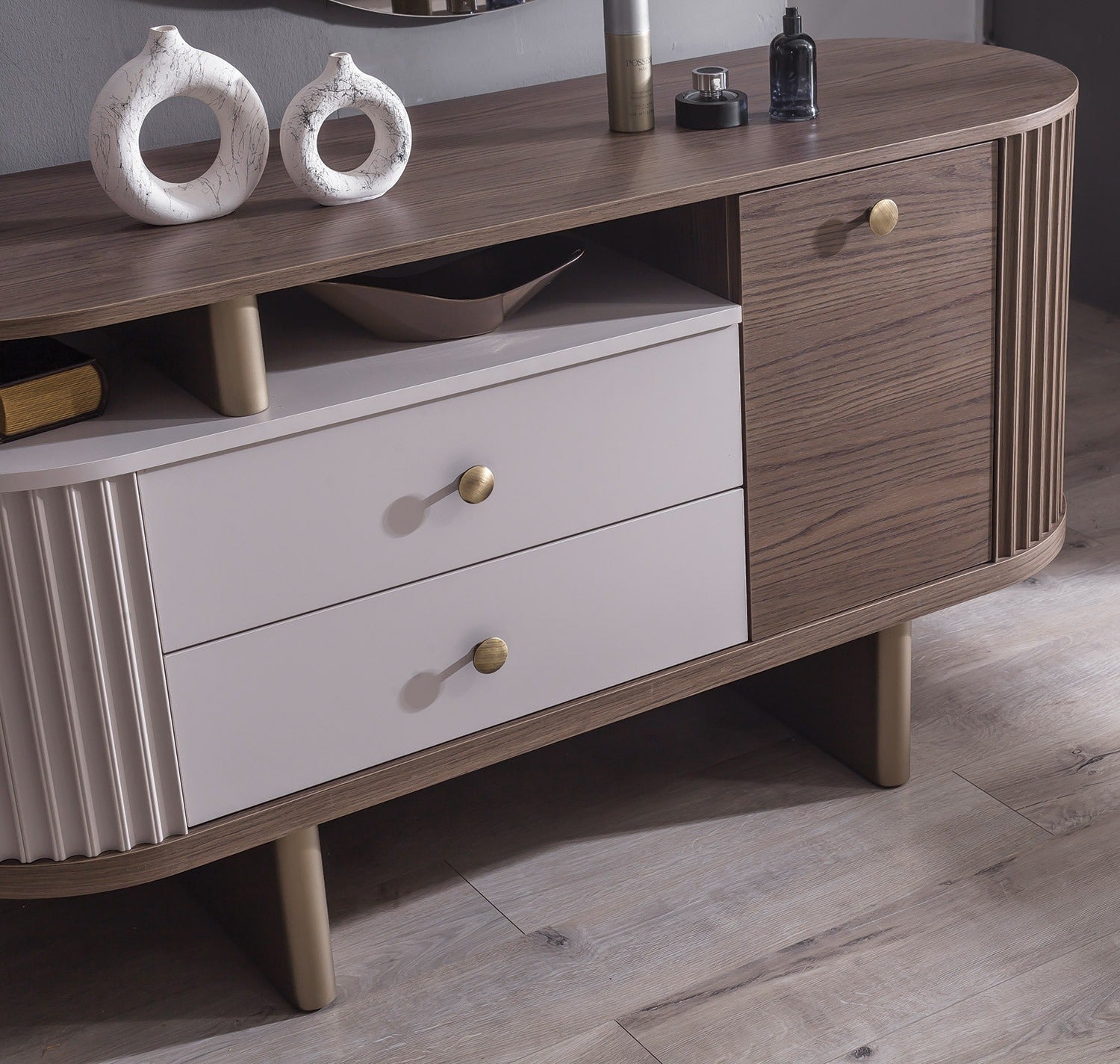 Die Kombination aus melaminbeschichteten MDF-Platten, strukturiertem Stoffbezug und verspiegelten Fronten bringt Hochwertigkeit in jedes Schlafzimmer. Warme Walnuss-Holzoptik trifft auf elegante Weißtöne – ideal für eine ruhige und edle Schlafumgebung.