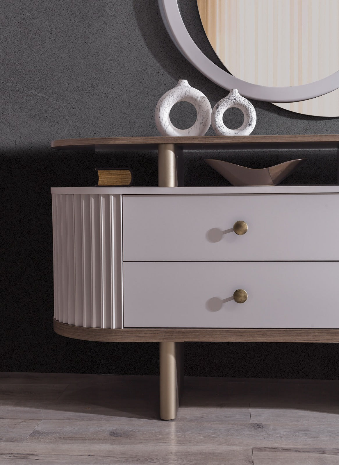 Der große Spiegelschrank mit vertikalen Griffleisten sorgt für Helligkeit und Tiefe. Das gerundete Bett mit Stoffbezug bietet nicht nur Gemütlichkeit, sondern auch ein modernes Erscheinungsbild. Die formschönen Nachtkonsolen und die Kommode mit rundem Spiegel vervollständigen das Ensemble funktional wie optisch.