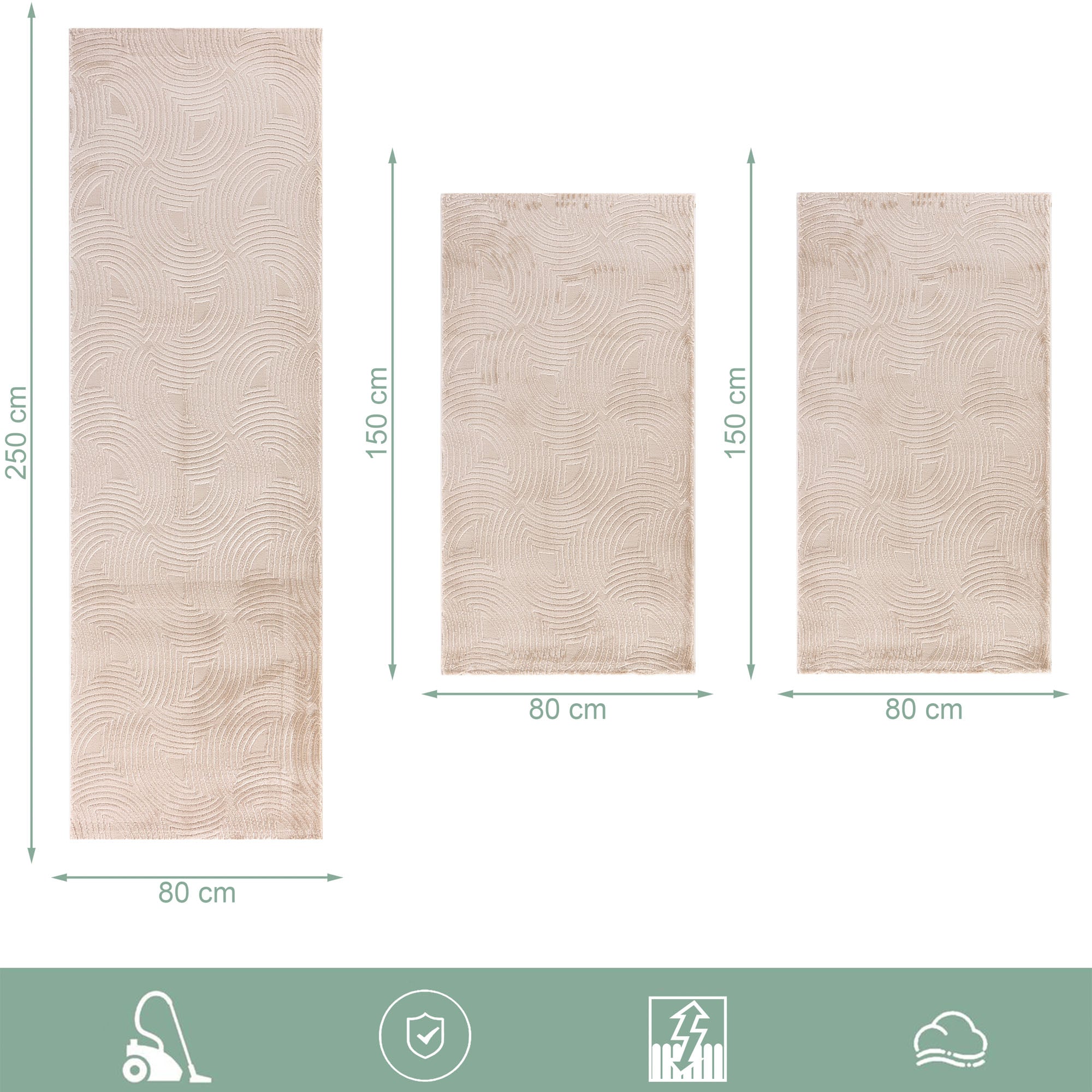 Set-Inhalt: 2 Teppiche 80x150 cm + 1 Teppich 80x250 cm. Damit eignet sich die Kombination perfekt zur vollständigen Umrandung des Bettes und schafft ein harmonisches Gesamtbild.