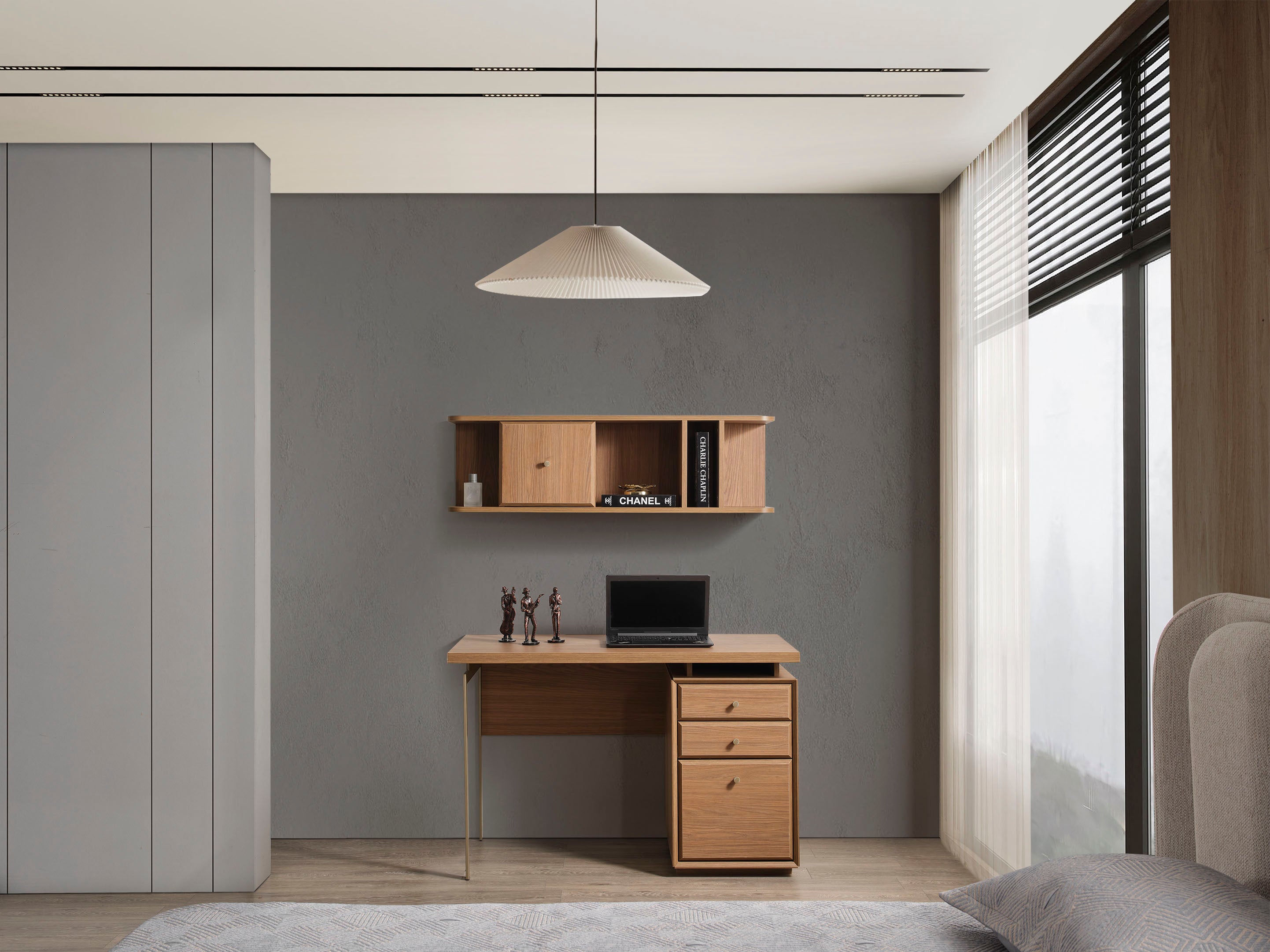Ein echtes Highlight ist der zweiteilige Schreibtisch, bestehend aus einer geräumigen Arbeitsfläche und einem praktischen Wandregal – perfekt für konzentriertes Lernen oder kreative Projekte. Die kompakte Nachtkommode mit Metallfüßen und die harmonische Farbgebung runden das Set elegant ab. Mit funktionalem Design und einem modernen Charakter bietet das Napoli-Set alles, was ein stilvolles Jugendzimmer braucht.