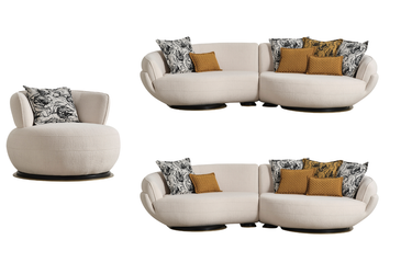Das Levante Sofa Set kombiniert modernes, abgerundetes Design mit wohnlicher Eleganz. Der 4-Sitzer und der 3-Sitzer bieten großzügige Sitzflächen, während der Sessel das Set harmonisch ergänzt. Der hochwertige Beige-Stoffbezug verleiht dem Ensemble eine helle, freundliche Note. Die kontrastreichen Kissen in Senfgelb und Schwarz-Weiß-Muster setzen dekorative Akzente und runden den modernen Look ab.
