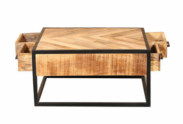 Der quadratische Couchtisch Darlington ist aus Mangoholz mit einem Fischgrätenmuster gefertigt. Dieses Modell verf ügt über vier Schubladen mit Metallgriffen, und die Metallelemente sind schwarz lackiert Abmessungen Breite: 80 cm Tiefe: 80 cm Höhe: 40 cmPflege: mit einem leicht feuchten Tuch abwischen..