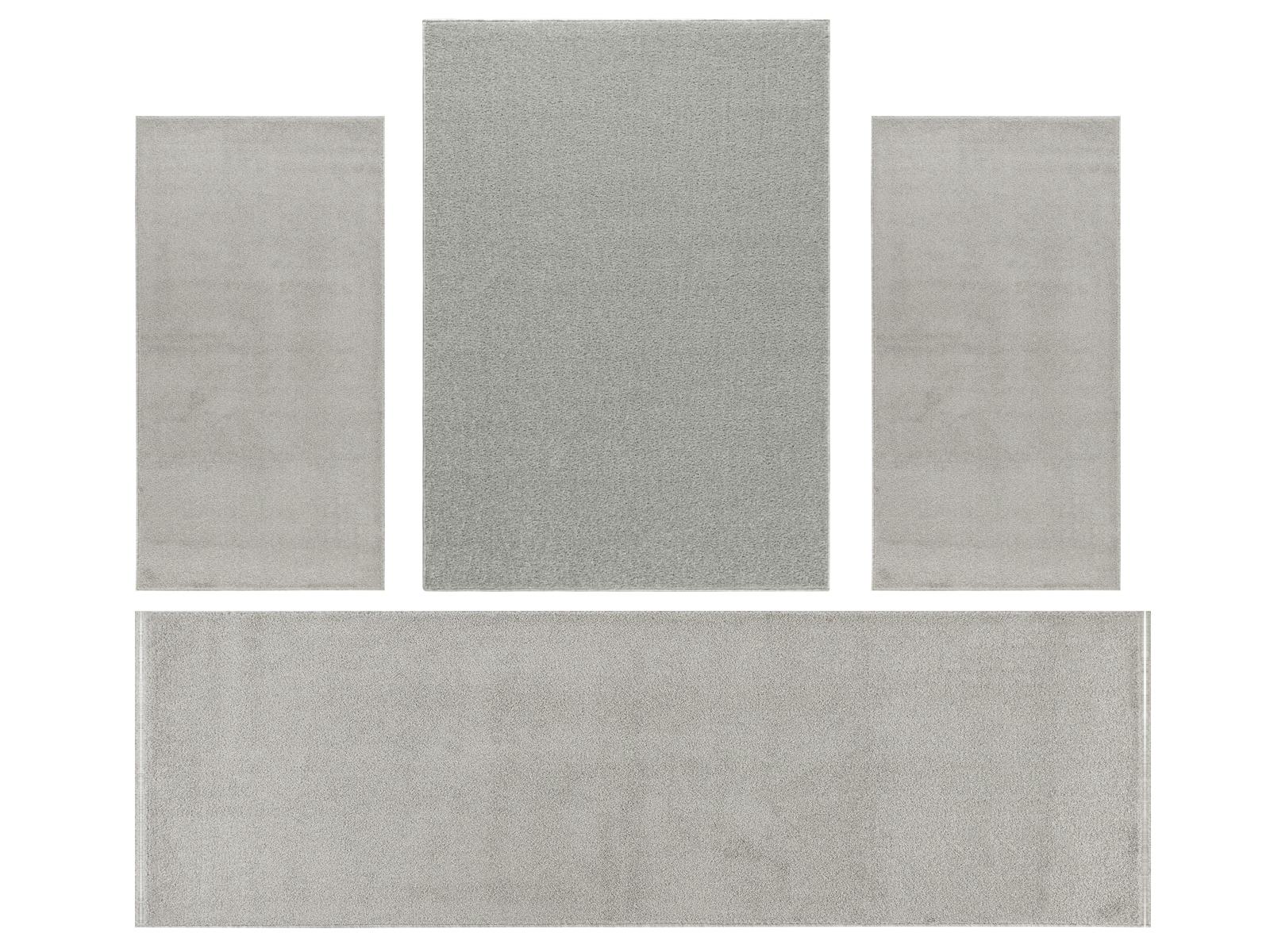 Das 4-teilige Set besteht aus einem großen Teppich (160x230 cm), zwei mittleren Teppichen (je 80x150 cm) und einem Läufer (80x250 cm). Der große Teppich dient als zentrales Highlight im Wohnzimmer, die mittleren Modelle ergänzen Schlaf- oder Essbereiche und der Läufer bringt Stil und Wärme in Flure oder Eingangsbereiche. Maße: 1 × 160×230 cm, 2 × 80×150 cm, 1 × 80×250 cm.