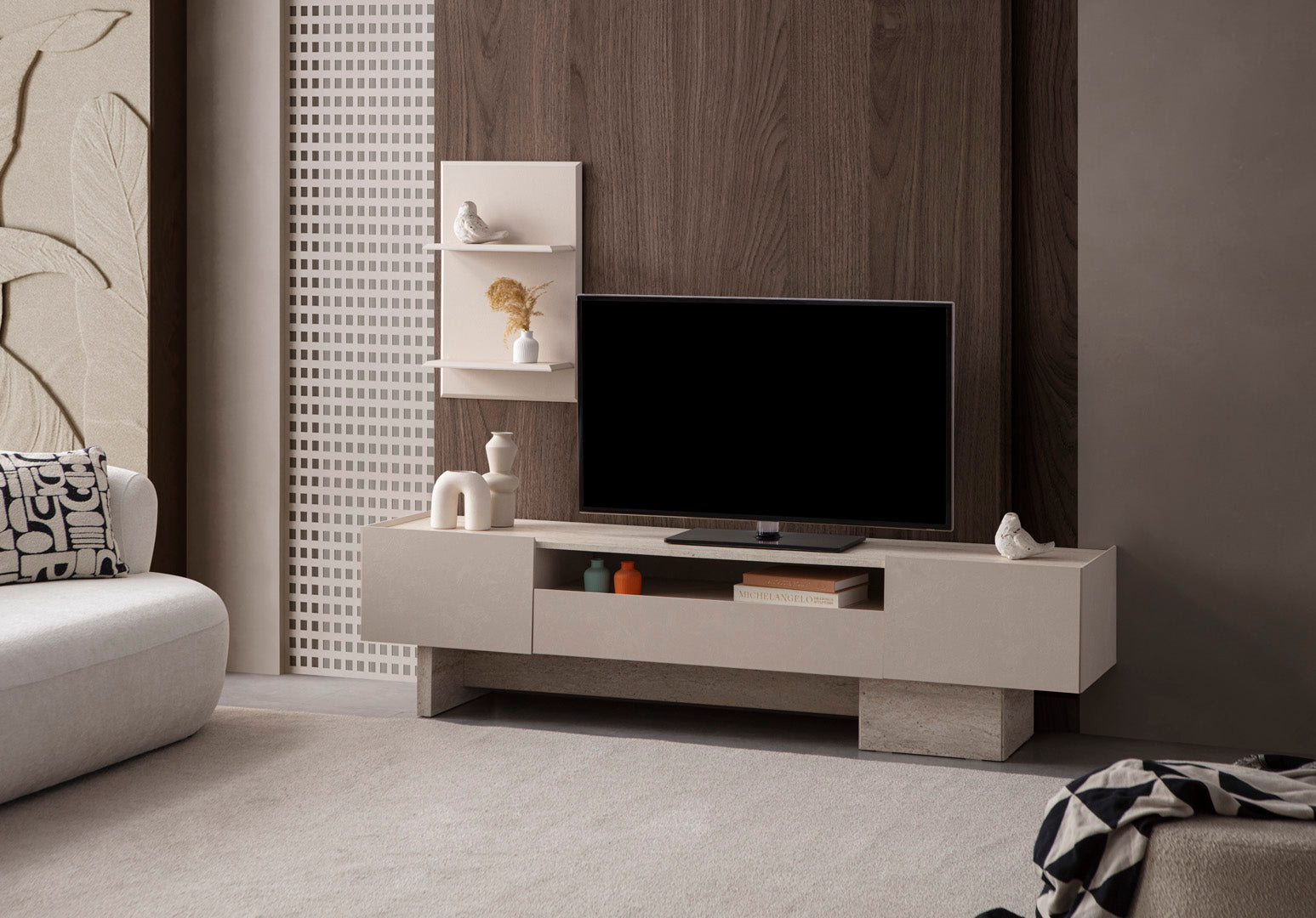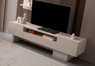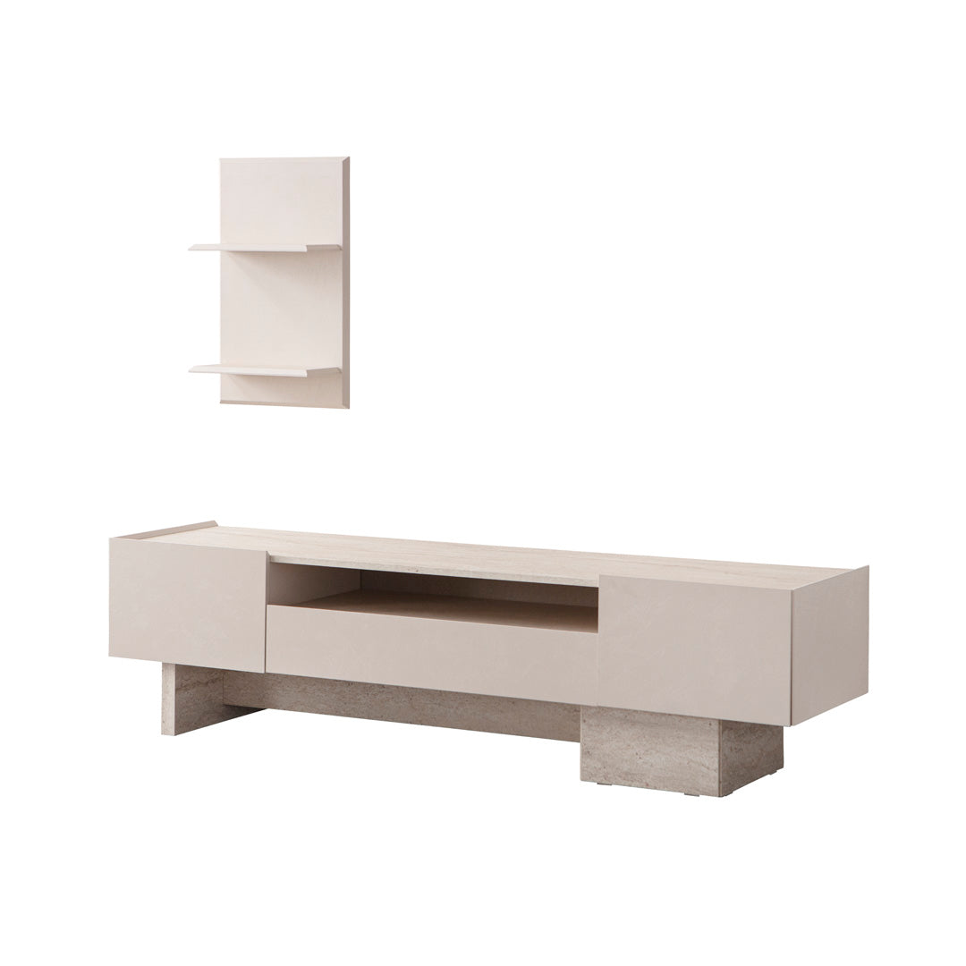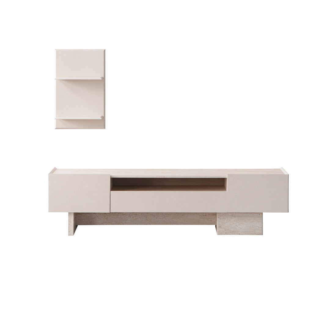 TV-Wohnwand-Set bestehend aus einem bodennahen Lowboard mit seitlich versetzten Standfüßen in Steinoptik und einem wandmontierten Regalpaneel mit zwei Ablageflächen. Das Lowboard verfügt über zwei geschlossene Fächer und ein offenes Mittelfach, das zur Aufbewahrung oder Präsentation genutzt werden kann. Die Fronten sind glatt gehalten, ohne sichtbare Griffe. Die Farbgebung bewegt sich im Bereich von hellem Beige mit grauer Steinstruktur im Sockelbereich. Das wandmontierte Regalpaneel ist flächig aufgebaut und fügt sich in die reduzierte Gesamtgestaltung ein.