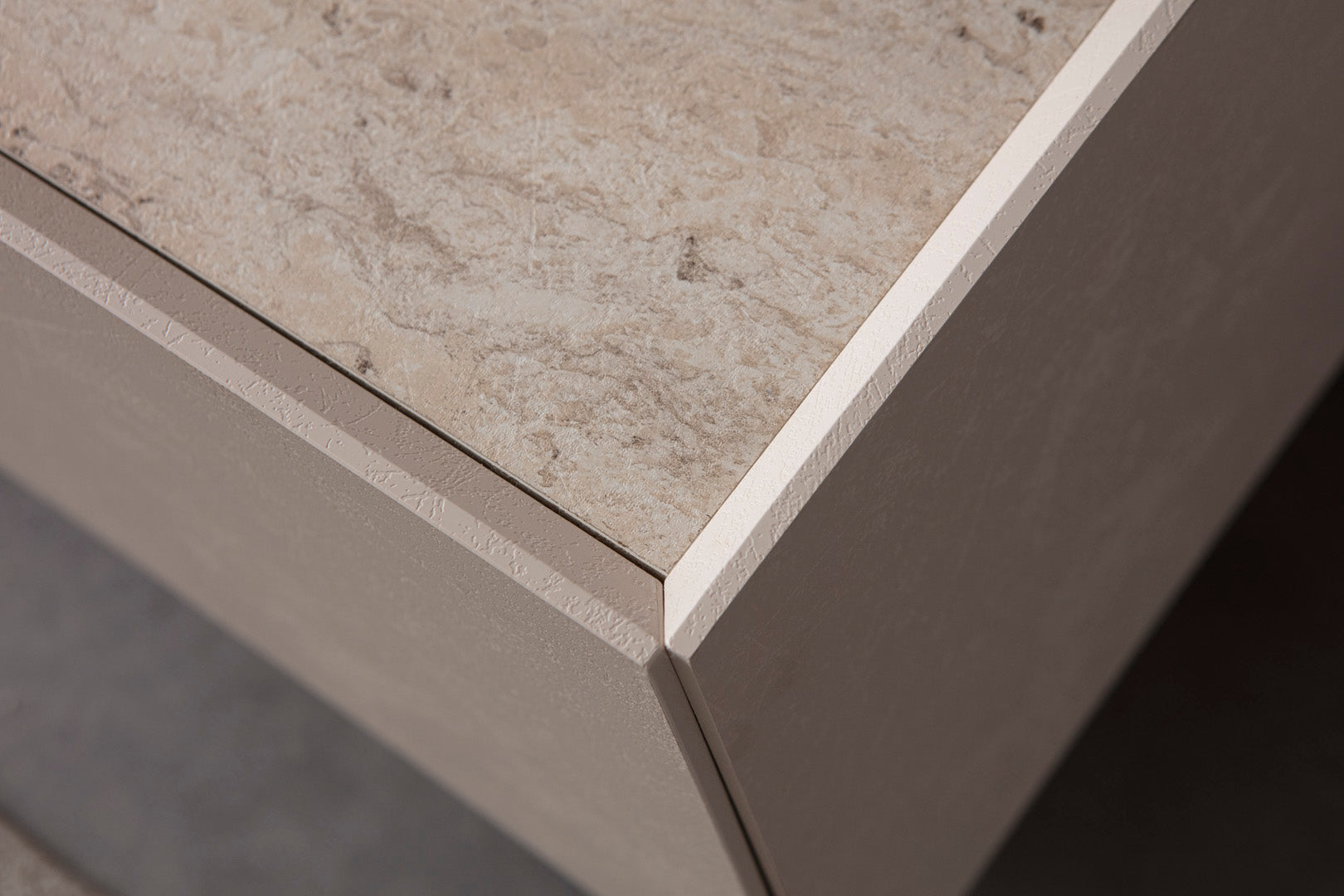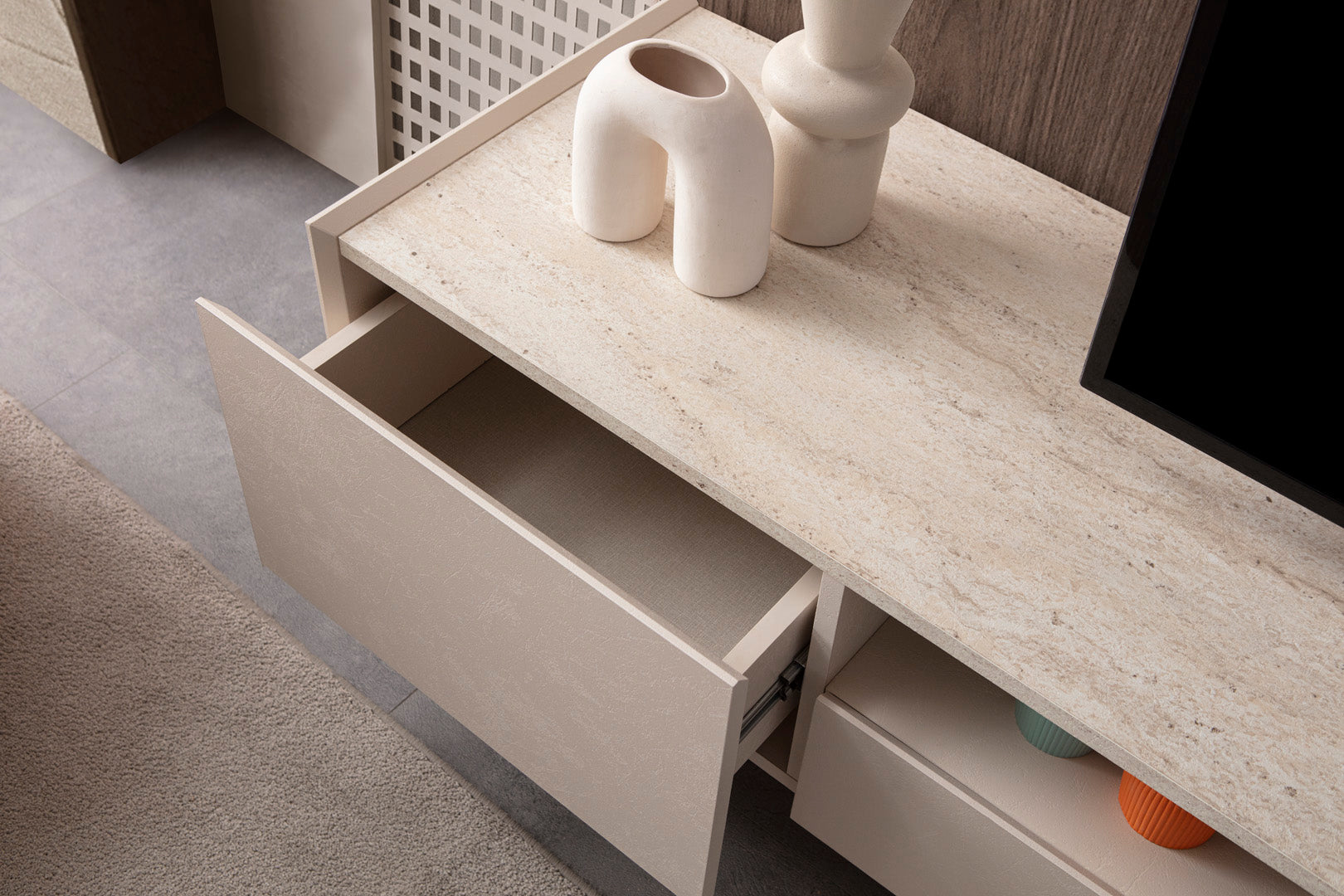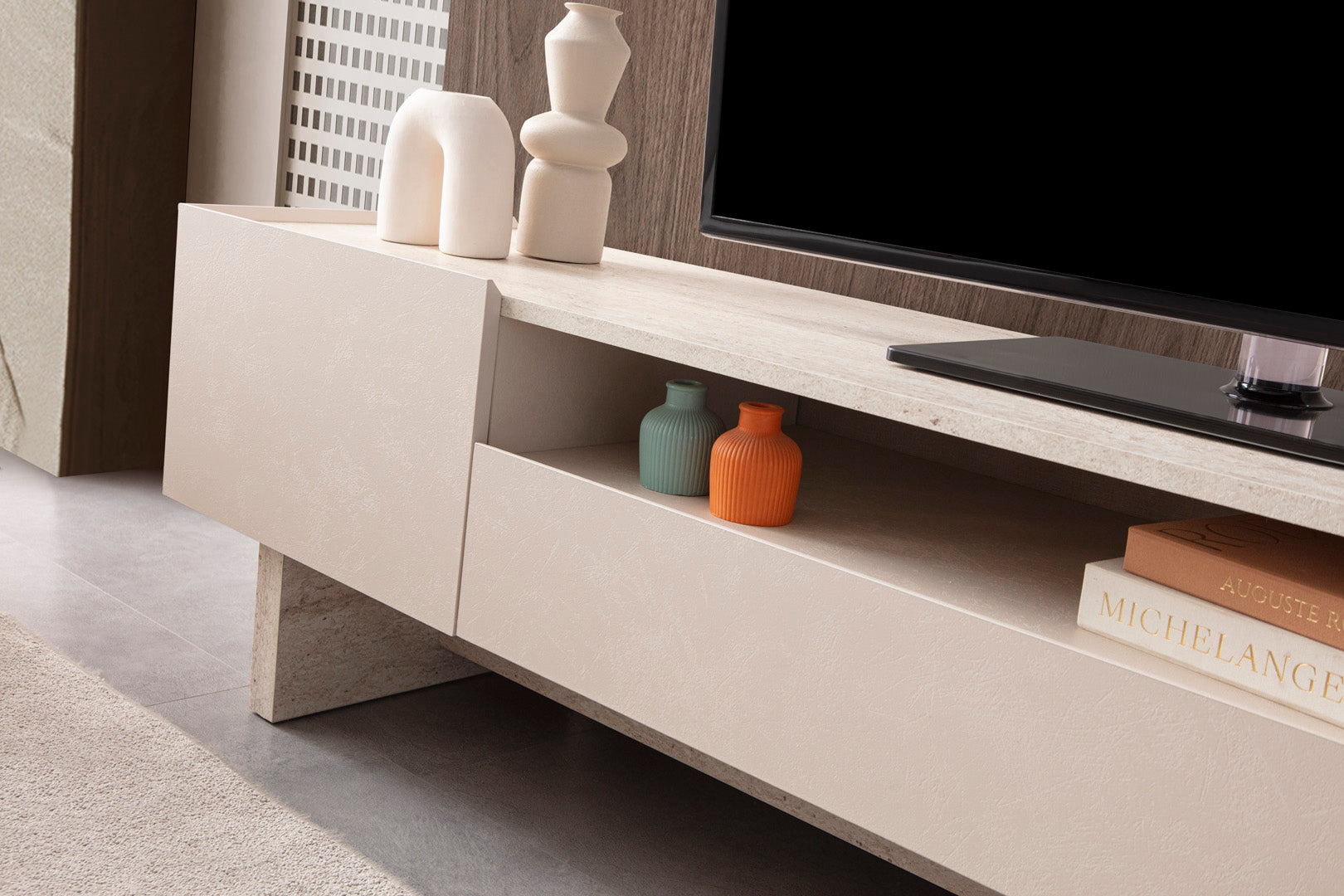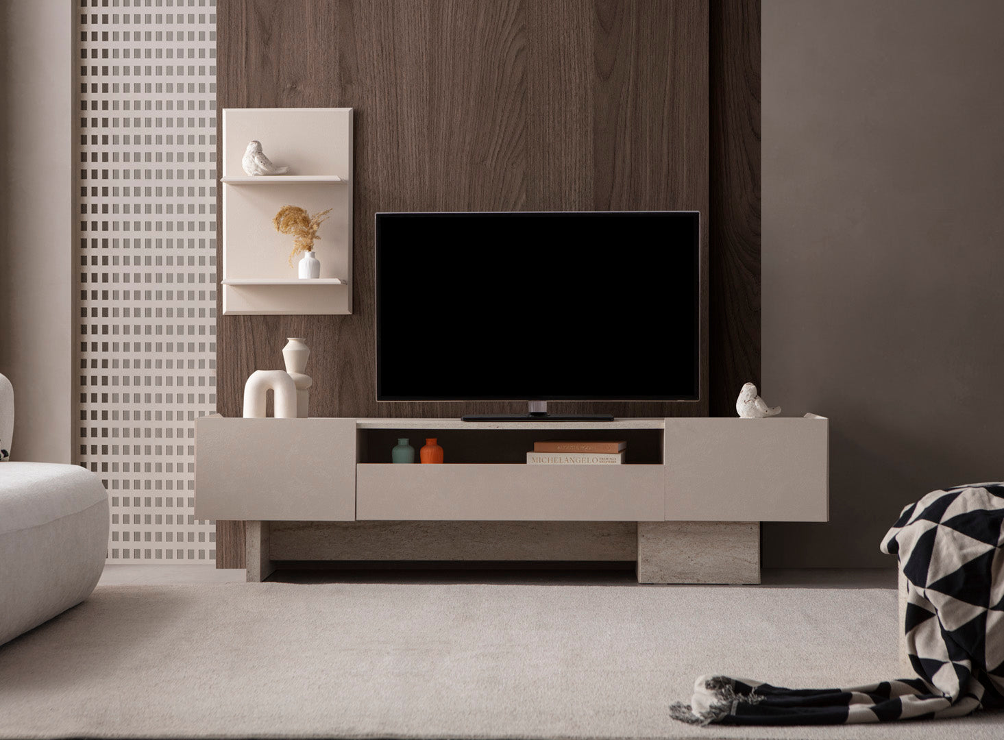 TV-Wohnwand-Set bestehend aus einem bodennahen Lowboard mit seitlich versetzten Standfüßen in Steinoptik und einem wandmontierten Regalpaneel mit zwei Ablageflächen. Das Lowboard verfügt über zwei geschlossene Fächer und ein offenes Mittelfach, das zur Aufbewahrung oder Präsentation genutzt werden kann. Die Fronten sind glatt gehalten, ohne sichtbare Griffe. Die Farbgebung bewegt sich im Bereich von hellem Beige mit grauer Steinstruktur im Sockelbereich. Das wandmontierte Regalpaneel ist flächig aufgebaut und fügt sich in die reduzierte Gesamtgestaltung ein.
