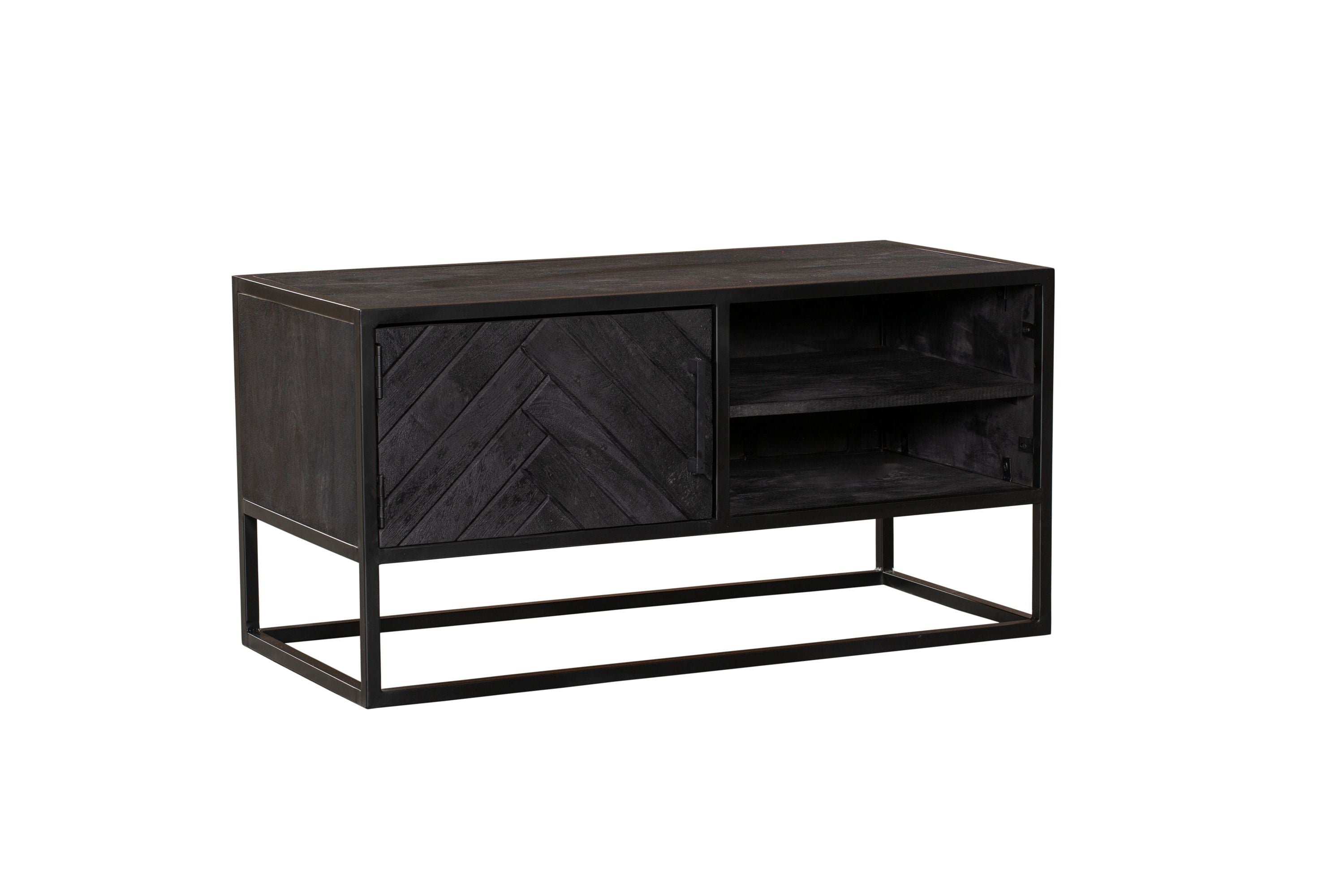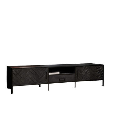 Das TV-Möbel Cosmopolitan ist aus sandgestrahltem Mangoholz gefertigt, wobei der Metallrahmen und die Metallgriffe mit einem eleganten schwarzen Lack behandelt sind. Dieses Modell ist mit vier T üren, einer Schublade und einem offenen Fach ausgestattet. Das Holz ist mit einem ansprechenden Fischgrätenmuster eingelegt und in Schwarz lackiert. Abmessungen Breite: 240/210/180/165/145/100 cm Tiefe: 45 cm Höhe: 50 cm Pflegehinweis: Mit einem leicht feuchten Tuch abwischen.