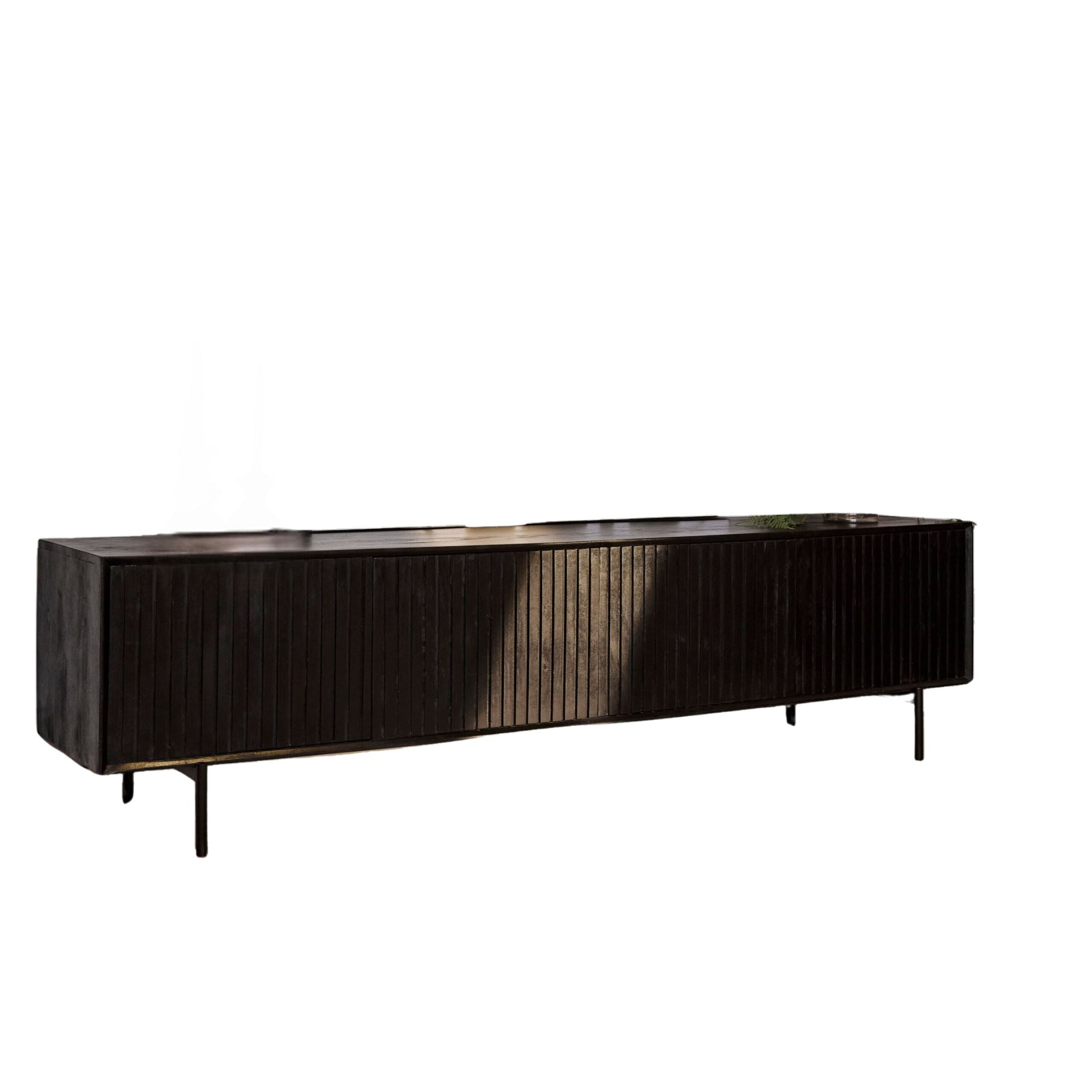 Das TV-Möbel 'Ellison' ist aus Mangoholz gefertigt, wobei das Metallgestell und die Griffe schwarz lackiert sind. Dieses Modell ist mit vier T üren ausgestattet, die ein vertikales Lamellenmuster aufweisen und in schwarzem Lack gehalten sind. Hinweis:Abmessungen Breite: 210 cm Tiefe: 45 cm Höhe: 55 cmAbmessungen Breite: 165 cm Tiefe: 45 cm Höhe: 55 cm Pflege: mit einem leicht feuchten Tuch abwischen.
