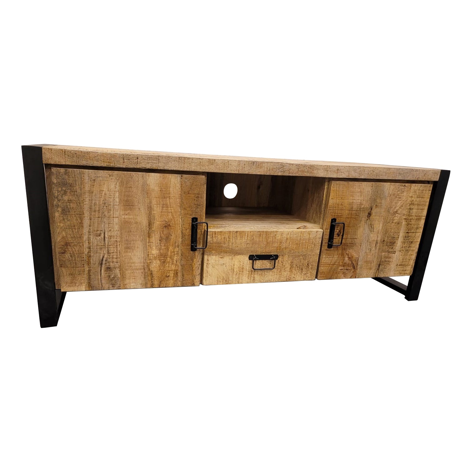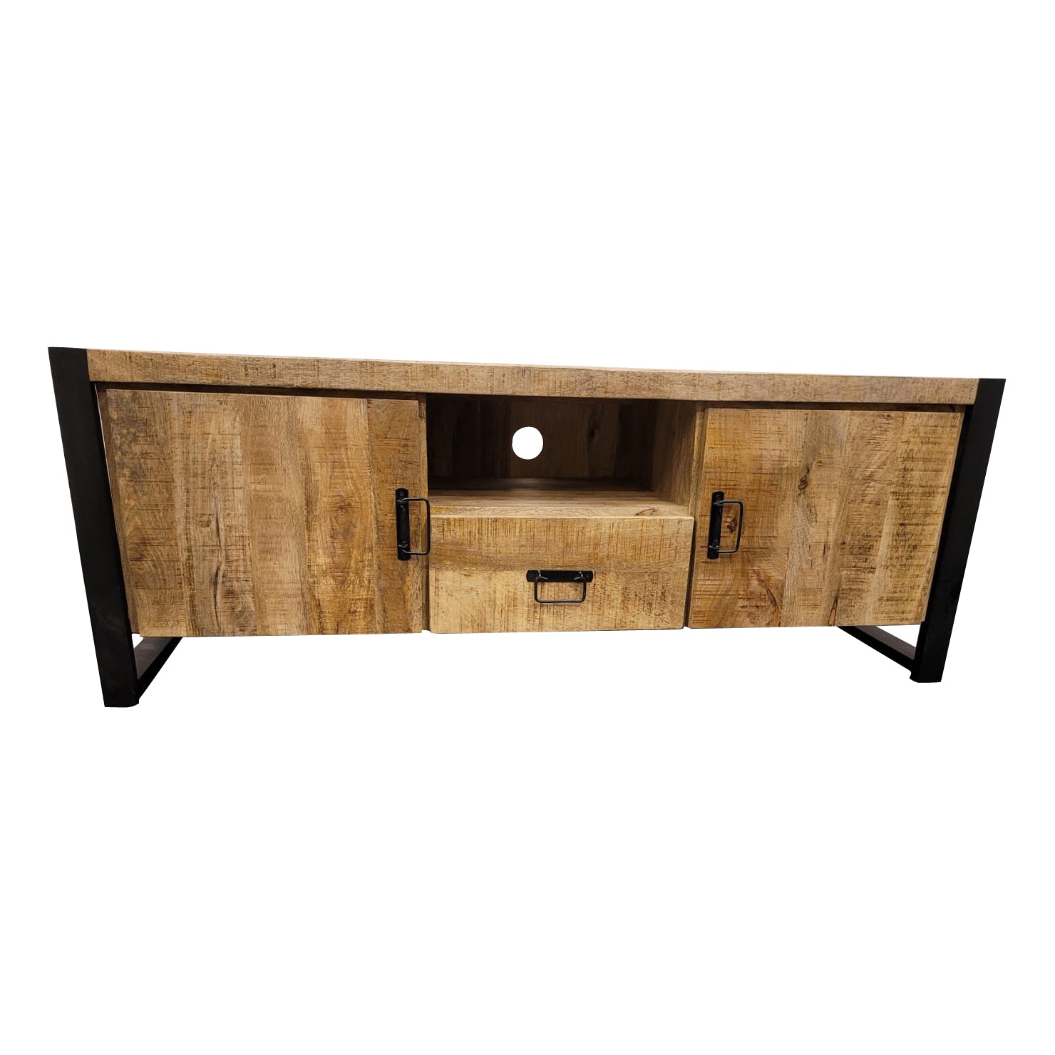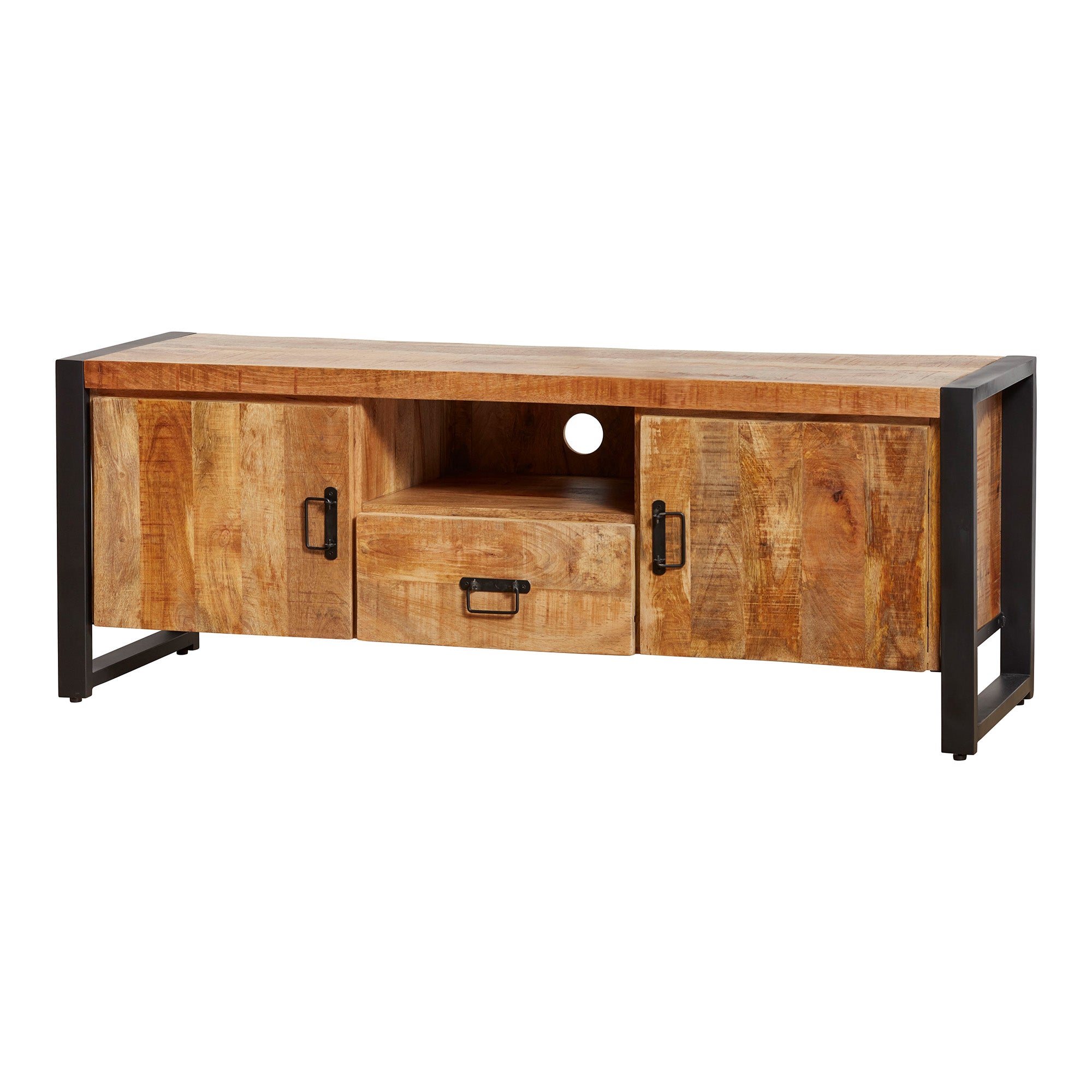 Das TV-Möbel aus unserer Zavan-Serie verf ügt über zwei T üren, ein offenes Fach und eine Schublade. Der Schrank ist aus massivem Mangoholz und Metall gefertigt. Das Mangoholz ist mit einer Schutzschicht versehen, während der Rahmen und die Griffe schwarz lackiert sind.Abmessungen: - Breite: 150 cm - Tiefe: 45 cm - Höhe: 55 cmPflegehinweise: Mit einem leicht feuchten Tuch abwischen.