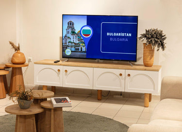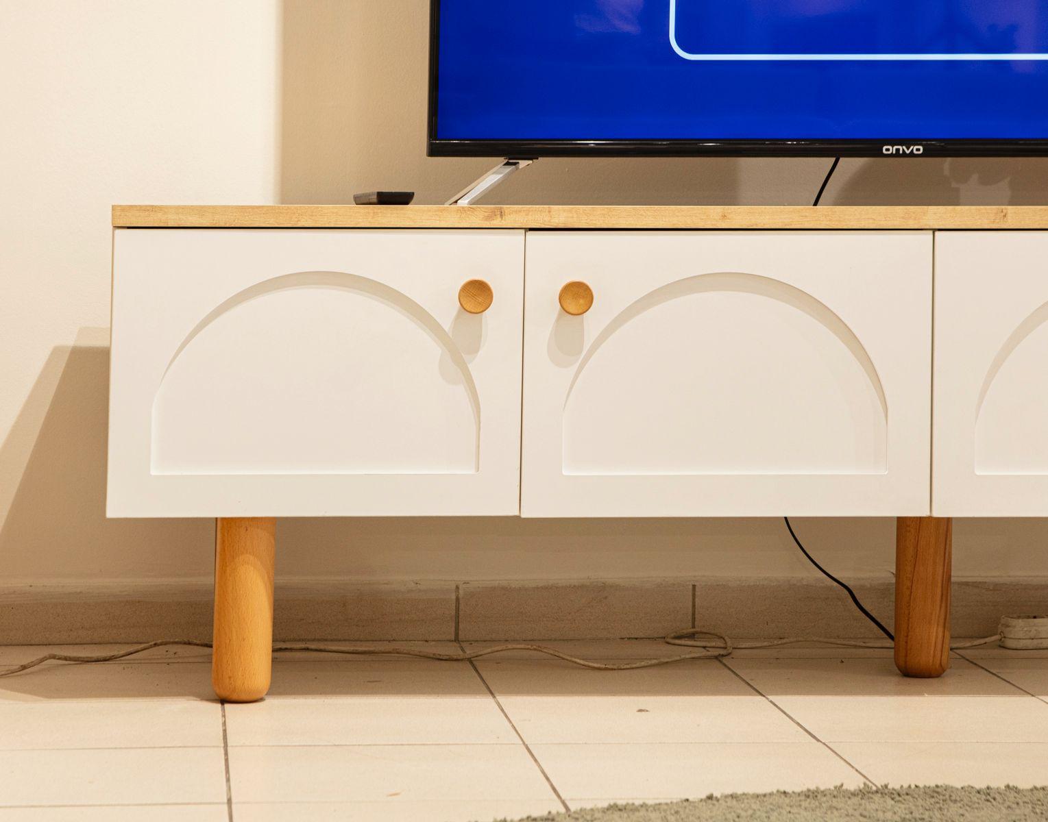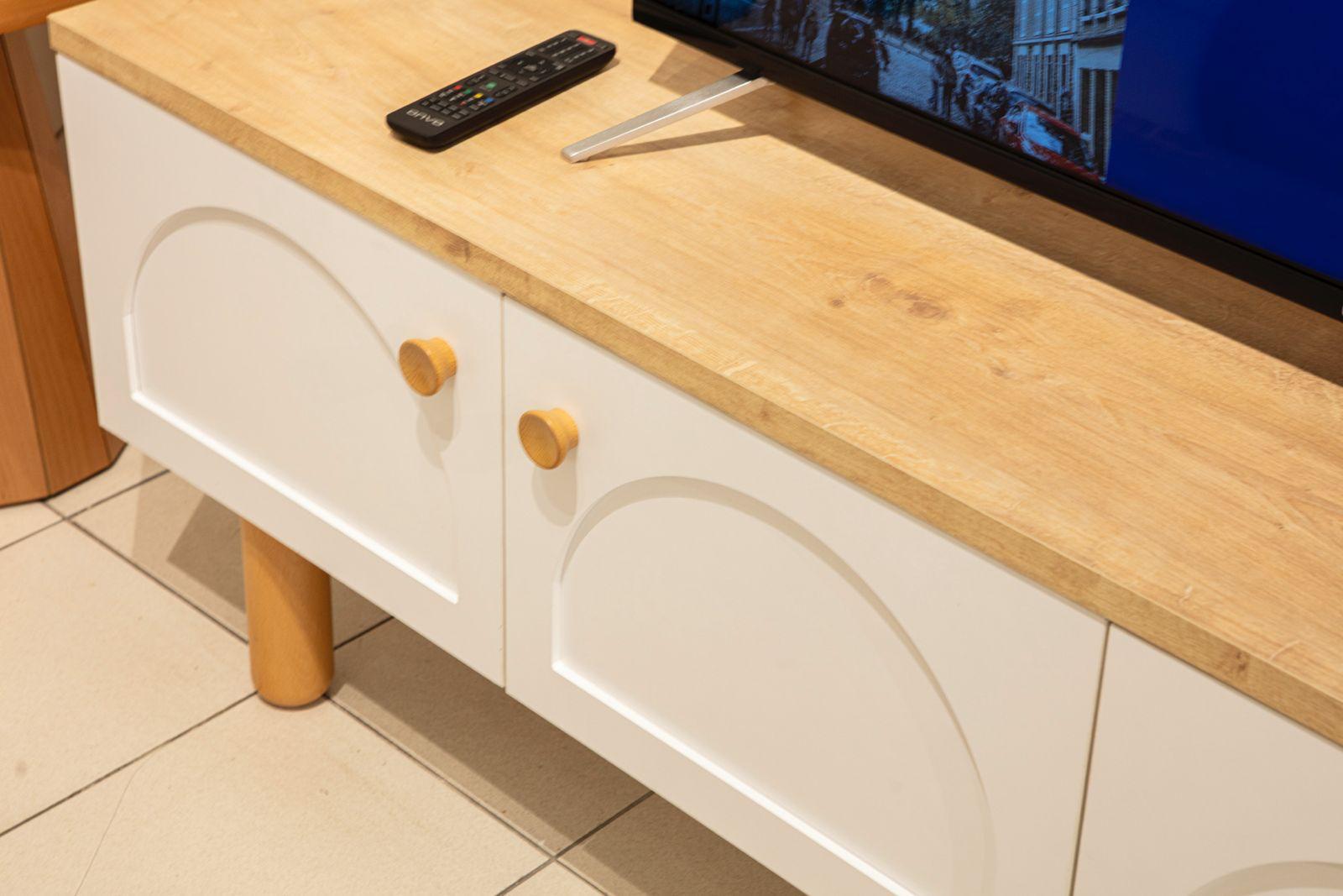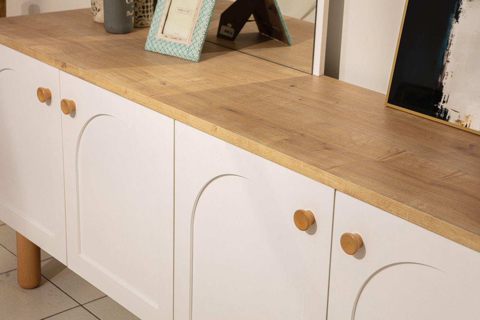 TV-Board mit vier symmetrischen Türen, die durch halbrunde Fräsungen und runde Holzknöpfe akzentuiert sind. Die Deckplatte ist in natürlicher Holzoptik gestaltet, ebenso wie die zylindrischen Standfüße. Die Kombination aus Weiß und hellem Holz verleiht dem Möbelstück eine ruhige, warme Ausstrahlung. Die Formensprache basiert auf klaren Linien und dezenten Rundungen. Die Fronten sind flächenbündig gestaltet und ohne sichtbare Griffe ausgeführt, lediglich mit dezenten Knopfakzenten.