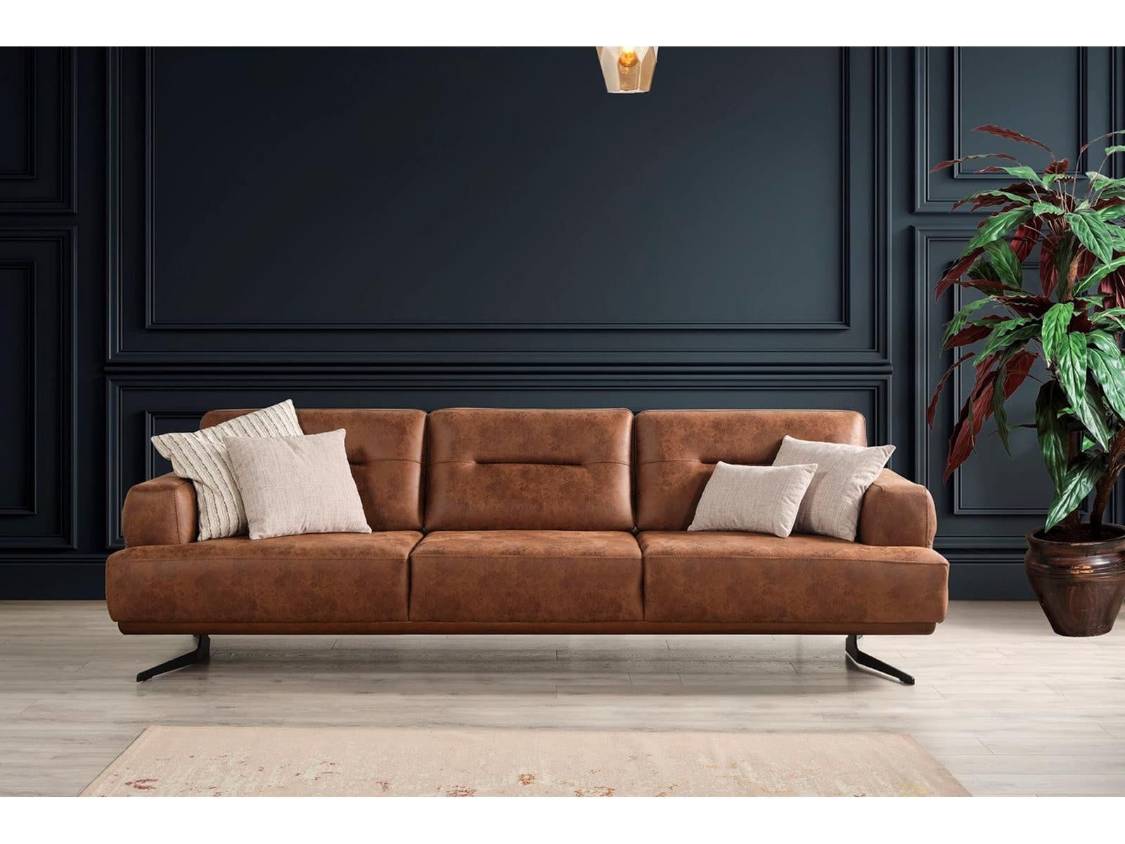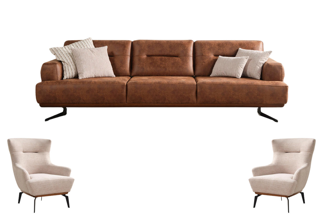 Das Duru-Lite Sofa Set verbindet modernes Design mit einer harmonischen Farbkombination. Der großzügige 4-Sitzer in Cognac-Braun wirkt edel und einladend, während der 3-Sitzer und der Sessel in elegantem Beige-Stoff Leichtigkeit und Wohnlichkeit vermitteln. Die kontrastierenden Kissen in Beige und Braun unterstreichen die stilvolle Optik und schaffen ein wohnliches Ambiente. Schwarze Metallfüße sorgen für Stabilität und einen modernen Akzent.