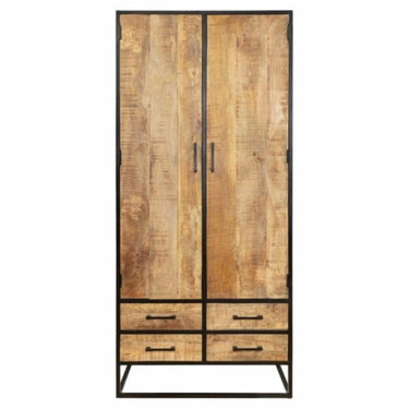 Die Kommode Devereux ist aus massivem Mangoholz gefertigt. Das massive Mangoholz ist mit einem transparenten Lack behandelt, während der schwarze Metallrahmen und die Metallgriffe mit einem schwarzen Lack versehen sind.Abmessungen Breite: 90 cm Tiefe: 40 cm Höhe: 200 cmPflege: mit einem leicht feuchten Tuch abwischen.