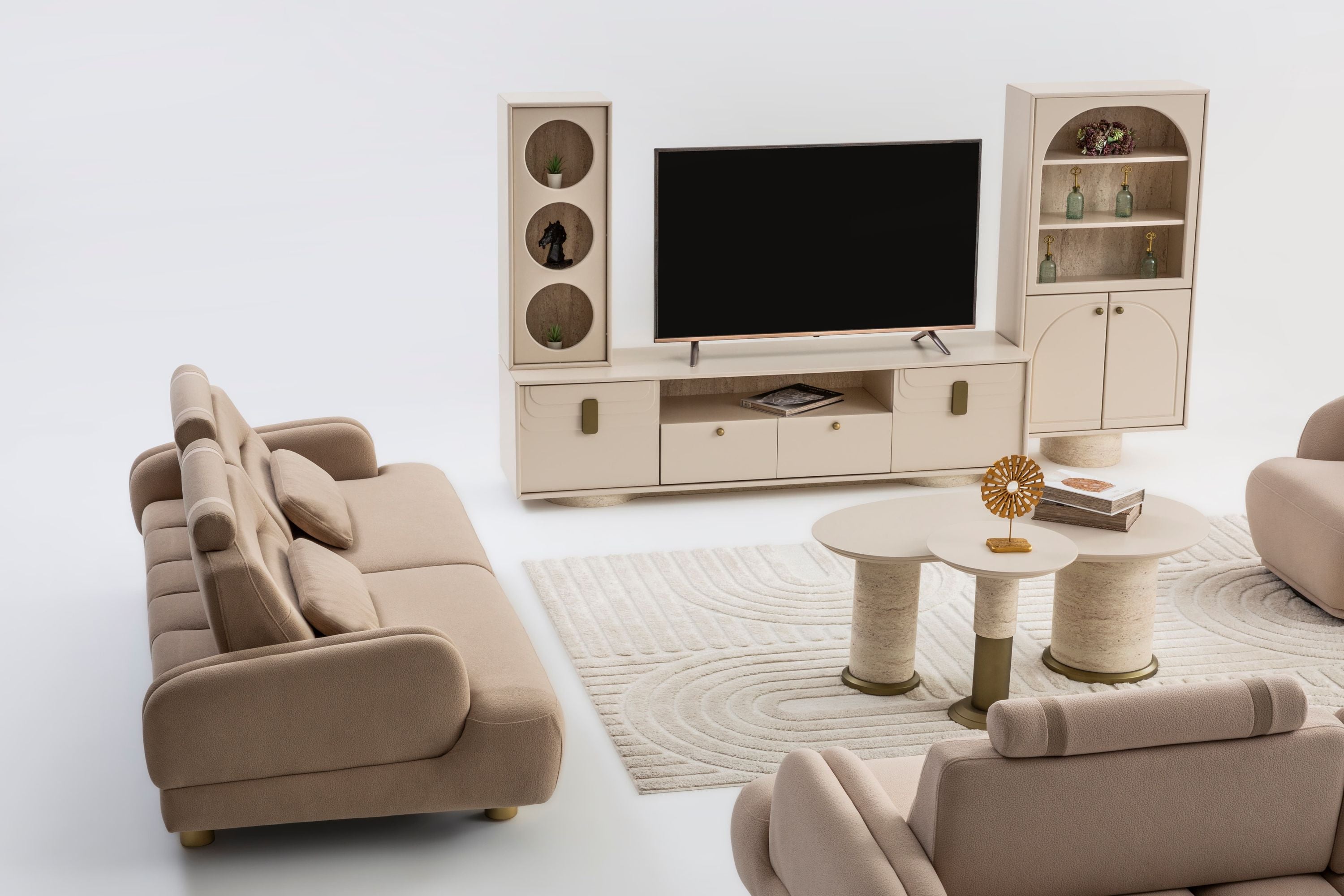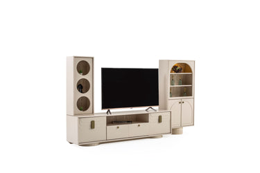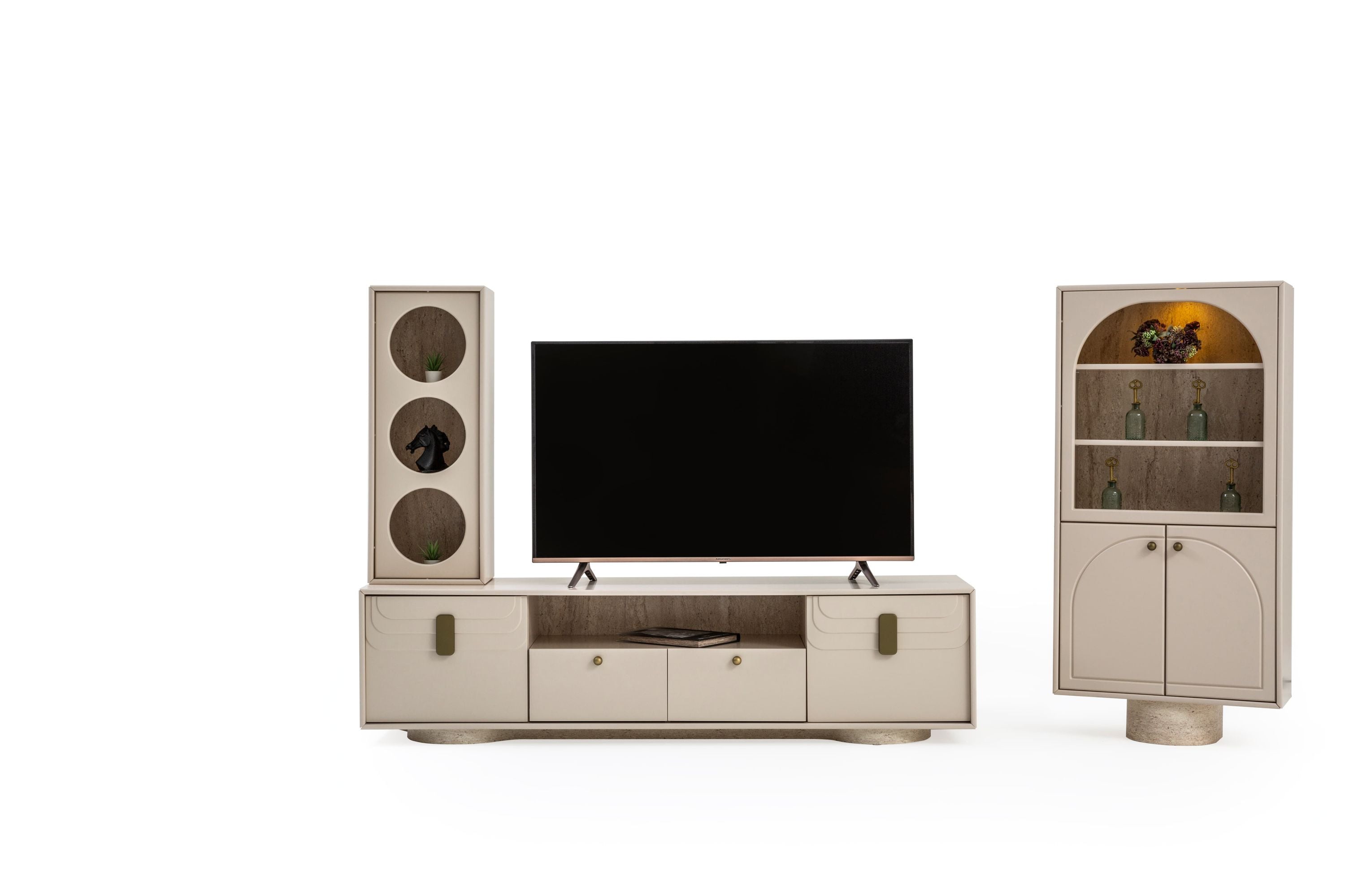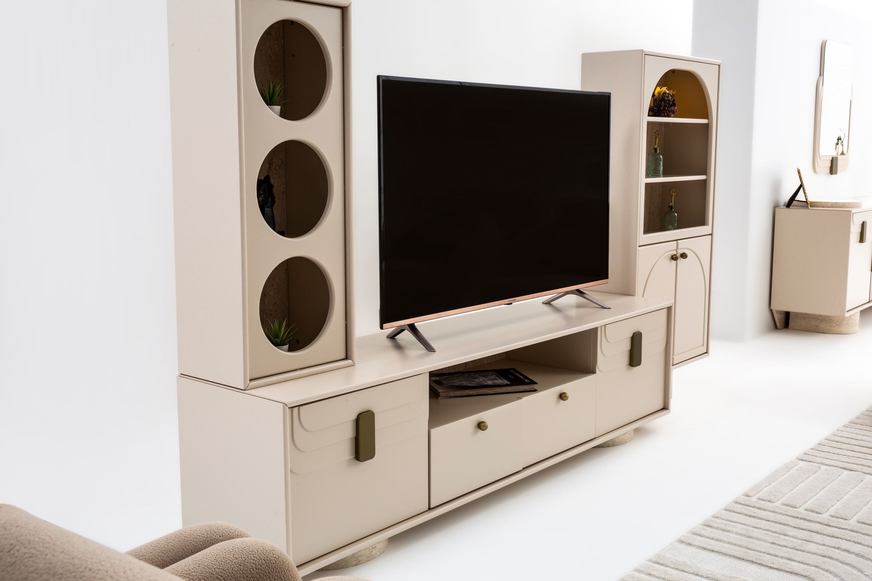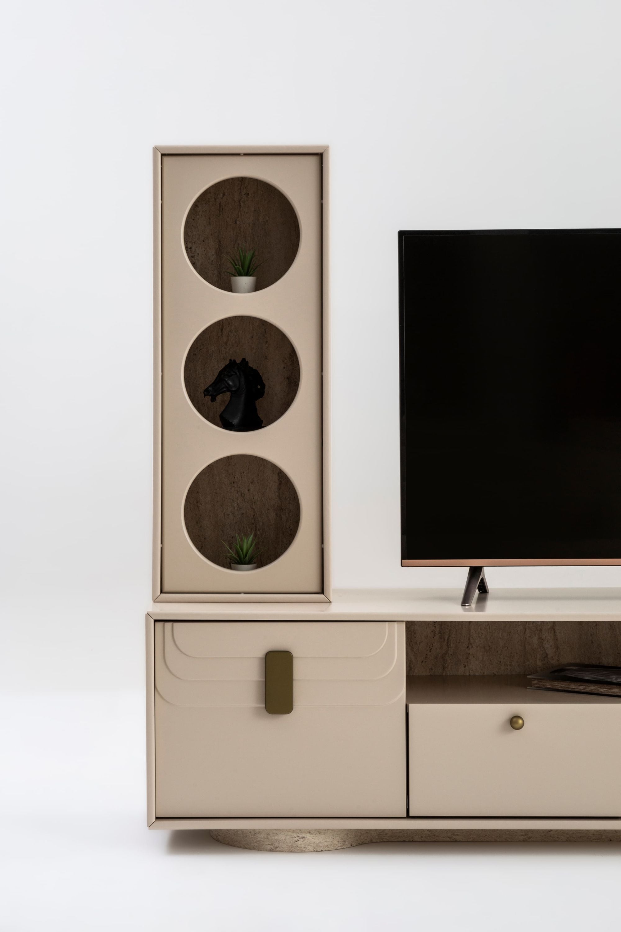 Dieses außergewöhnliche TV-Board überzeugt durch seine markante Formensprache und stilvolle Kombination aus Funktionalität und Design. Die runden Aussparungen in der linken Vitrine setzen dekorative Objekte perfekt in Szene, während die rechte Vitrine mit ihrer stimmungsvollen Beleuchtung eine wohnliche Atmosphäre schafft. Der cremefarbene Korpus und die strukturierten Fronten harmonieren mit der warmen Holzoptik der Rückwände. Praktische Fächer und Türen bieten ausreichend Stauraum für Mediengeräte, Kabel und Zubehör. Das Möbelstück verbindet organische Linien mit architektonischer Klarheit – ein Highlight für moderne Wohnräume.