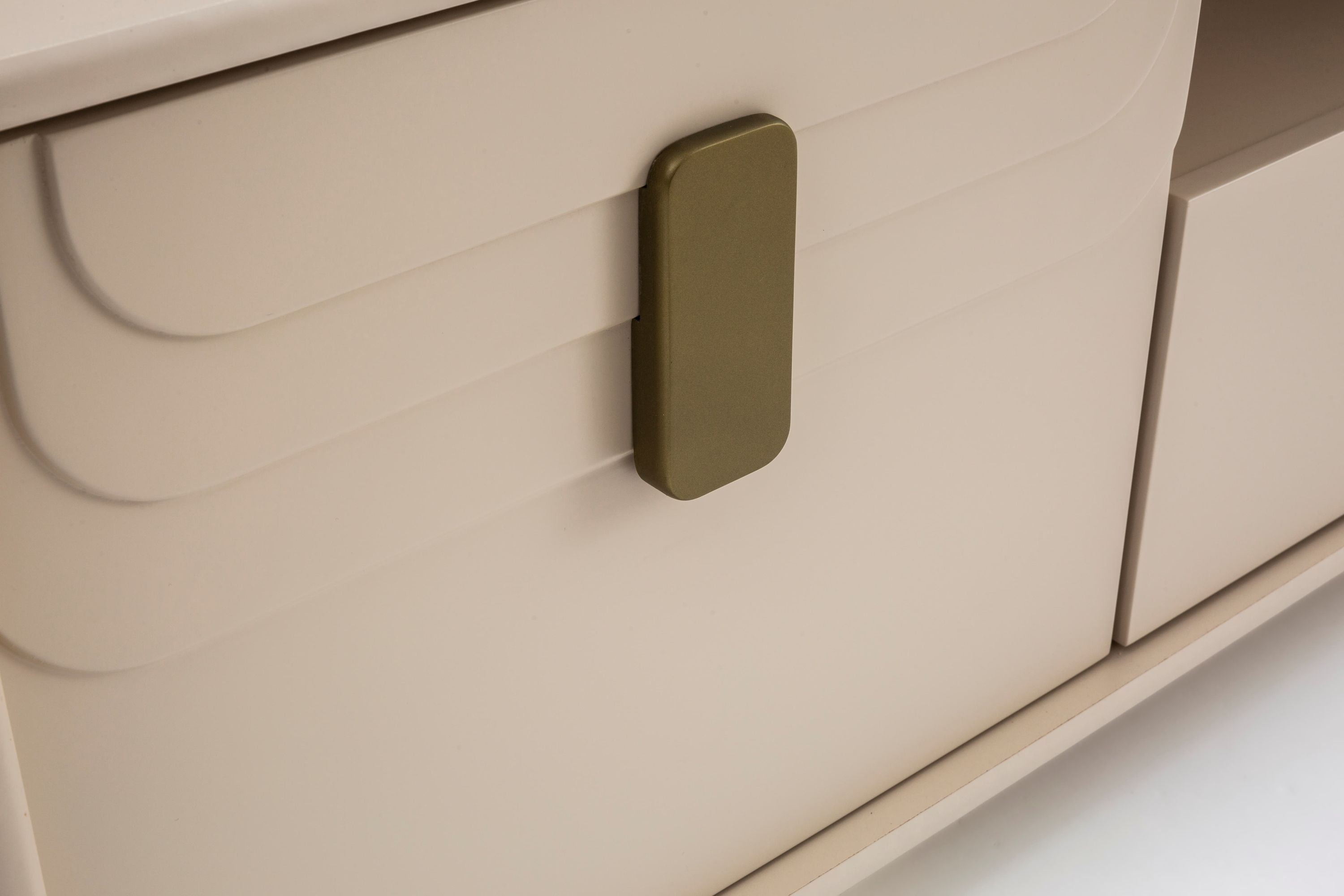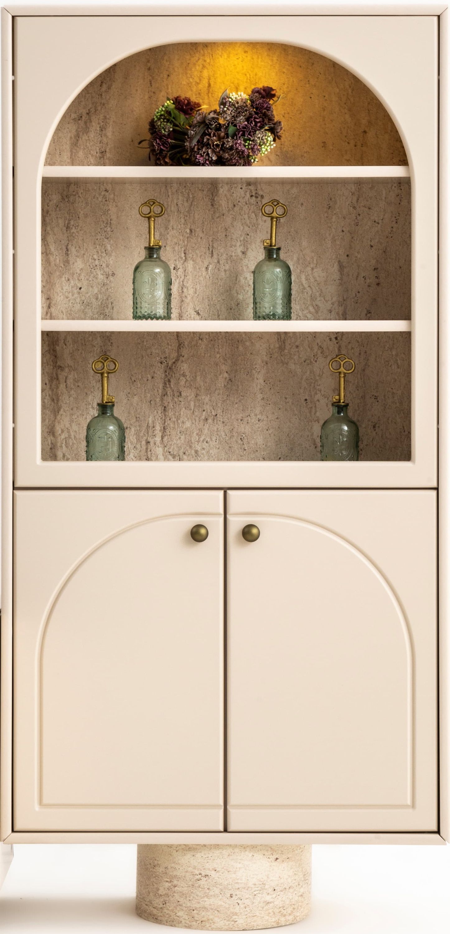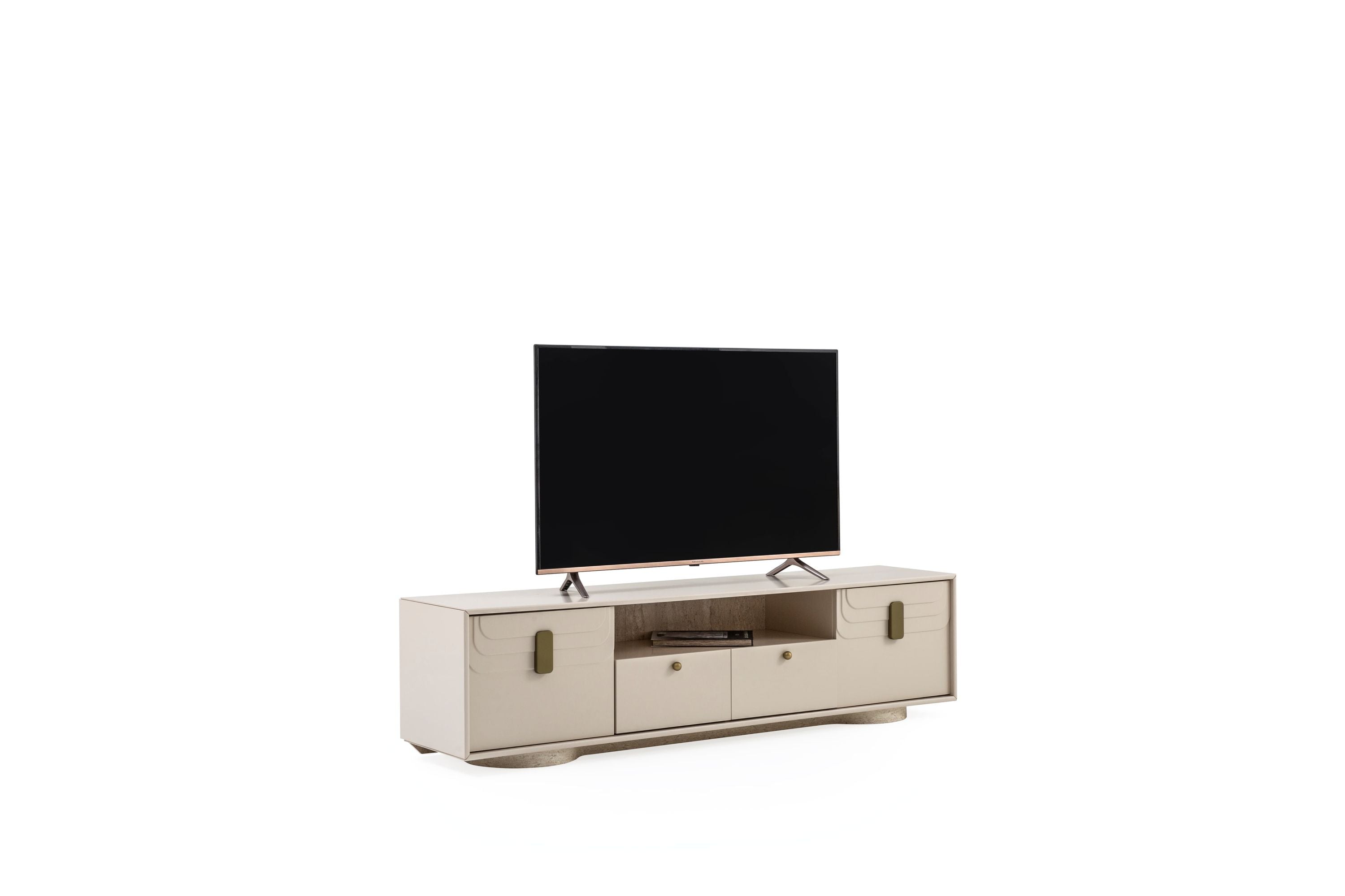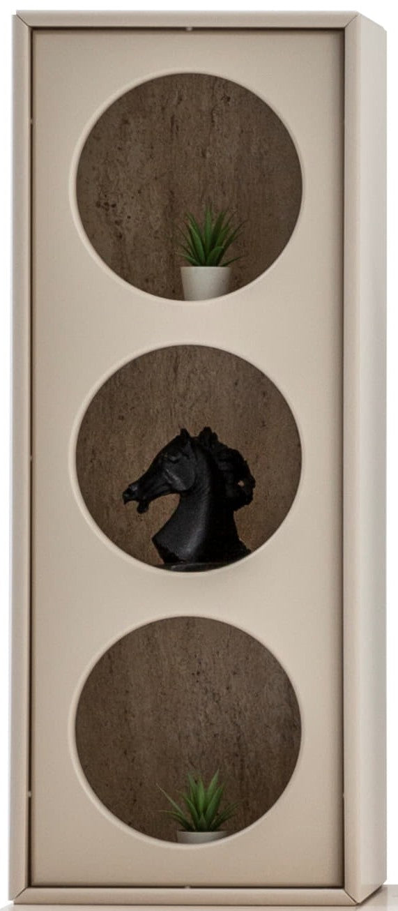 Dieses außergewöhnliche TV-Board überzeugt durch seine markante Formensprache und stilvolle Kombination aus Funktionalität und Design. Die runden Aussparungen in der linken Vitrine setzen dekorative Objekte perfekt in Szene, während die rechte Vitrine mit ihrer stimmungsvollen Beleuchtung eine wohnliche Atmosphäre schafft. Der cremefarbene Korpus und die strukturierten Fronten harmonieren mit der warmen Holzoptik der Rückwände. Praktische Fächer und Türen bieten ausreichend Stauraum für Mediengeräte, Kabel und Zubehör. Das Möbelstück verbindet organische Linien mit architektonischer Klarheit – ein Highlight für moderne Wohnräume.