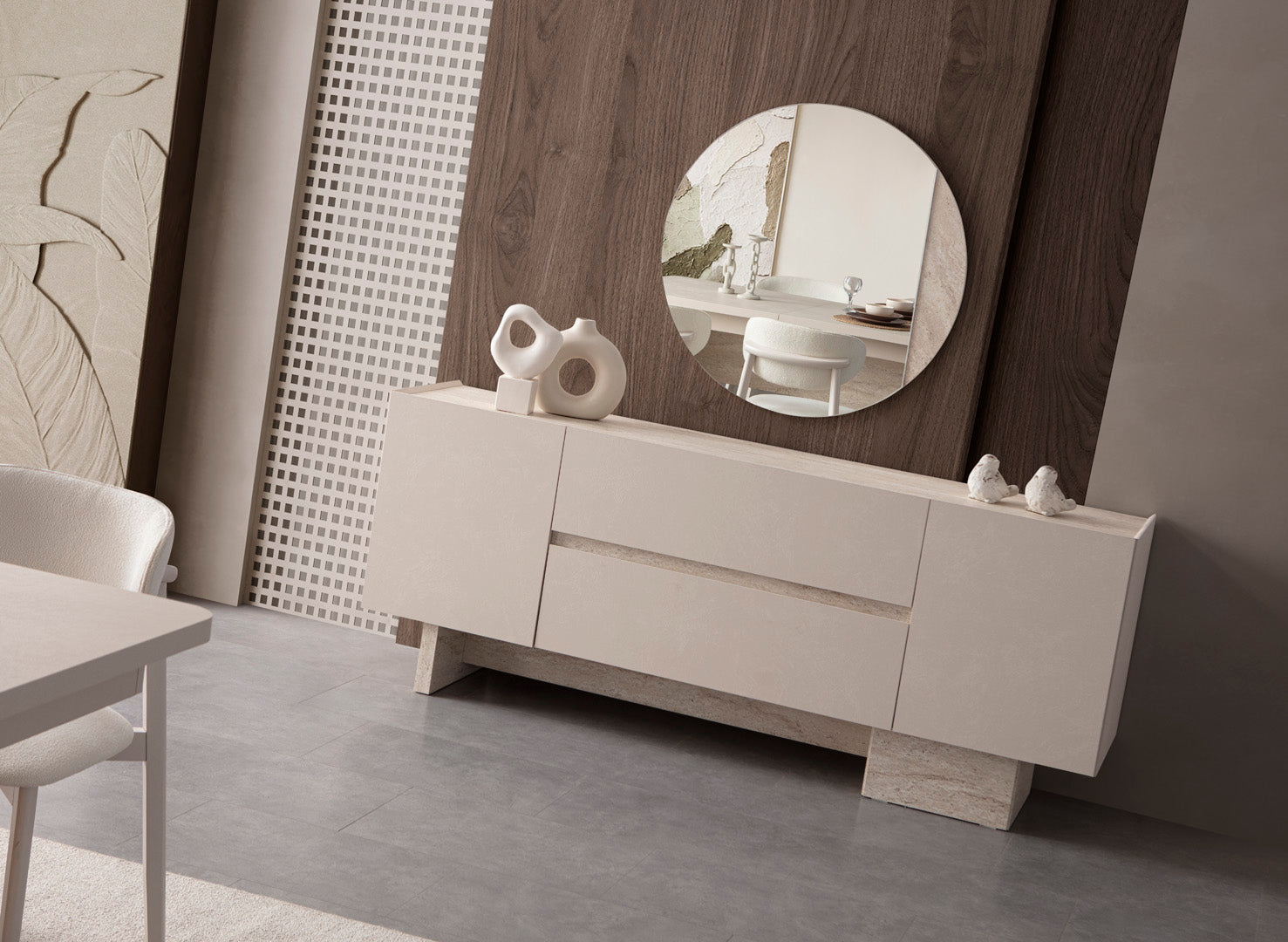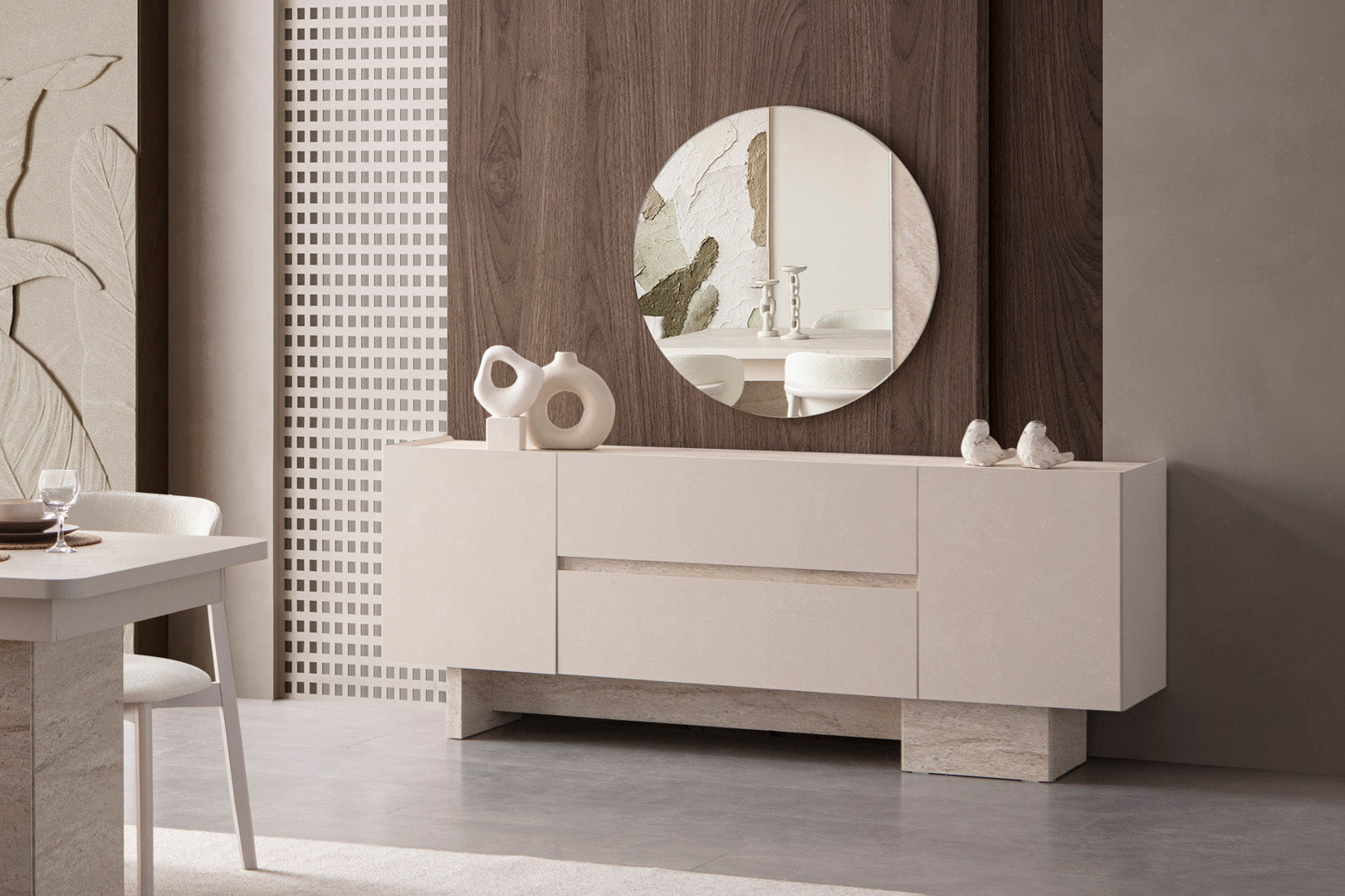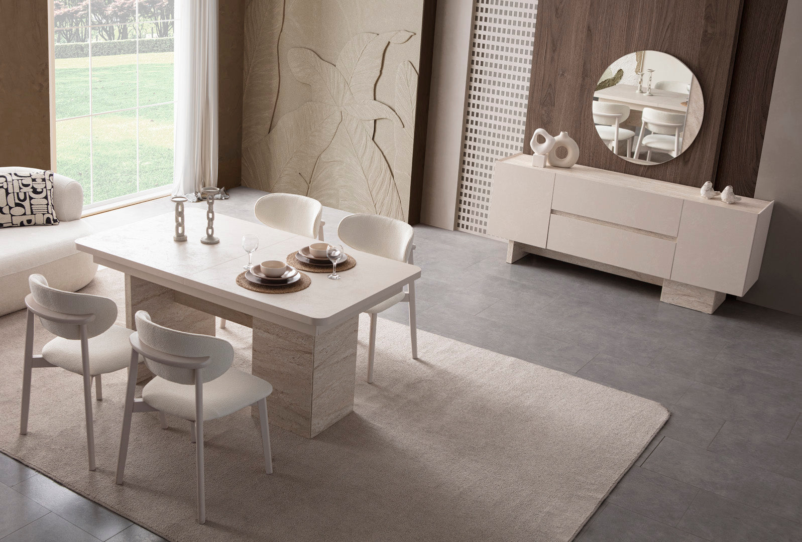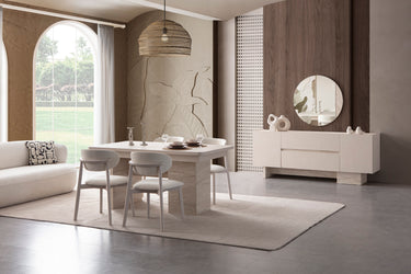 Der elegante Esstisch überzeugt mit einer großzügigen rechteckigen Tischplatte und stabilen Säulenfüßen, die modernes Understatement perfekt umsetzen. Das Sideboard bietet mit seinen strukturierten Fronten und den schlichten Holzgriffen großzügigen Stauraum und stilvolle Akzente. Die komfortablen Stühle mit weicher Polsterung und natürlichem Holzgestell sorgen für angenehmen Sitzkomfort und sind in verschiedenen Stoffarten und Farben möglich bestellbar.
