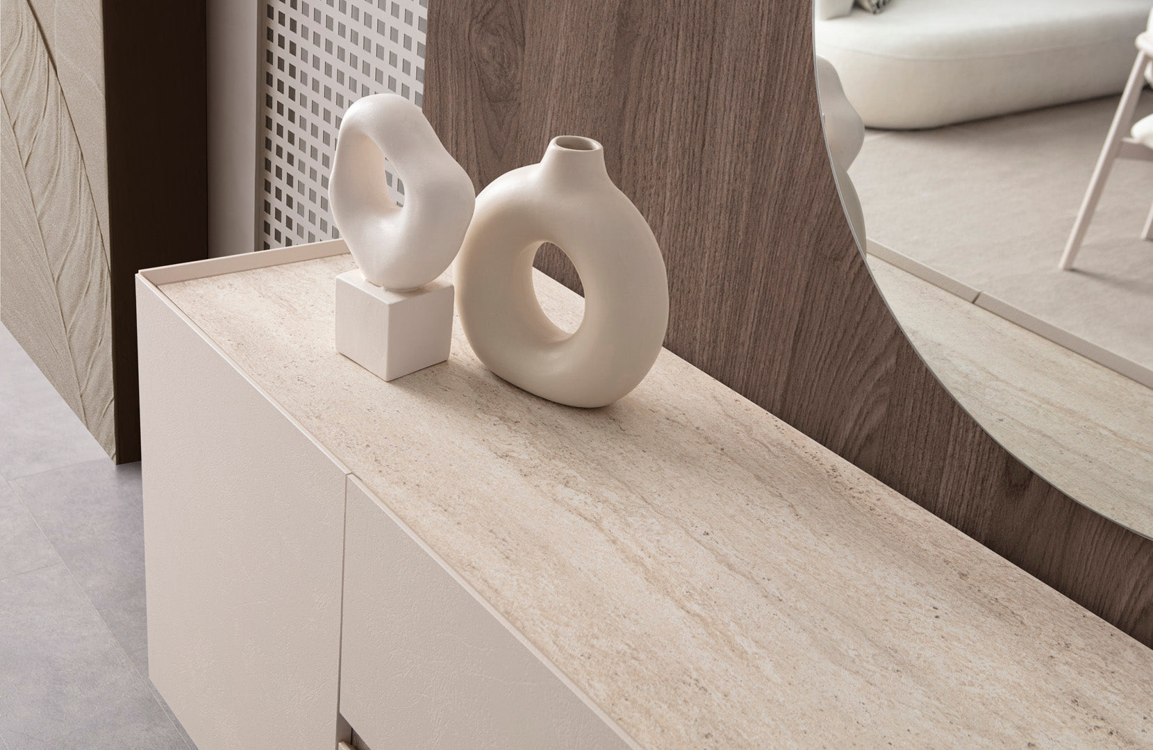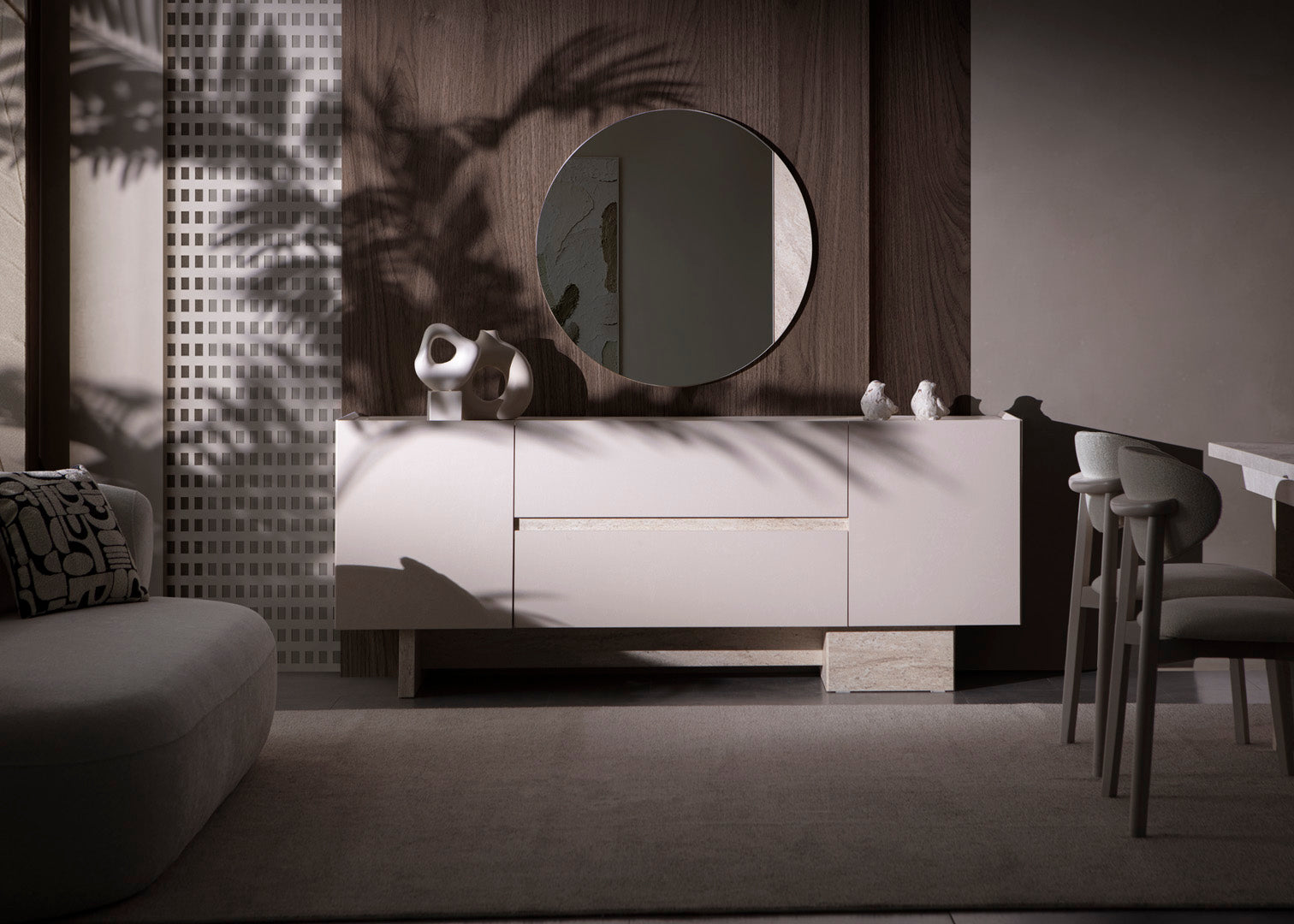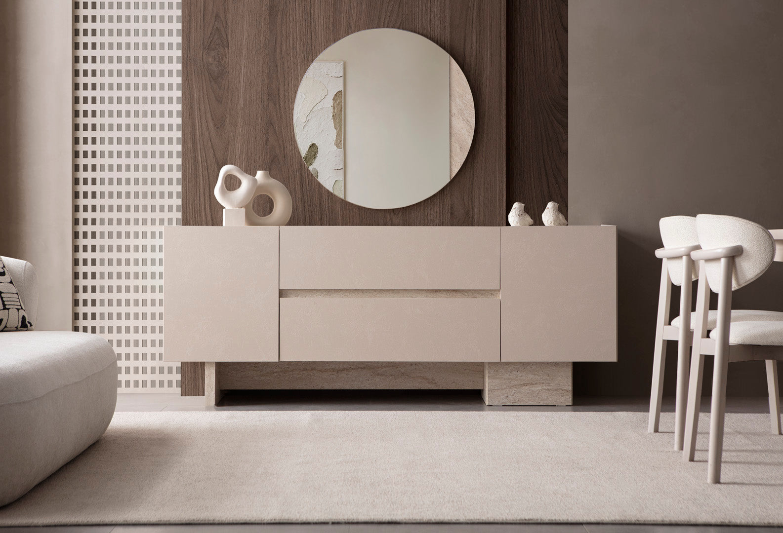 Der elegante Esstisch überzeugt mit einer großzügigen rechteckigen Tischplatte und stabilen Säulenfüßen, die modernes Understatement perfekt umsetzen. Das Sideboard bietet mit seinen strukturierten Fronten und den schlichten Holzgriffen großzügigen Stauraum und stilvolle Akzente. Die komfortablen Stühle mit weicher Polsterung und natürlichem Holzgestell sorgen für angenehmen Sitzkomfort und sind in verschiedenen Stoffarten und Farben möglich bestellbar.