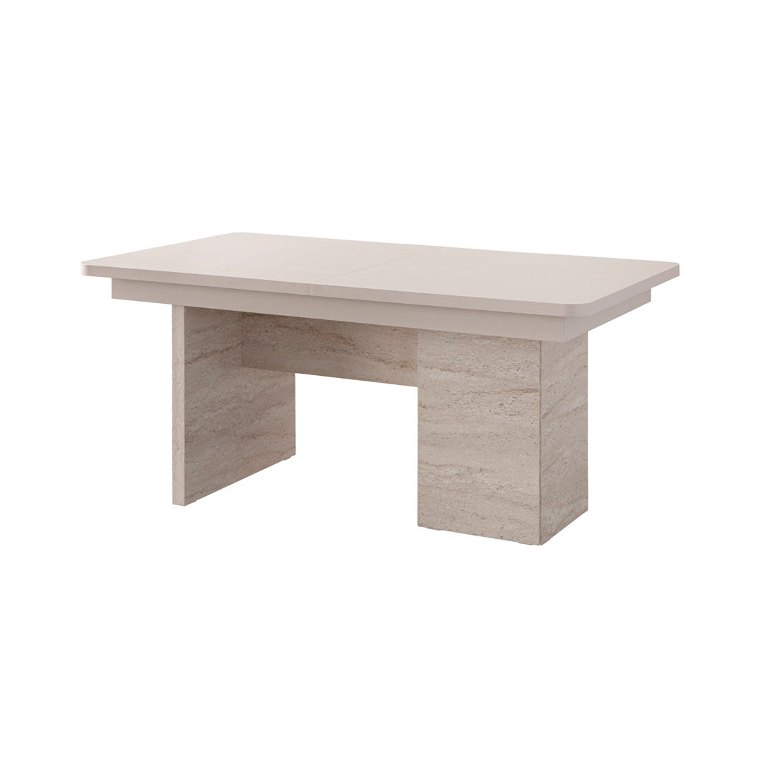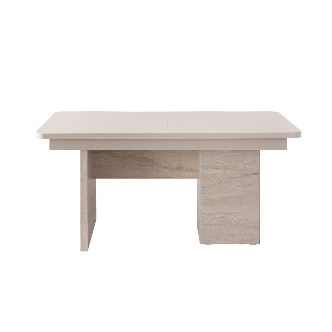 Gefertigt aus robustem MDF mit natürlicher Holzoptik und strapazierfähiger Stoffpolsterung. Die Farbkombination aus hellem Naturholz und sanftem Weiß schafft eine moderne und zugleich warme Atmosphäre, die jedem Essbereich zeitlose Eleganz verleiht.