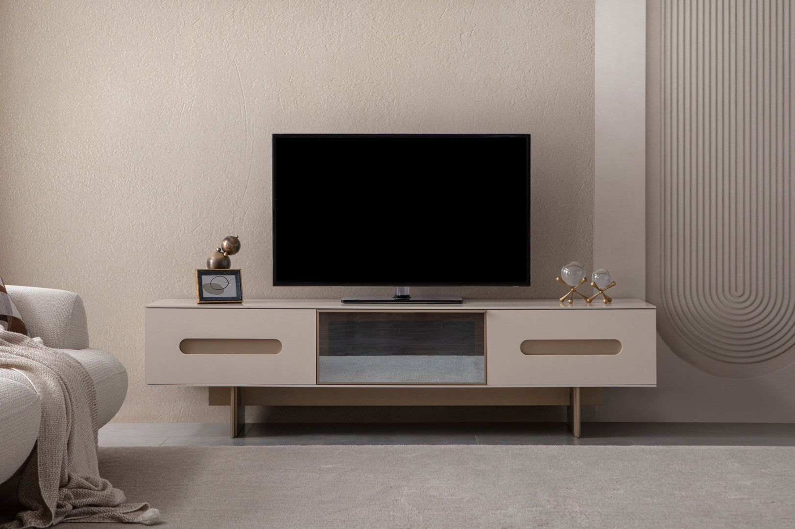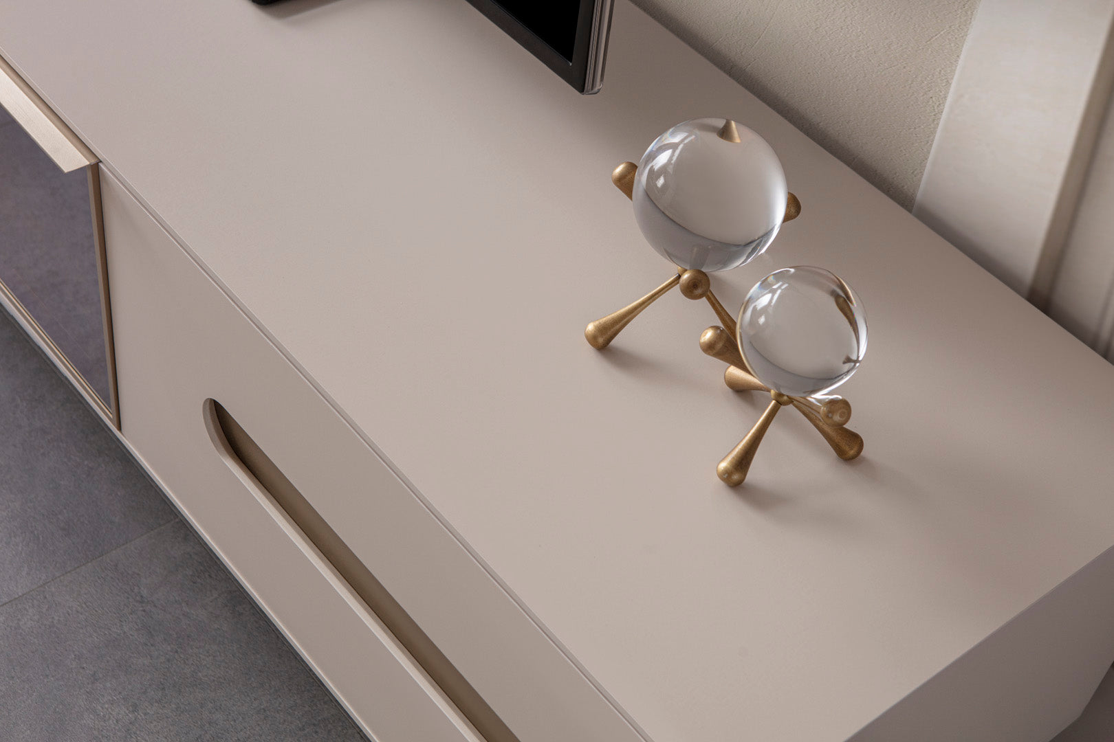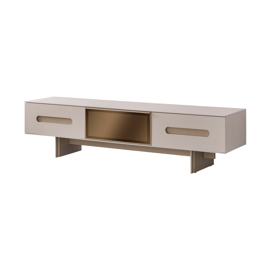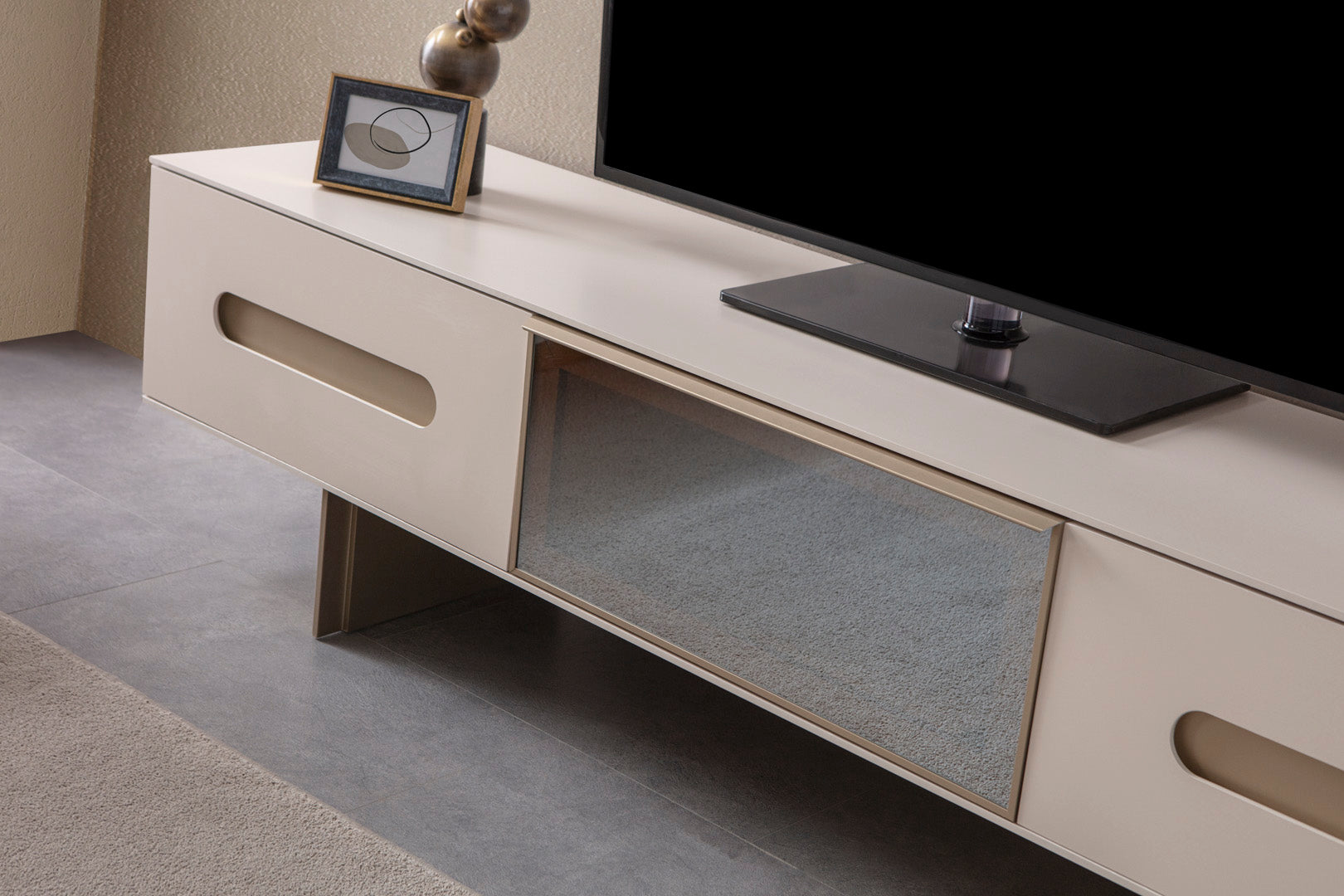TV-Board in heller Farbgebung mit klarer Linienführung und symmetrischem Aufbau. Die Front ist in drei Segmente unterteilt: zwei äußere Klappen mit horizontalen Griffausschnitten und ein mittig platziertes Spiegelelement. Die Griffe sind flächenintegriert und betonen die minimalistische Gestaltung. Die Füße und der Unterbau sind zurückgesetzt, wodurch das Möbel leicht schwebend wirkt. Die Farbwahl bleibt dezent in Beige und Taupe-Tönen. Die Oberfläche ist matt gehalten und kontrastiert dezent mit der verspiegelten Mittelpartie.