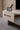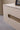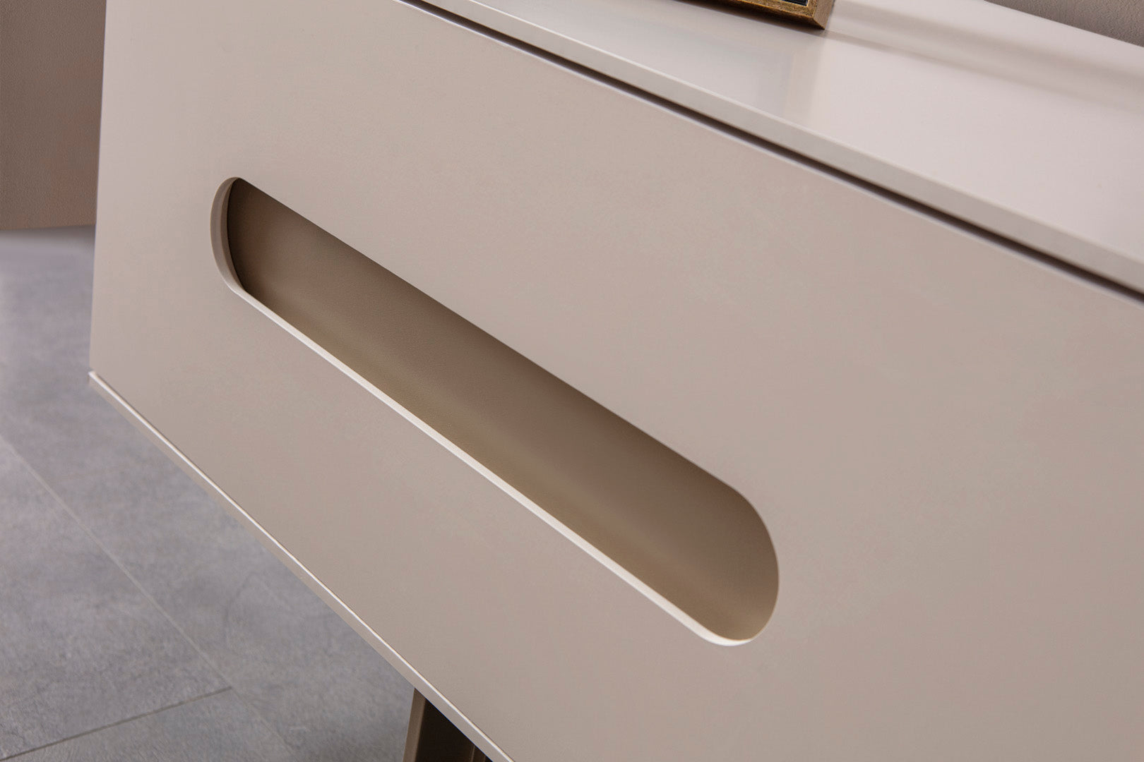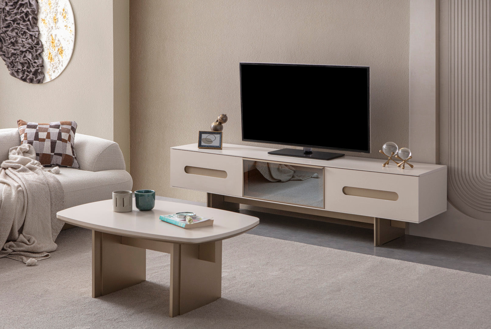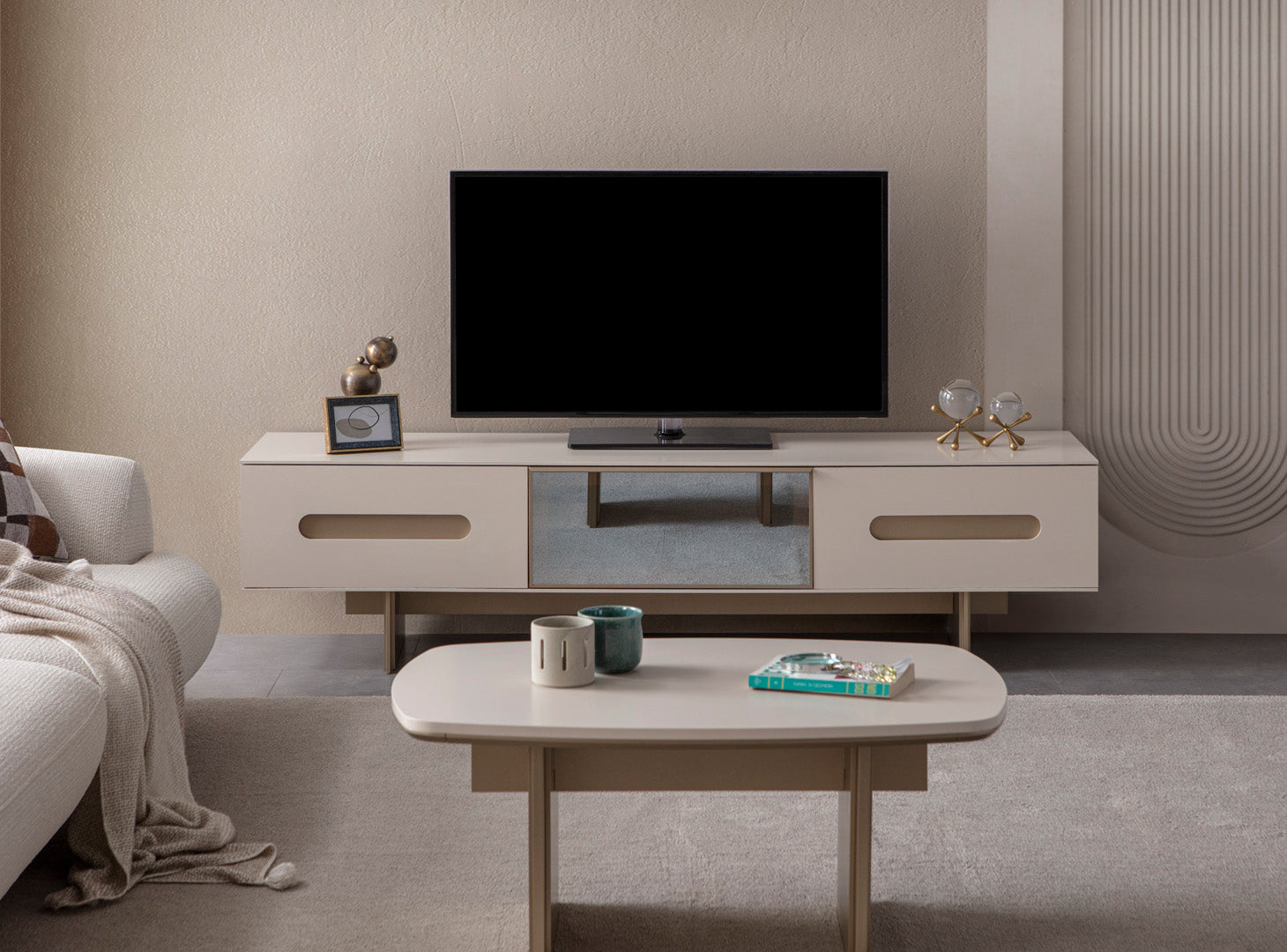 TV-Board in heller Farbgebung mit klarer Linienführung und symmetrischem Aufbau. Die Front ist in drei Segmente unterteilt: zwei äußere Klappen mit horizontalen Griffausschnitten und ein mittig platziertes Spiegelelement. Die Griffe sind flächenintegriert und betonen die minimalistische Gestaltung. Die Füße und der Unterbau sind zurückgesetzt, wodurch das Möbel leicht schwebend wirkt. Die Farbwahl bleibt dezent in Beige und Taupe-Tönen. Die Oberfläche ist matt gehalten und kontrastiert dezent mit der verspiegelten Mittelpartie.