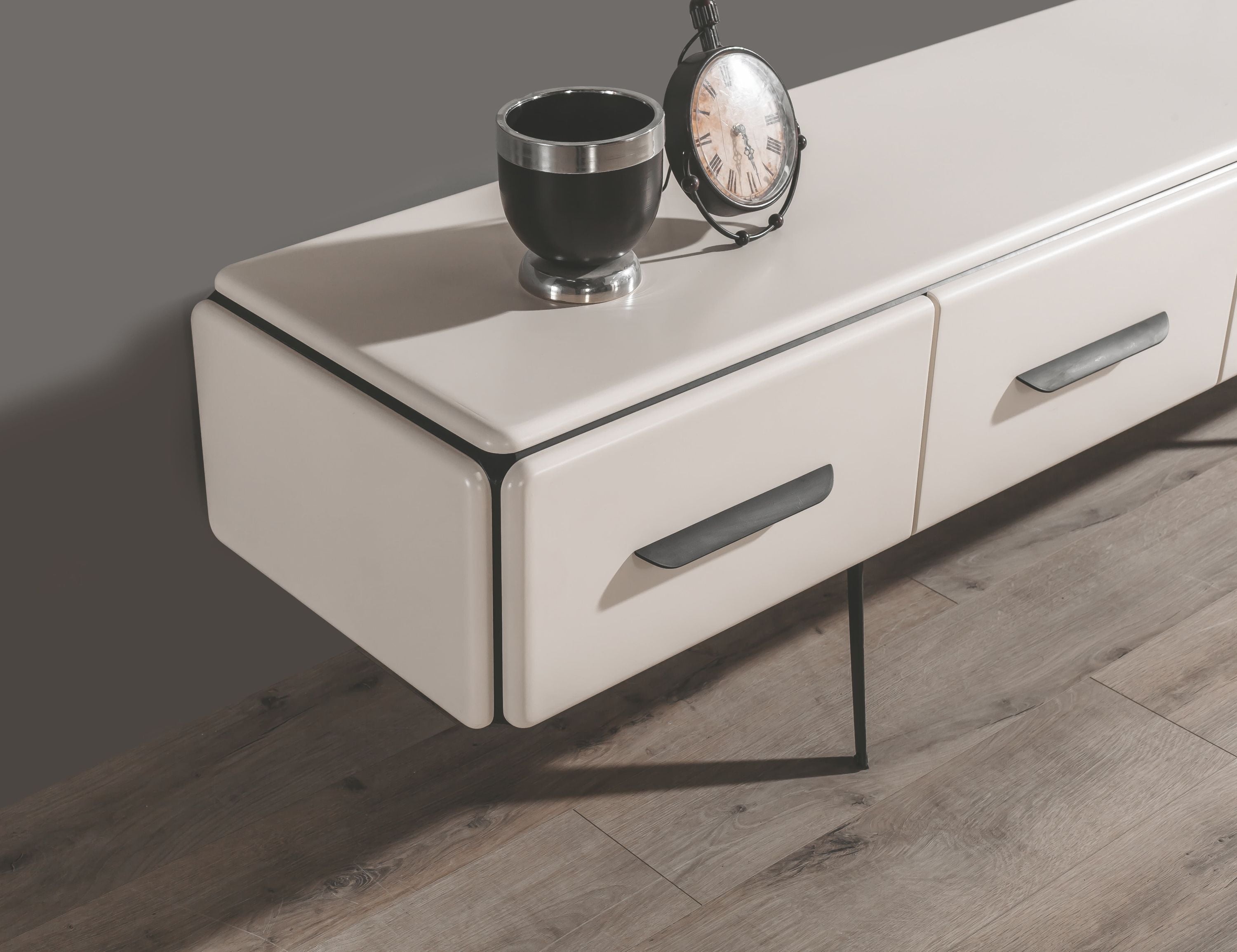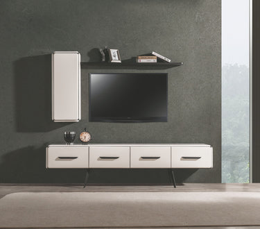 TV-Wohnwand-Set mit wandmontiertem Lowboard, Hängeschrank und Ablageboard. Das Lowboard verfügt über vier gleichmäßige Klappenfronten mit eingelassenen Griffmulden in Schwarz. Abgerundete Kanten sorgen für ein weiches Gesamtbild. Der Hängeschrank ist vertikal ausgerichtet und zeigt sich in glatter, griffreduzierter Optik. Das Regalbord darüber ist in Schwarz gehalten und dient als Ablage für Bücher und Dekoration. Das Farbkonzept setzt auf Kontrast zwischen hellem Korpus und dunklen Akzenten.