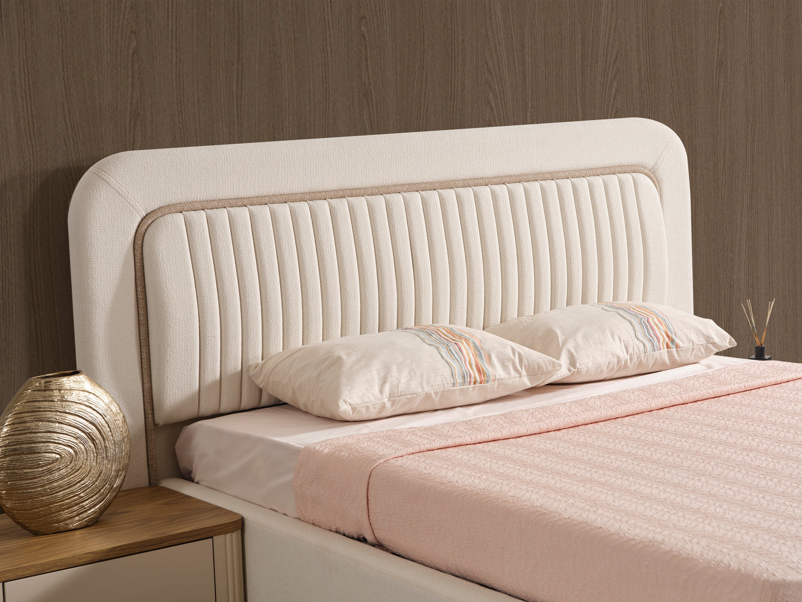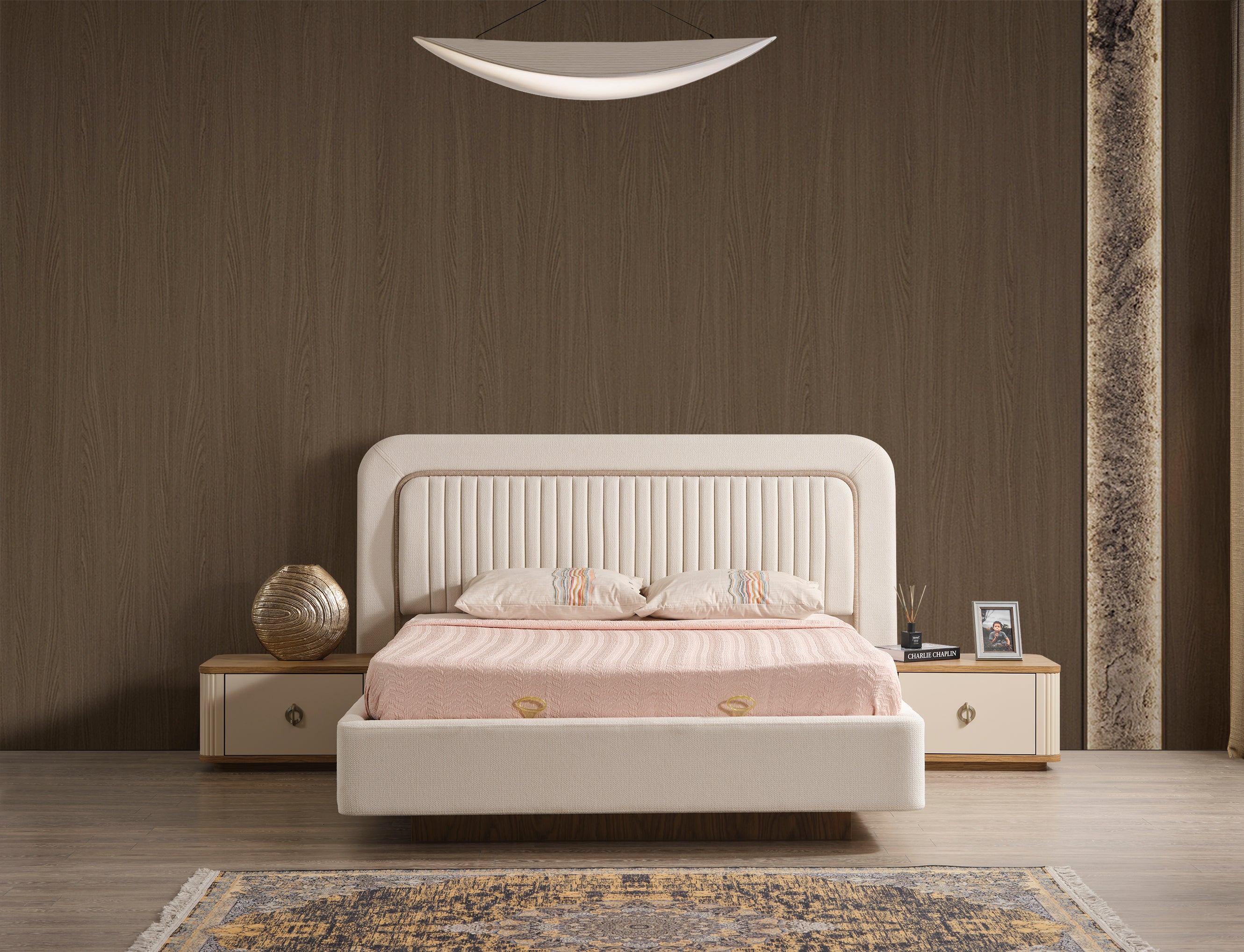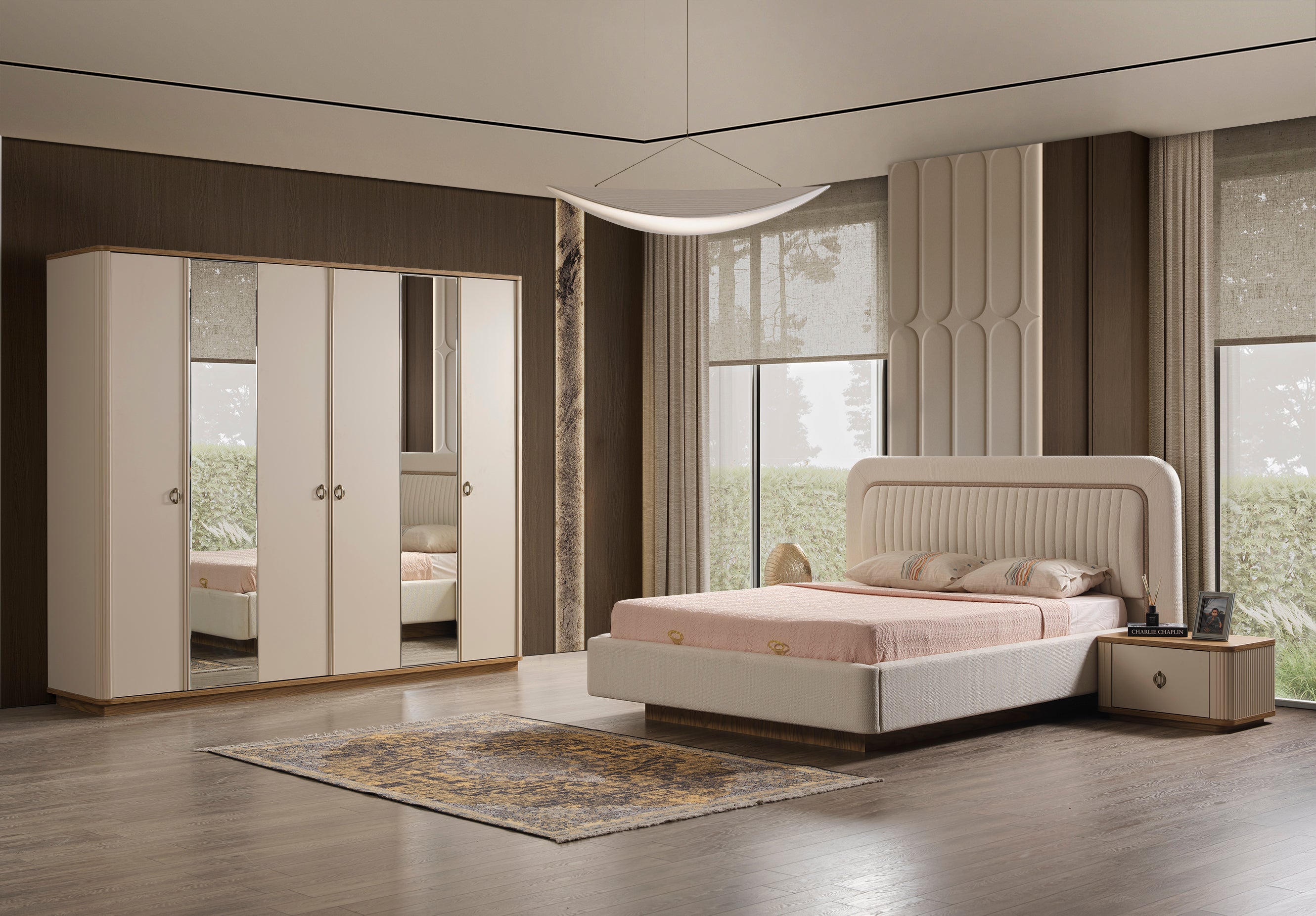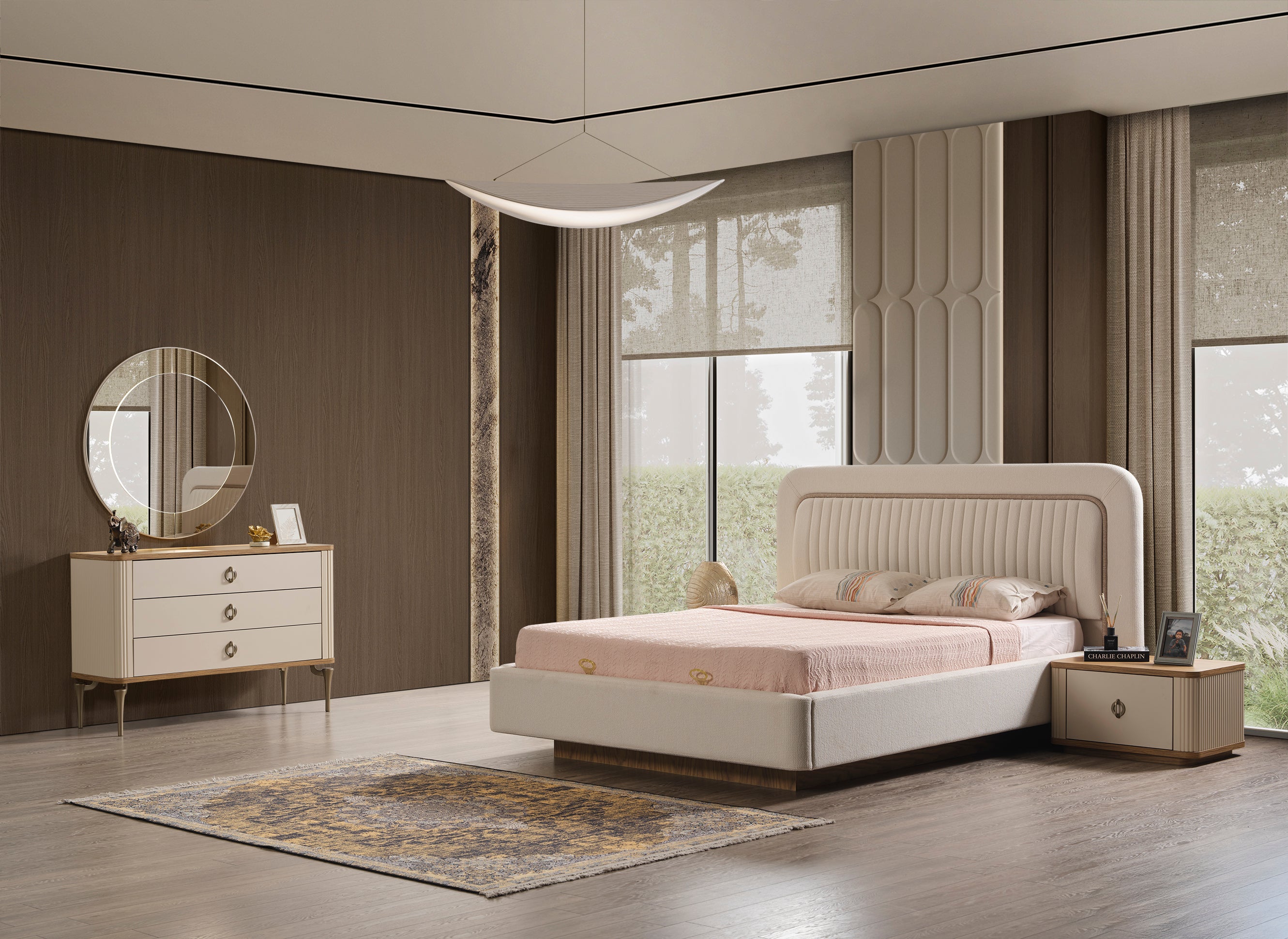 Das Schlafzimmer-Set Paris vereint stilvolle Eleganz mit durchdachtem Stauraum. Mit seinem modernen Look in Vizon Beige sorgt es für eine ruhige Atmosphäre im Schlafzimmer. Das weich gepolsterte Bett mit integriertem Bettkasten bietet zusätzlichen Platz für Decken und Kissen. Der großzügige Spiegelschrank bringt Ordnung in Ihre Garderobe, während Kommode und Nachttische funktionale Akzente setzen. Paris ist die perfekte Kombination aus Komfort, Design und Struktur für ein harmonisches Zuhause.