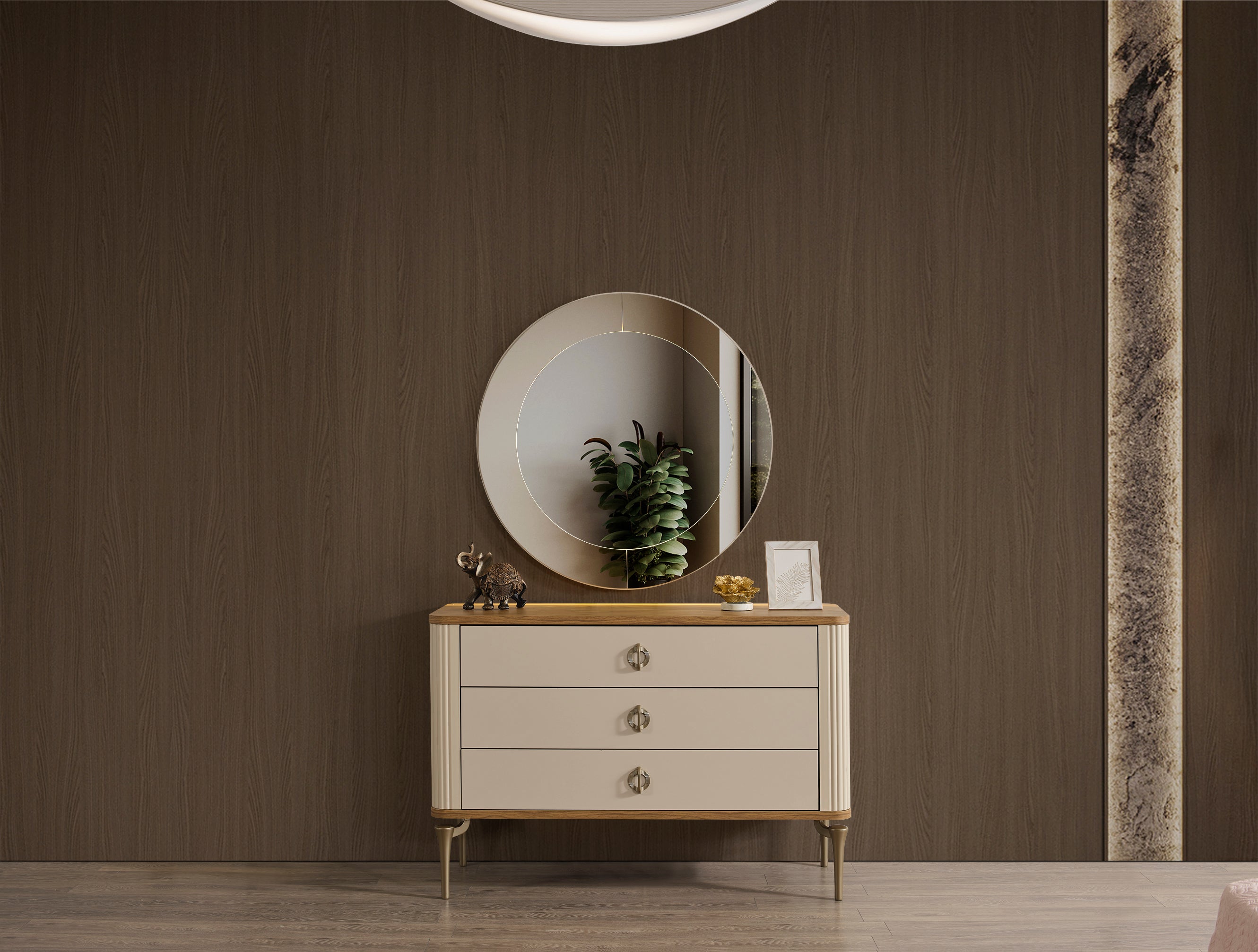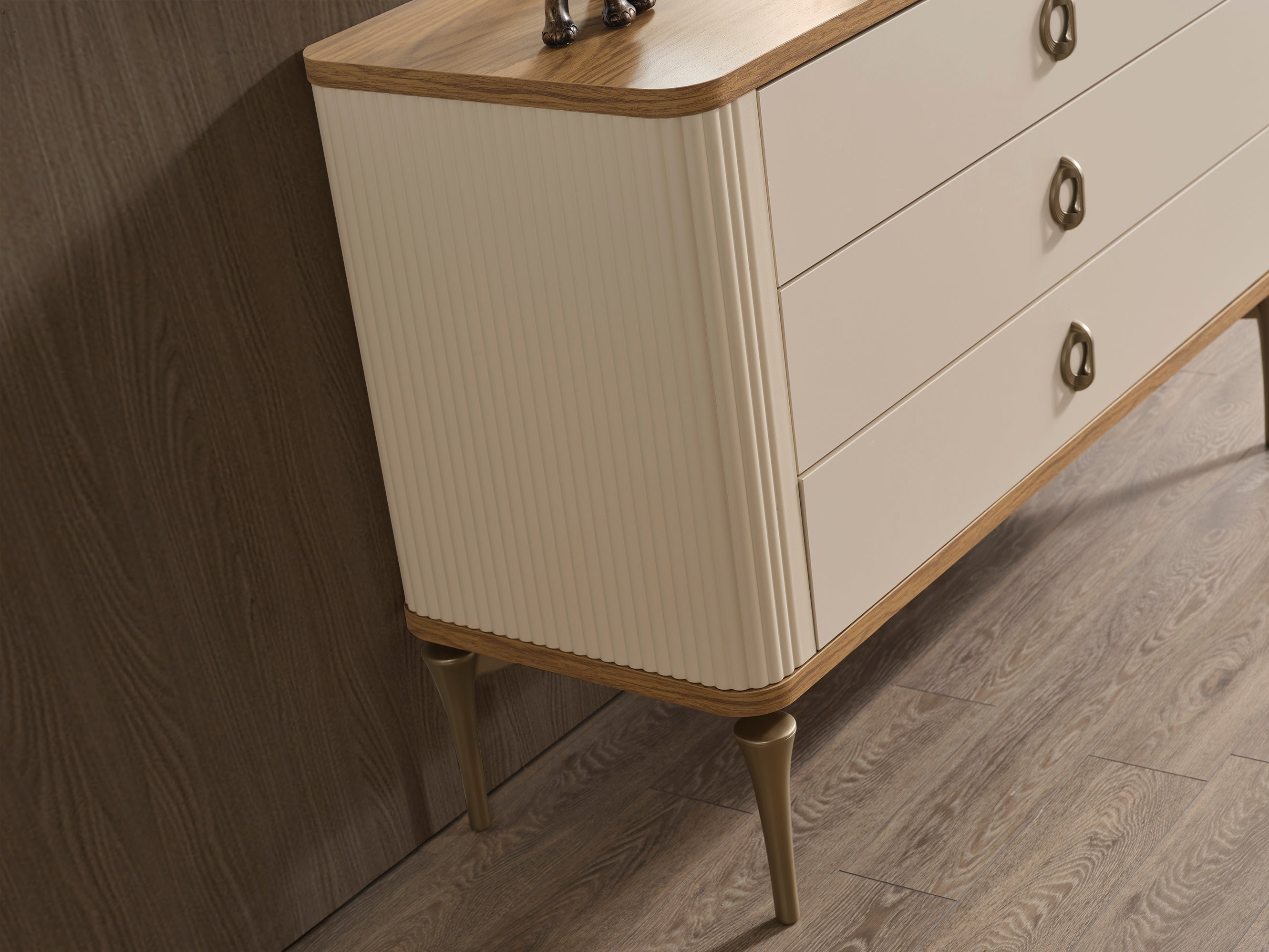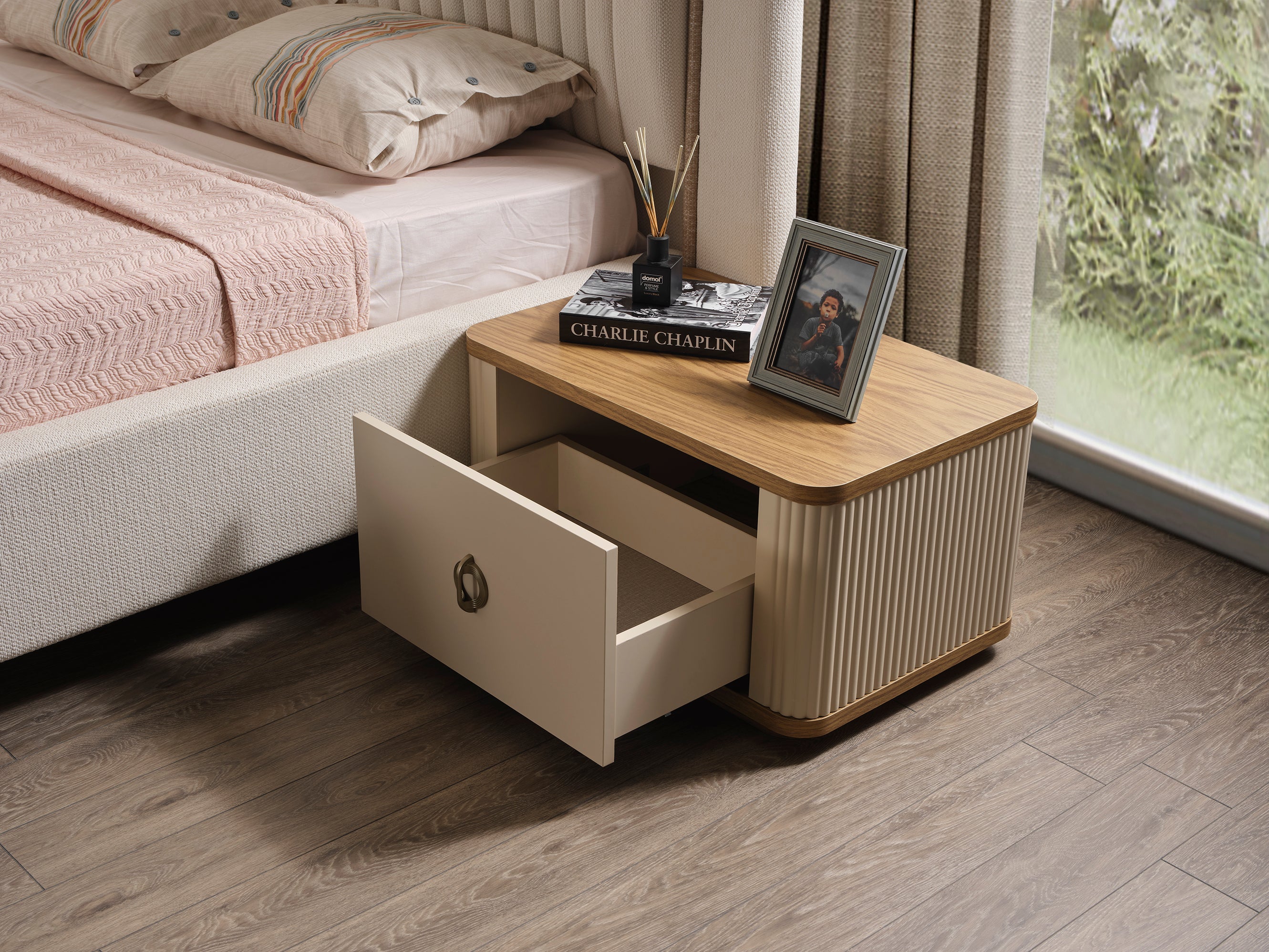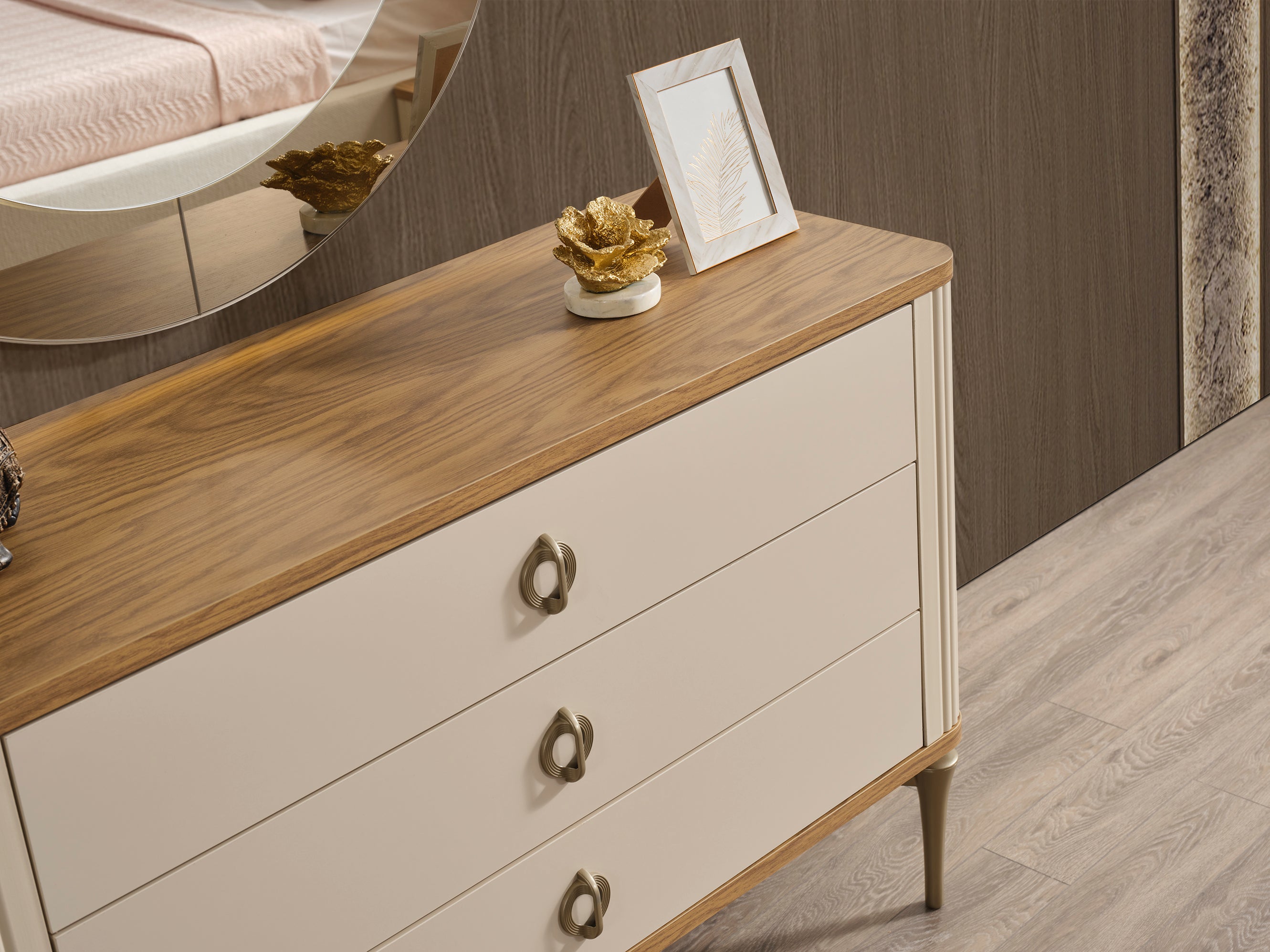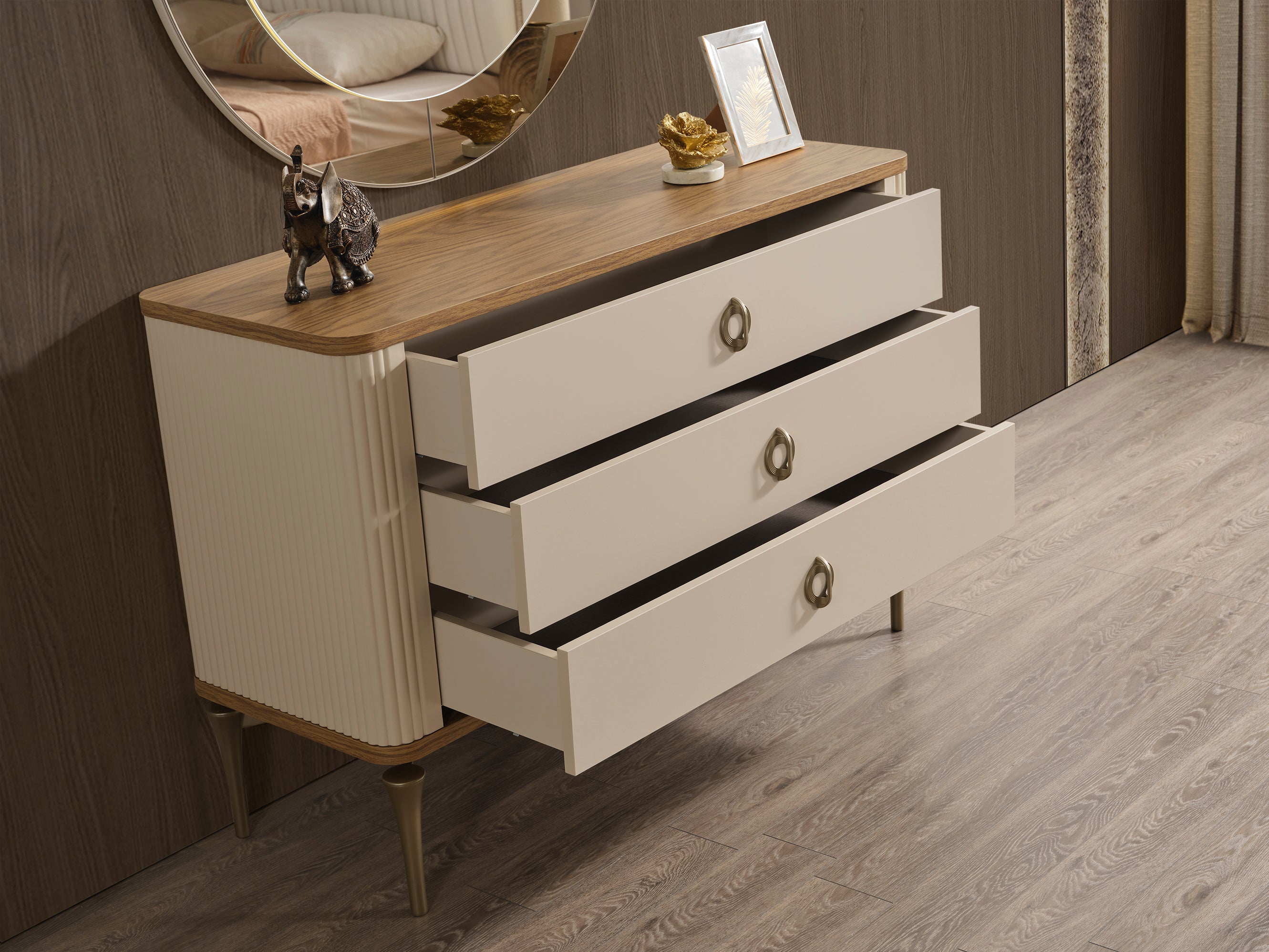 Das Schlafzimmer-Set Paris vereint stilvolle Eleganz mit durchdachtem Stauraum. Mit seinem modernen Look in Vizon Beige sorgt es für eine ruhige Atmosphäre im Schlafzimmer. Das weich gepolsterte Bett mit integriertem Bettkasten bietet zusätzlichen Platz für Decken und Kissen. Der großzügige Spiegelschrank bringt Ordnung in Ihre Garderobe, während Kommode und Nachttische funktionale Akzente setzen. Paris ist die perfekte Kombination aus Komfort, Design und Struktur für ein harmonisches Zuhause.