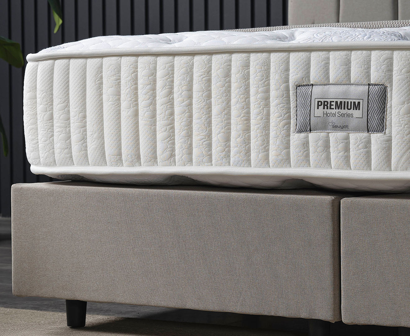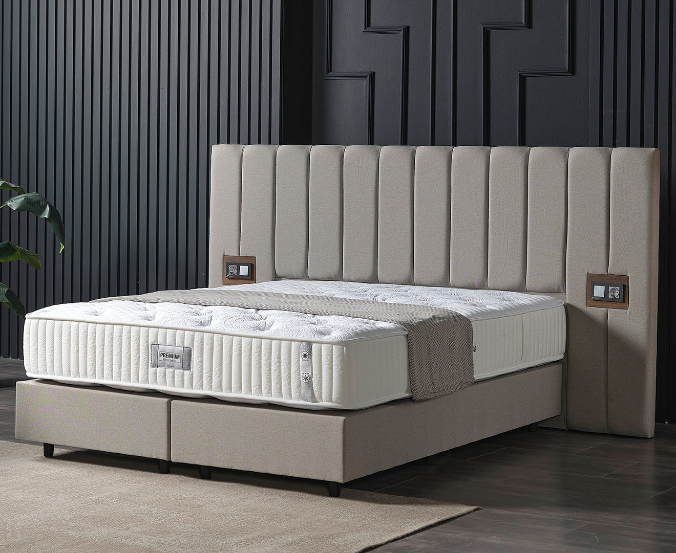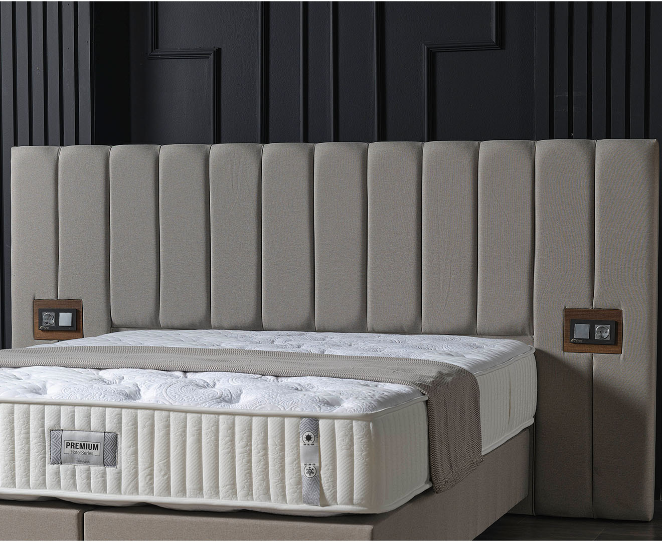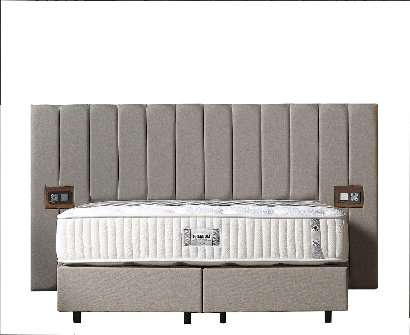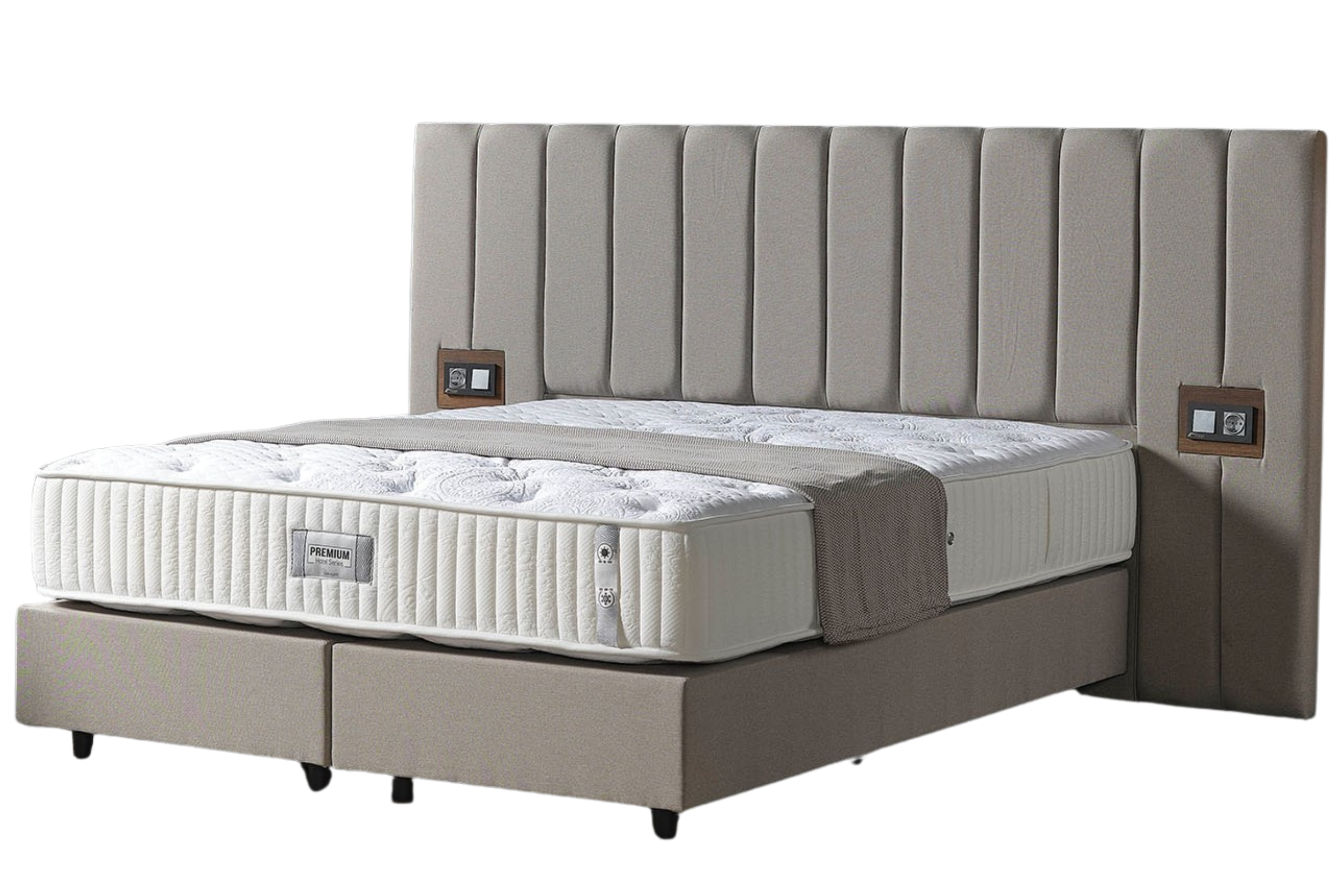 Das Premium Bett Set in elegantem Grau wurde speziell für Hotels und Airbnb-Vermieter entwickelt und vereint modernes Design, Langlebigkeit und höchsten Komfort. Das großzügige, vertikal gesteppt gepolsterte Kopfteil verleiht dem Bett eine exklusive Optik und sorgt für eine angenehme Rückenlehne. Ein besonderes Highlight sind die integrierten Steckdosen, die Gästen eine praktische Stromversorgung direkt am Bett ermöglichen. Die stabile Konstruktion mit Kunststofffüßen in Schwarz bietet hohe Standfestigkeit und eine lange Lebensdauer – ideal für den intensiven Gebrauch. Die gepolsterte Liegefläche sorgt für optimalen Schlafkomfort, während die schlichte Farbgebung eine harmonische Ergänzung zu verschiedenen Einrichtungsstilen darstellt. Erhältlich in verschiedenen Größen, passt sich das Premium Bett Set perfekt an Ihre Anforderungen an.