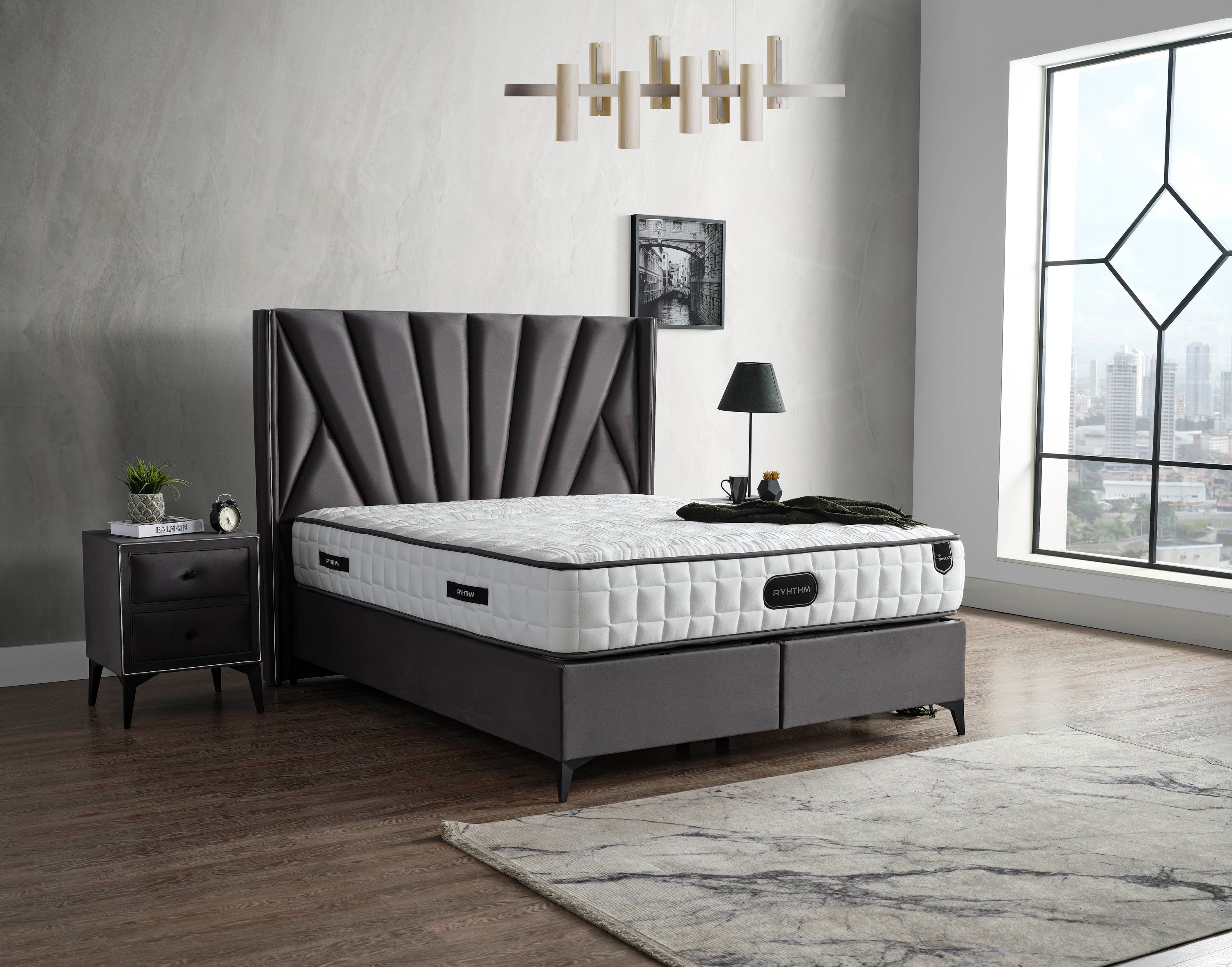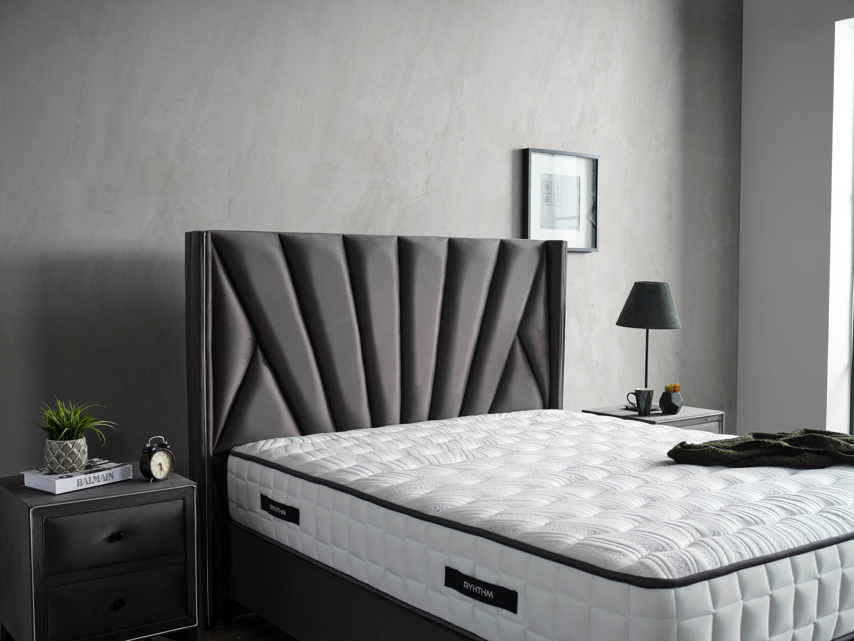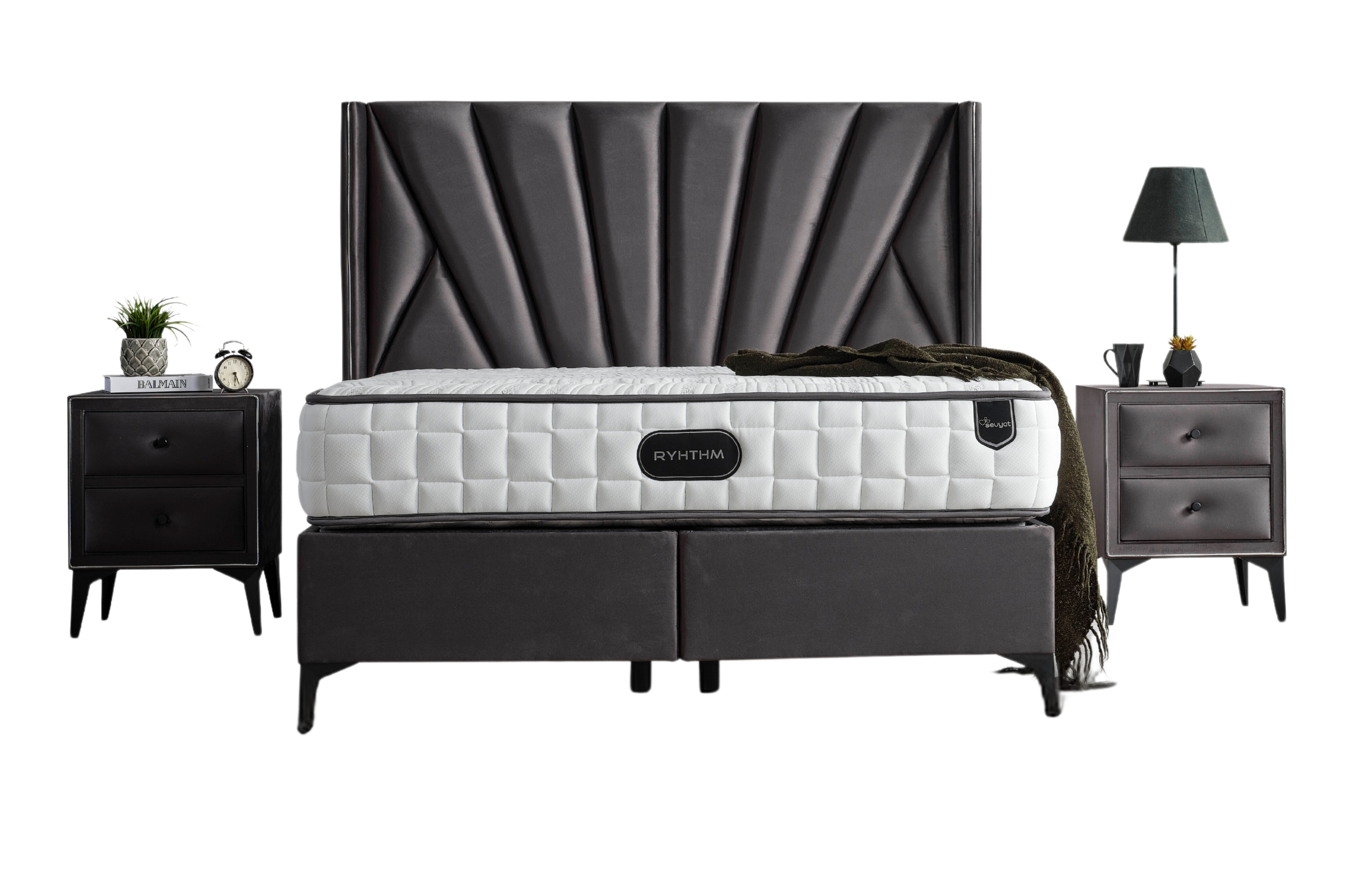 Das Rhythm Bett Set in elegantem Anthrazit kombiniert modernes Design mit luxuriösem Komfort. Der edle Samtstoff-Bezug verleiht dem Bett eine besonders weiche Haptik und eine stilvolle Optik. Das gepolsterte Kopfteil mit markanter, fächerförmiger Steppung und silbernen Details setzt ein elegantes Highlight in Ihrem Schlafzimmer. Dank des integrierten Bettkastens bietet das Bett großzügigen Stauraum für Bettwäsche und andere Utensilien. Die stabilen Kunststofffüße in Schwarz sorgen für eine sichere Standfestigkeit und runden das moderne Design perfekt ab. Erhältlich in verschiedenen Größen, passt sich das Rhythm Bett Set optimal Ihren individuellen Bedürfnissen an und schafft eine luxuriöse Atmosphäre in Ihrem Zuhause.