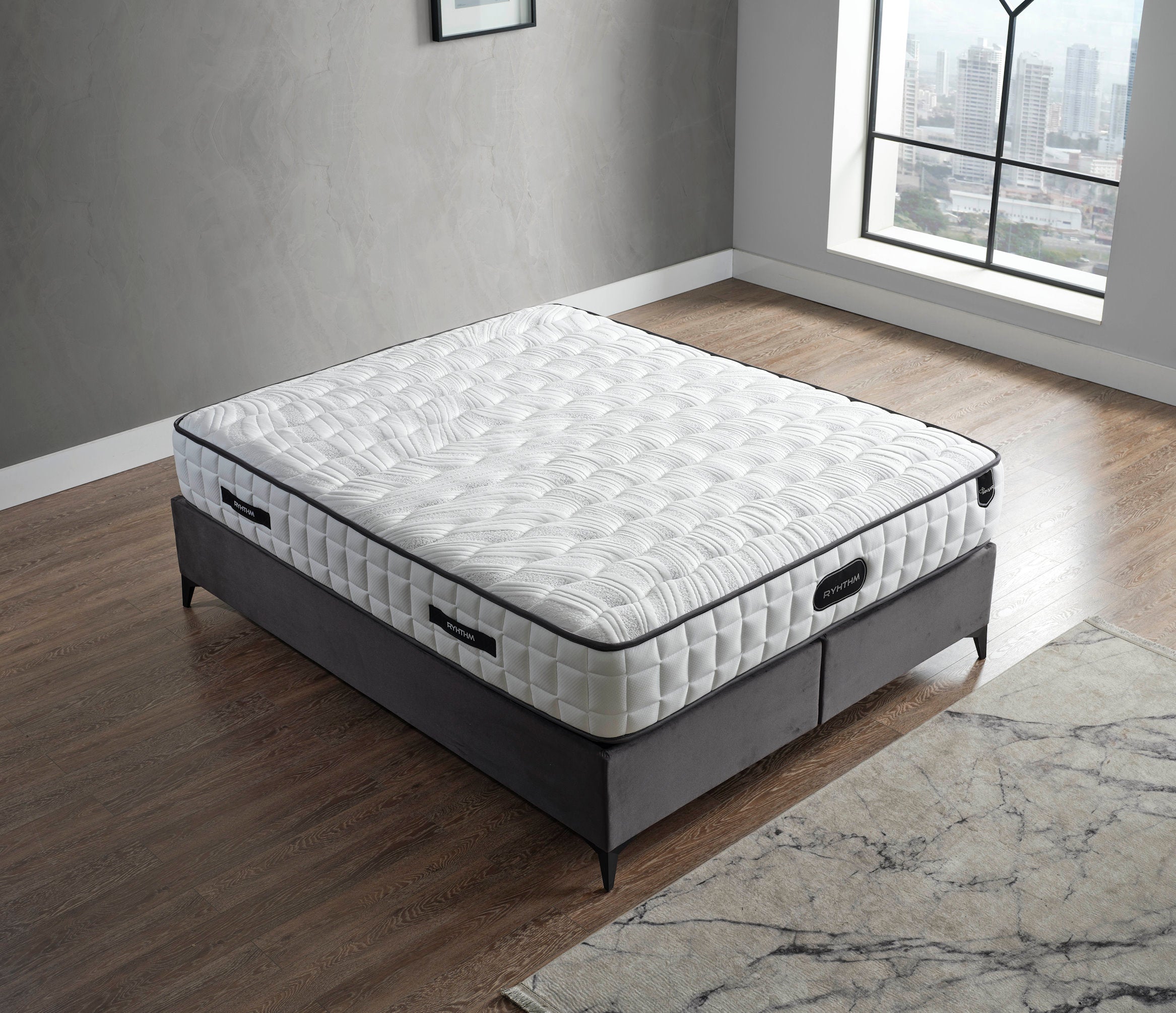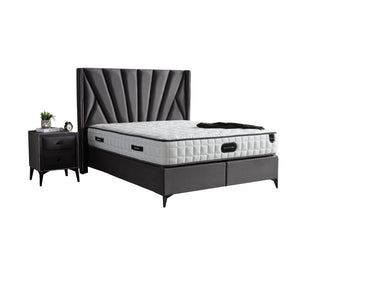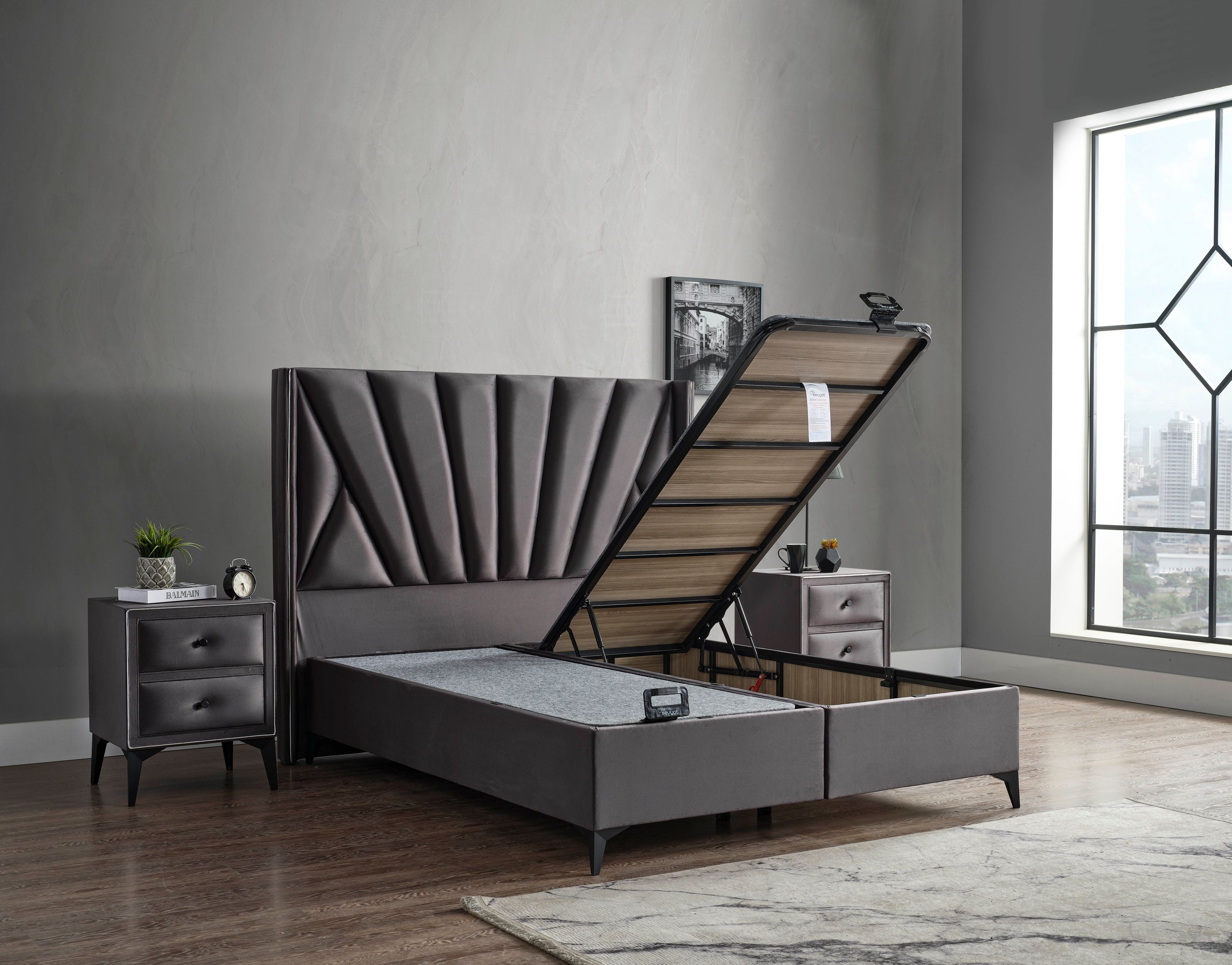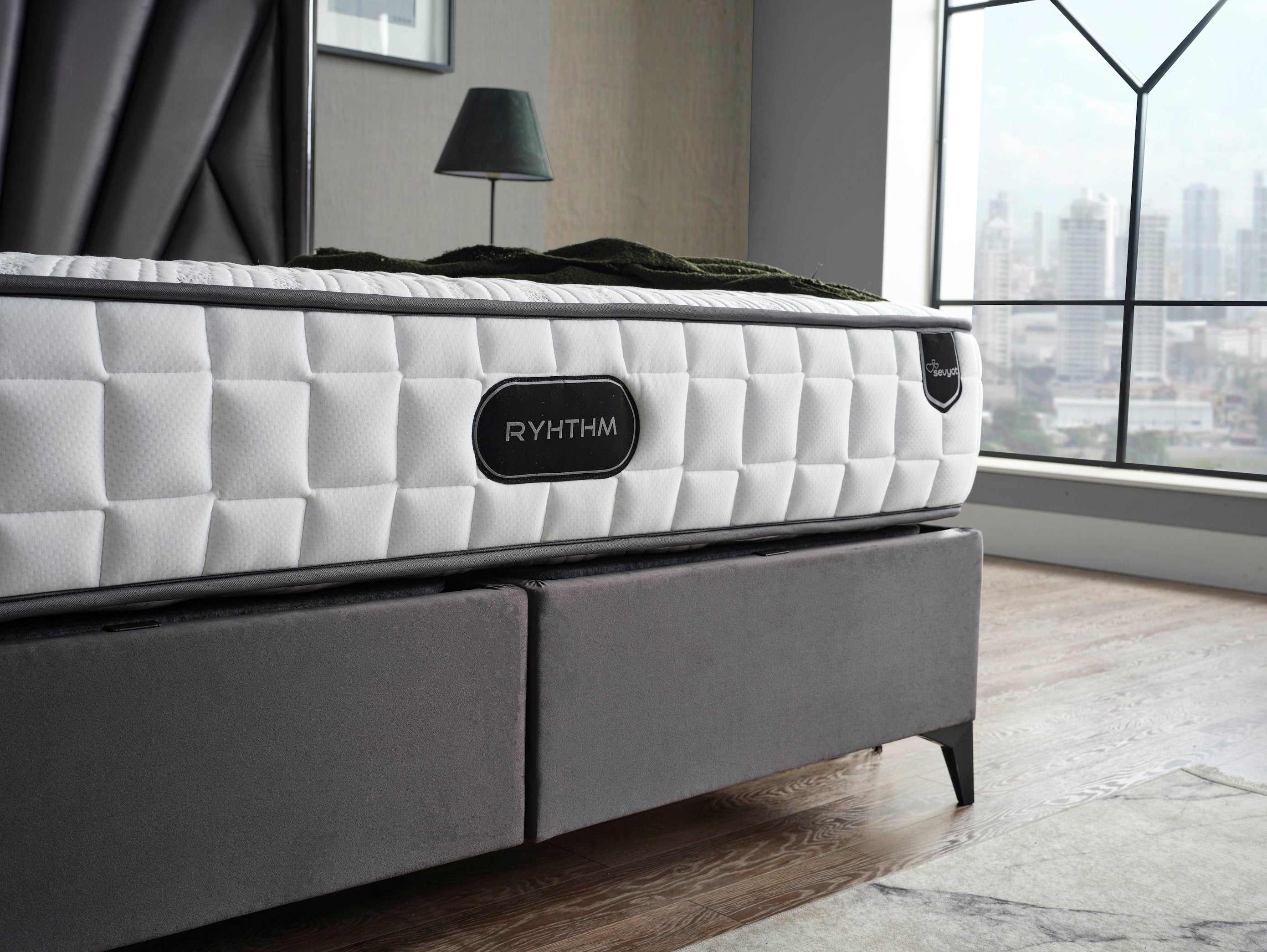 Das Rhythm Bett Set in elegantem Anthrazit kombiniert modernes Design mit luxuriösem Komfort. Der edle Samtstoff-Bezug verleiht dem Bett eine besonders weiche Haptik und eine stilvolle Optik. Das gepolsterte Kopfteil mit markanter, fächerförmiger Steppung und silbernen Details setzt ein elegantes Highlight in Ihrem Schlafzimmer. Dank des integrierten Bettkastens bietet das Bett großzügigen Stauraum für Bettwäsche und andere Utensilien. Die stabilen Kunststofffüße in Schwarz sorgen für eine sichere Standfestigkeit und runden das moderne Design perfekt ab. Erhältlich in verschiedenen Größen, passt sich das Rhythm Bett Set optimal Ihren individuellen Bedürfnissen an und schafft eine luxuriöse Atmosphäre in Ihrem Zuhause.
