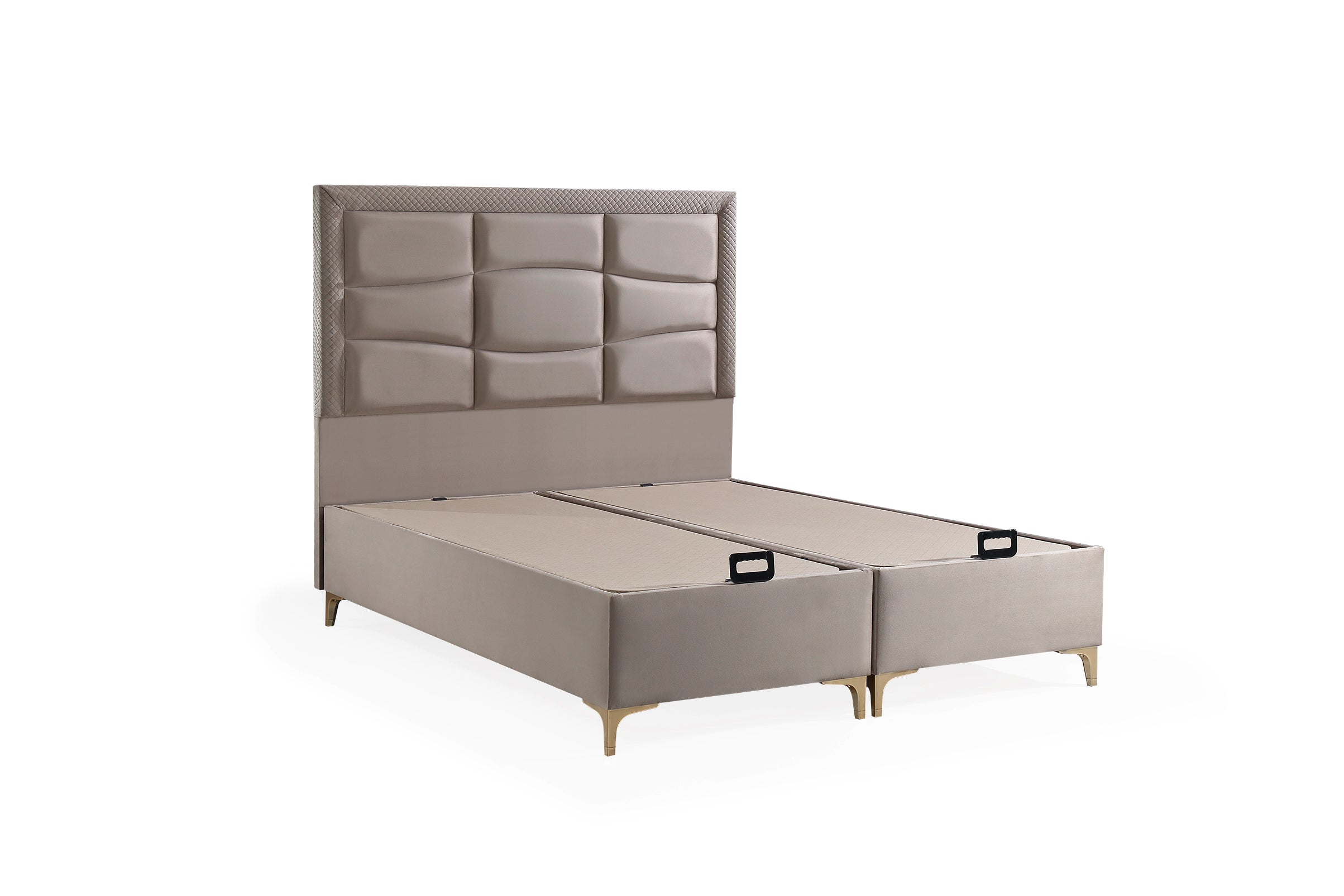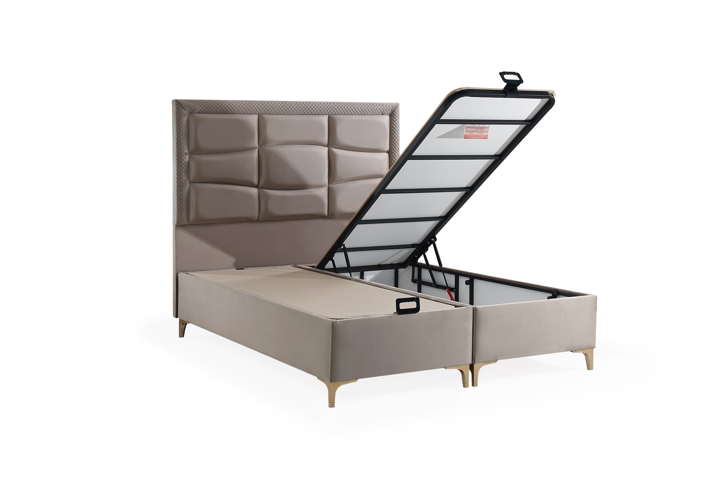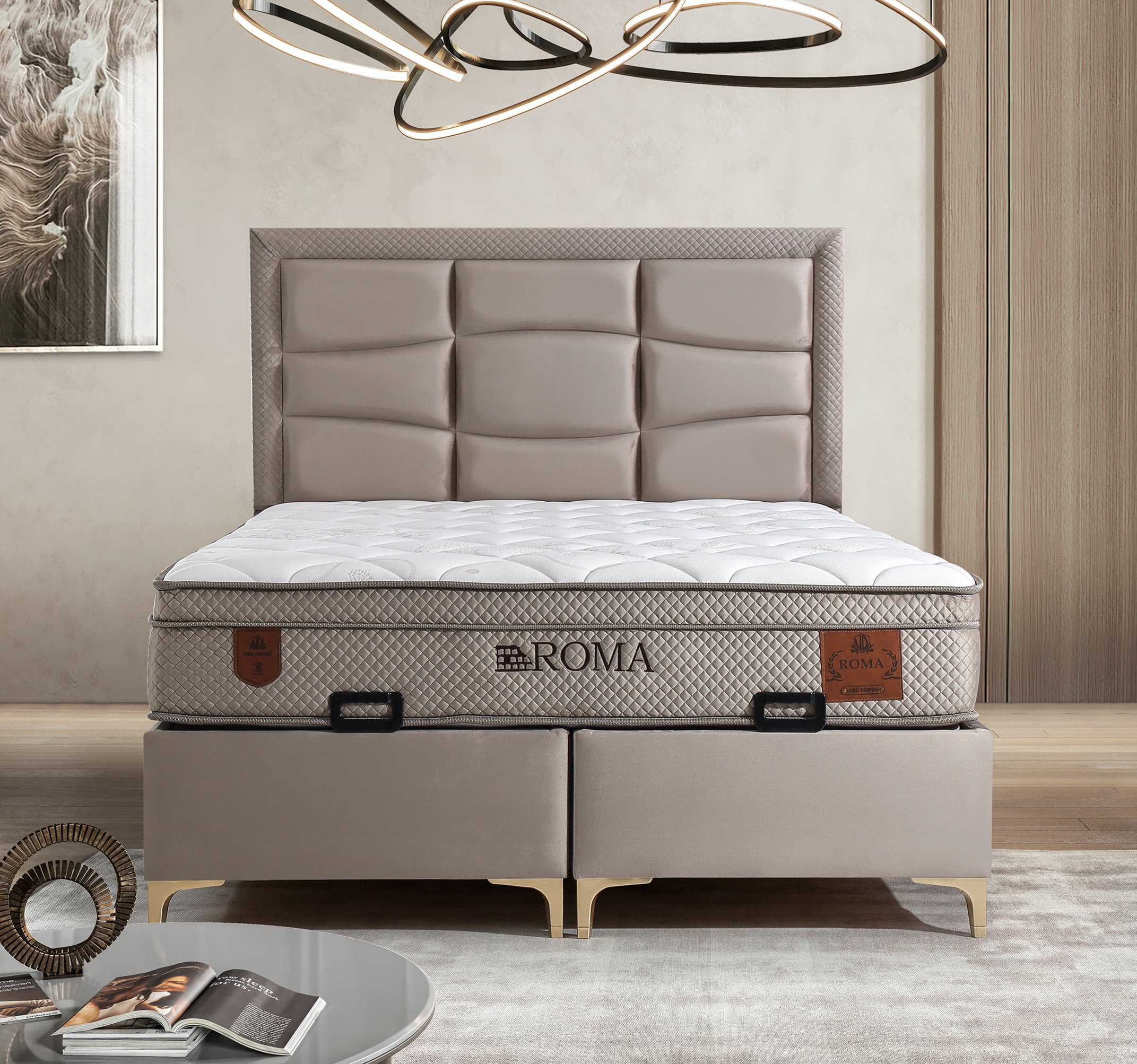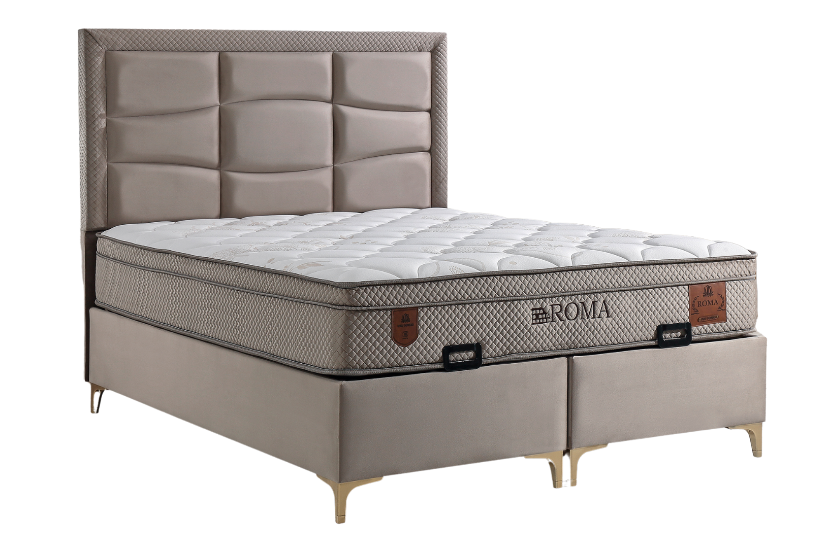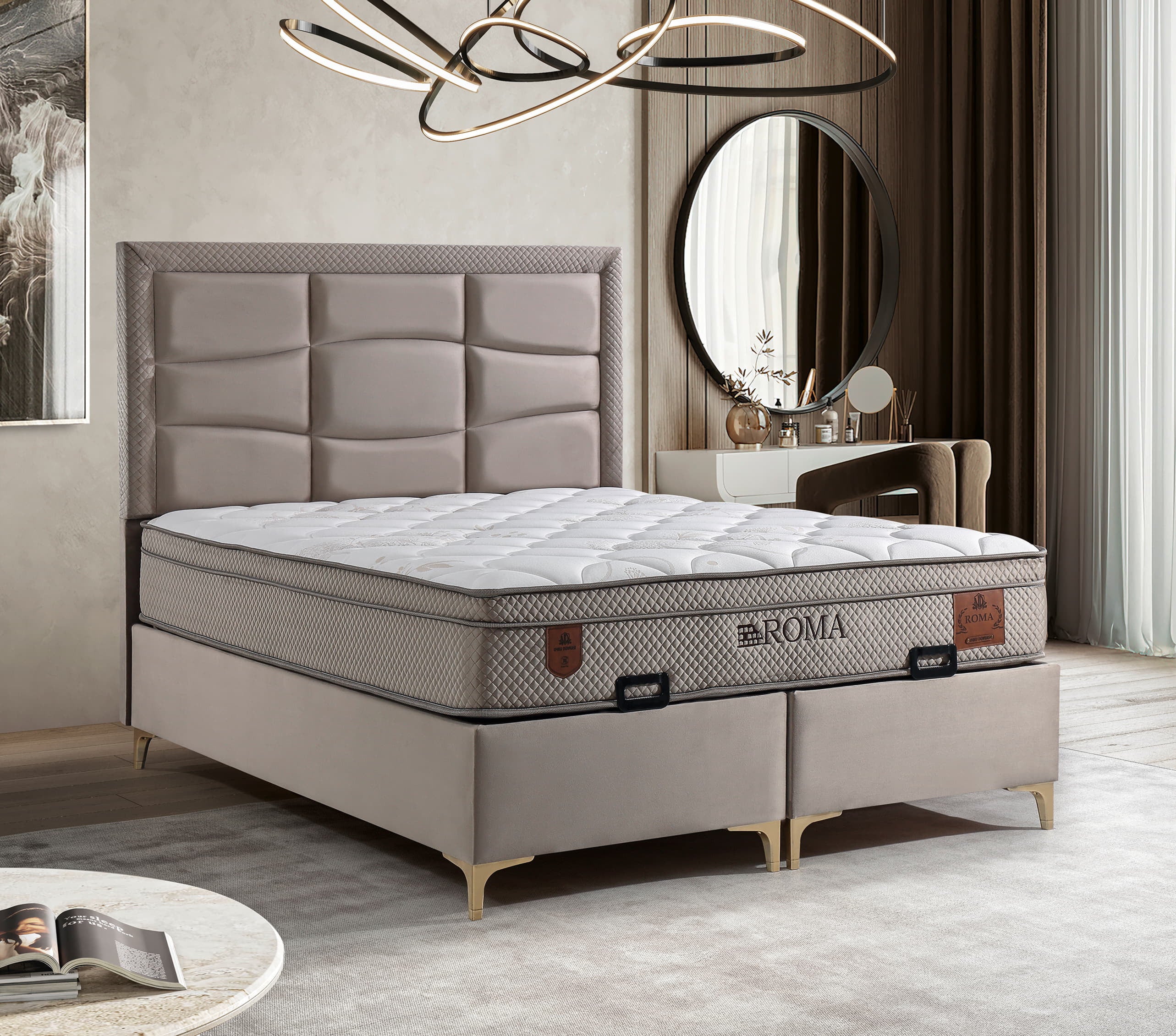 Das Roma Bett mit Bettkasten in Venues Soft Kahve besticht durch ein stilvolles Design und außergewöhnlichen Komfort. Das gepolsterte Kopfteil mit eleganter Steppung verleiht dem Bett eine edle Optik und sorgt für eine gemütliche Atmosphäre im Schlafzimmer. Die hochwertige Federkernmatratze mit zusätzlicher Polsterung bietet optimale Unterstützung und eine erholsame Nachtruhe. Ein Highlight ist der geräumige Bettkasten, der mit einem leichtgängigen Hebemechanismus ausgestattet ist und reichlich Platz für Bettwäsche, Decken oder andere Utensilien bietet. Die goldfarbenen Metallfüße sorgen für eine stabile Basis und unterstreichen den luxuriösen Look des Bettes. Der hochwertige Stoffbezug in Venues Soft Kahve ist angenehm weich, strapazierfähig und pflegeleicht. Das Roma Bett ist in verschiedenen Größen und Matratzenoptionen erhältlich, um individuellen Bedürfnissen gerecht zu werden – die perfekte Kombination aus Funktionalität und Eleganz für Ihr Zuhause.