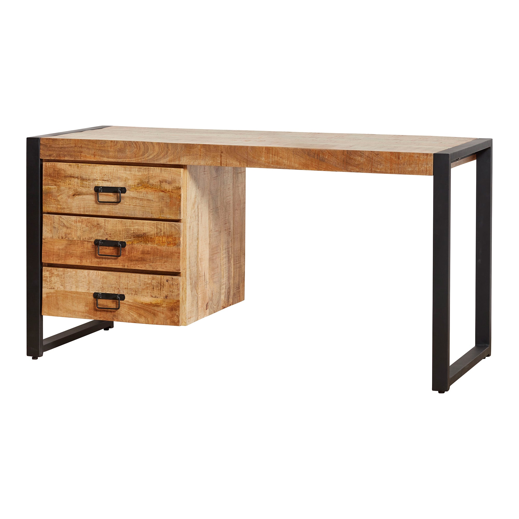 Der Schreibtisch aus unserer Zavan-Serie verf ügt über drei Schubladen und ist aus massivem Mangoholz gefertigt. Das Mangoholz ist mit einer Schutzschicht versehen. Die Schubladen haben hängende Metallgriffe und sind schwarz lackiert.Abmessungen Breite: 145 cm Tiefe: 58 cm Höhe: 74 cmAbmessungen der Schublade: 41,5 x 38 x 11 cm Höhe der Schublade vom Boden: 17 cmPflege: mit einem leicht feuchten Tuch abwischen.