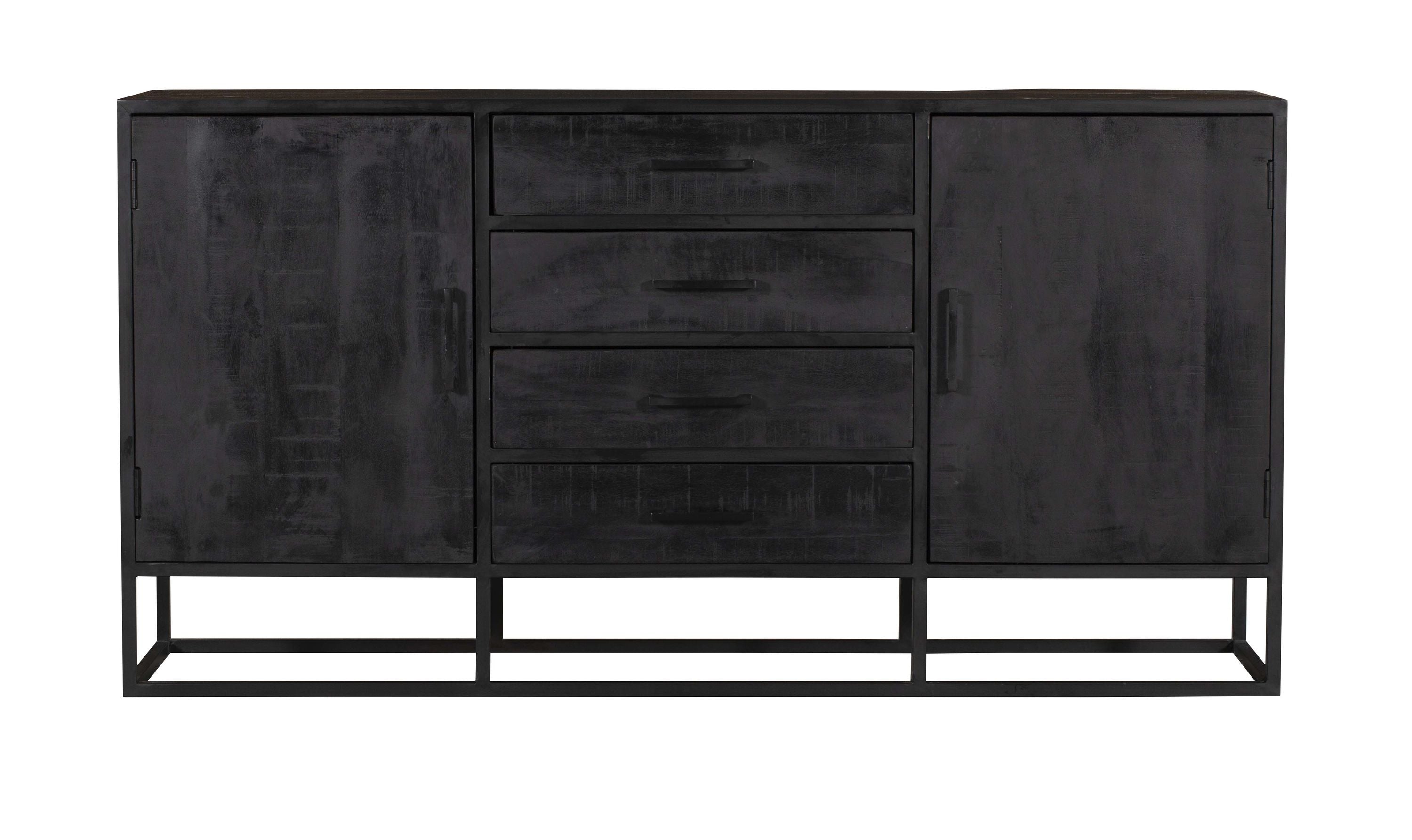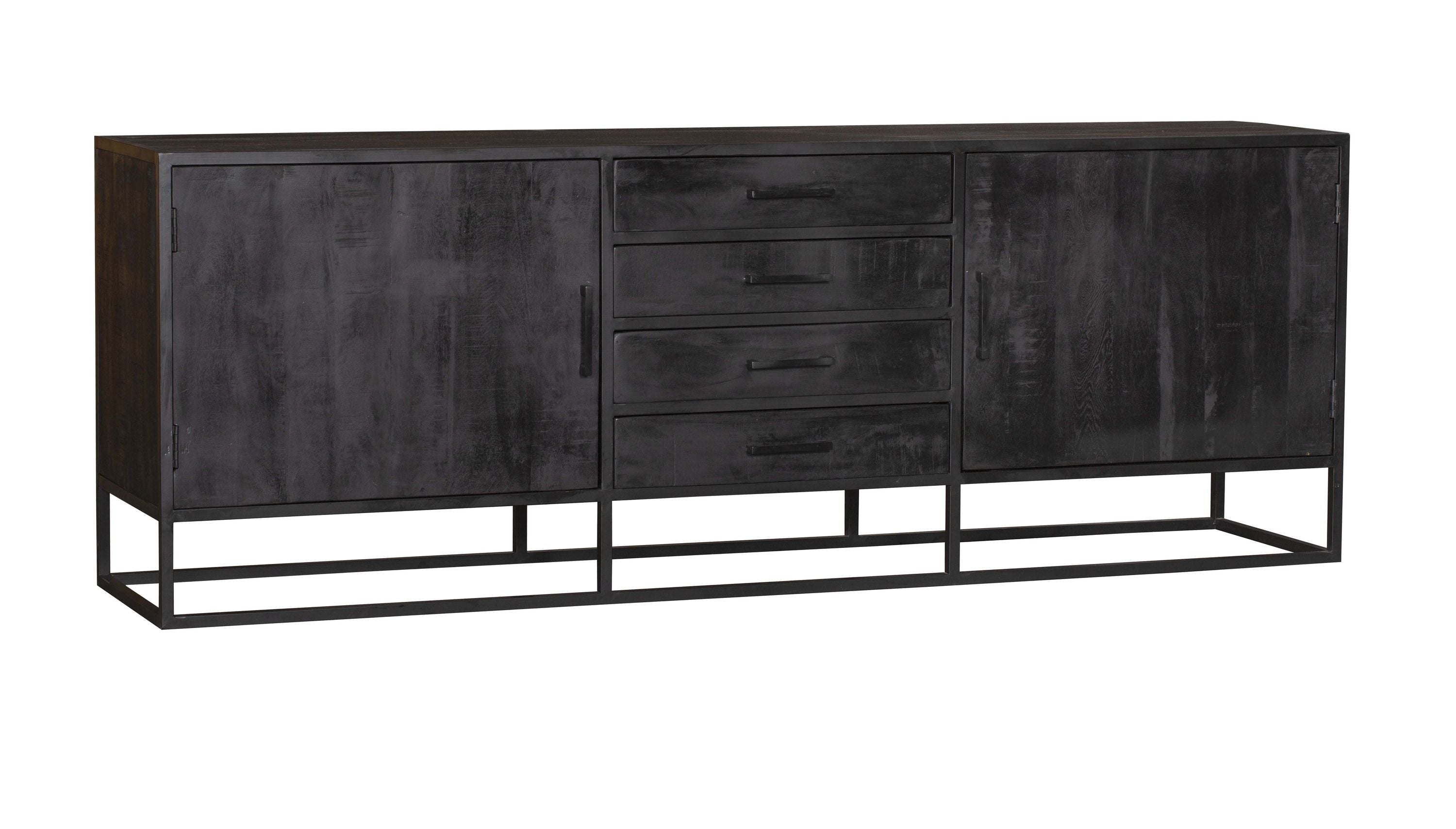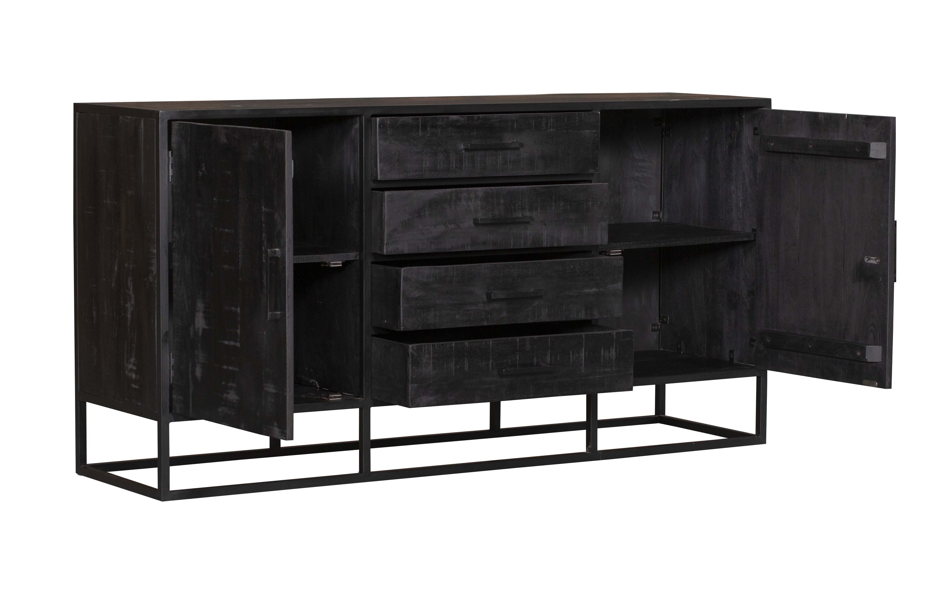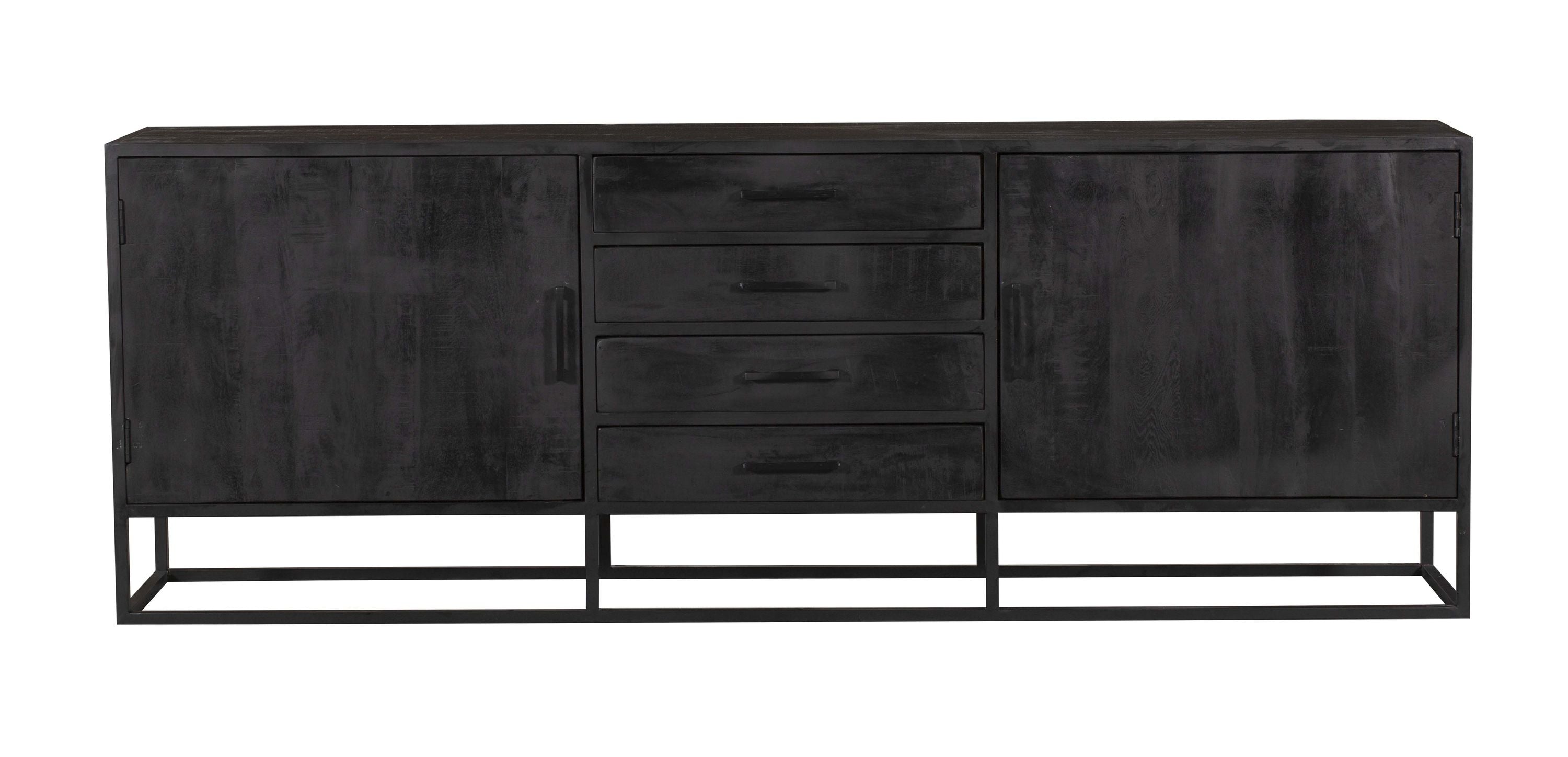 Das Sideboard aus unserer Serie Devereux Black verf ügt über vier Schubladen und zwei T üren. Es ist aus massivem Mangoholz gefertigt und mit einem schwarzen Lack behandelt. Sowohl der Rahmen als auch die Griffe sind aus Metall gefertigt und schwarz lackiert.Abmessungen: - Breite: 210/165 cm - Tiefe: 45 cm - Höhe: 75 cm Pflege: mit einem leicht feuchten Tuch abwischen.