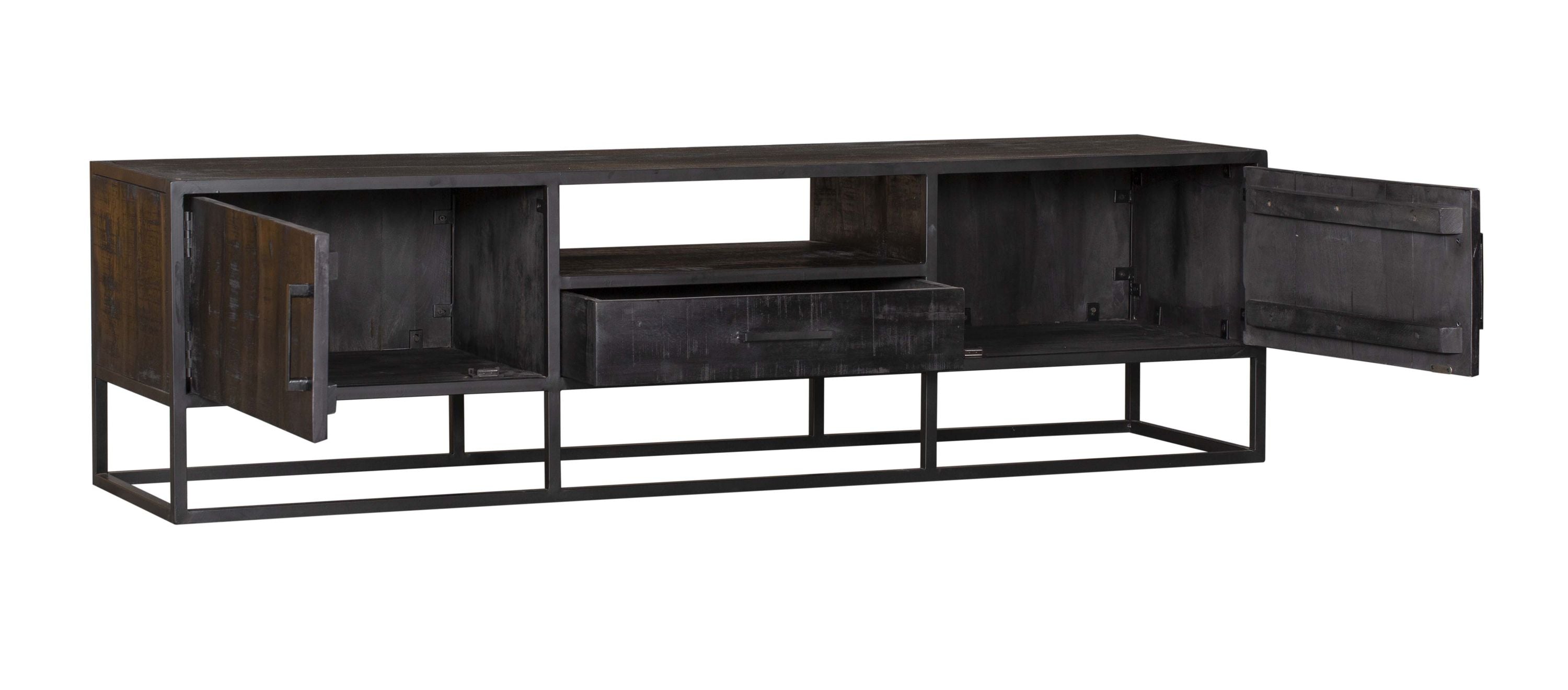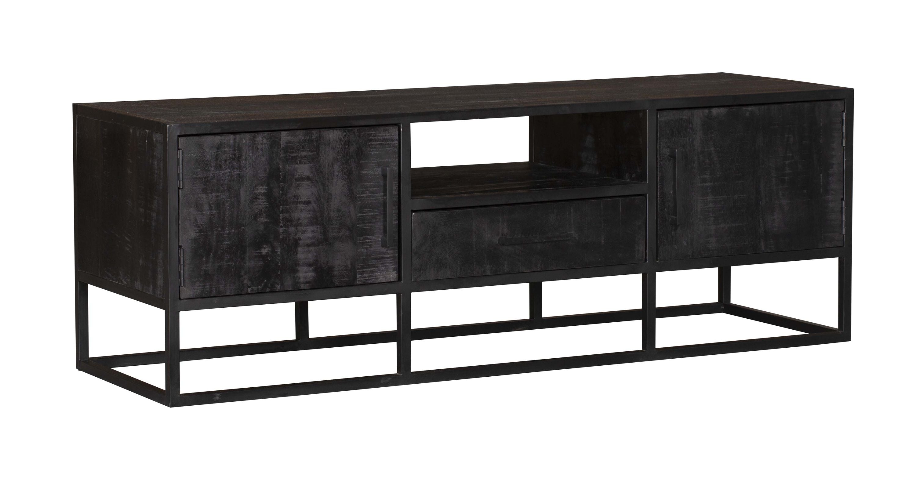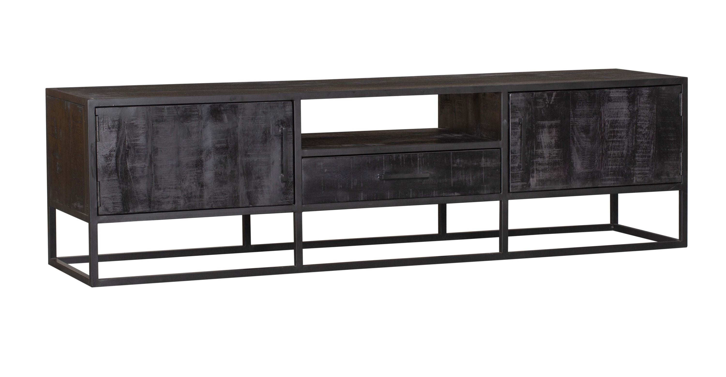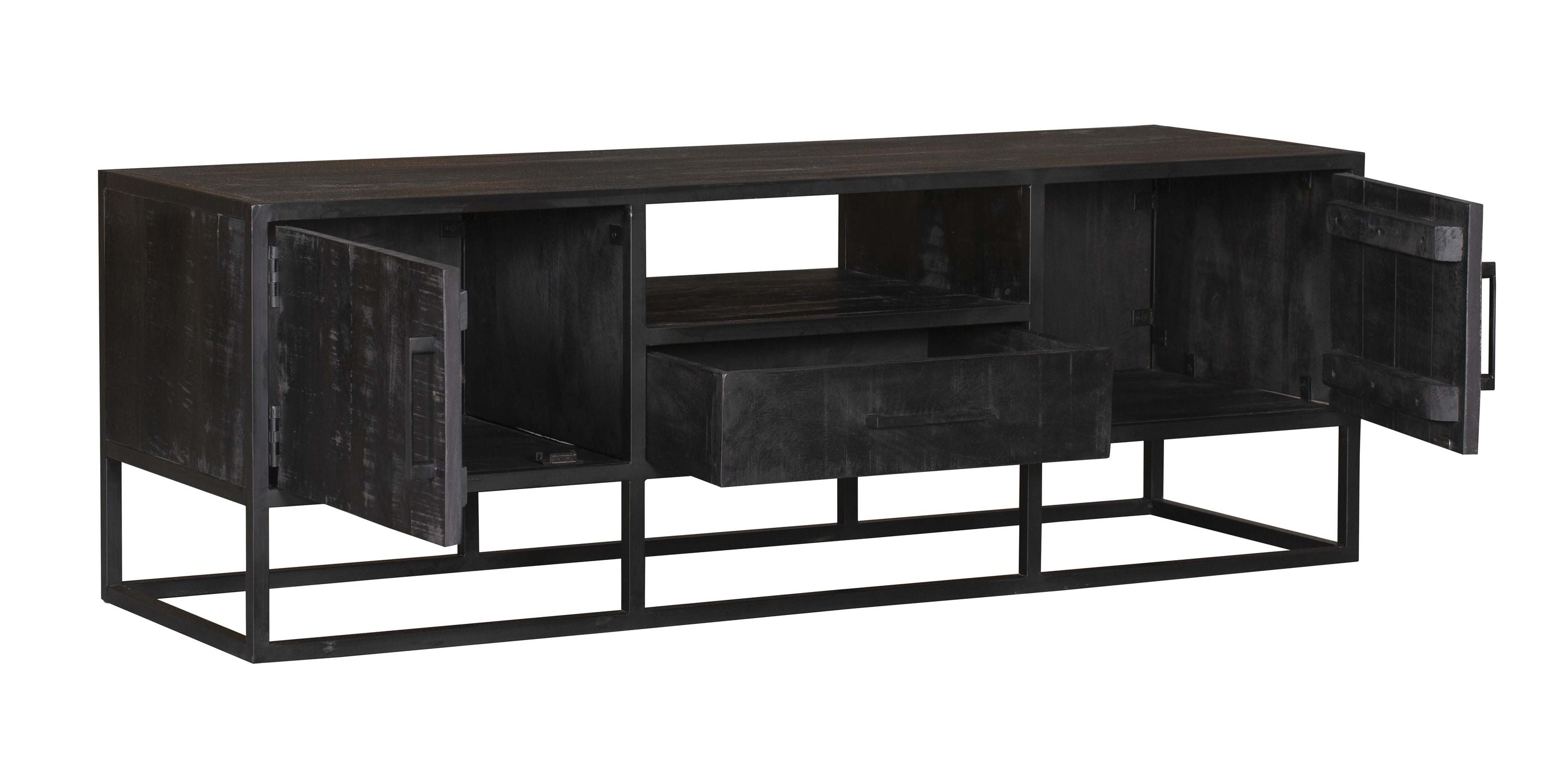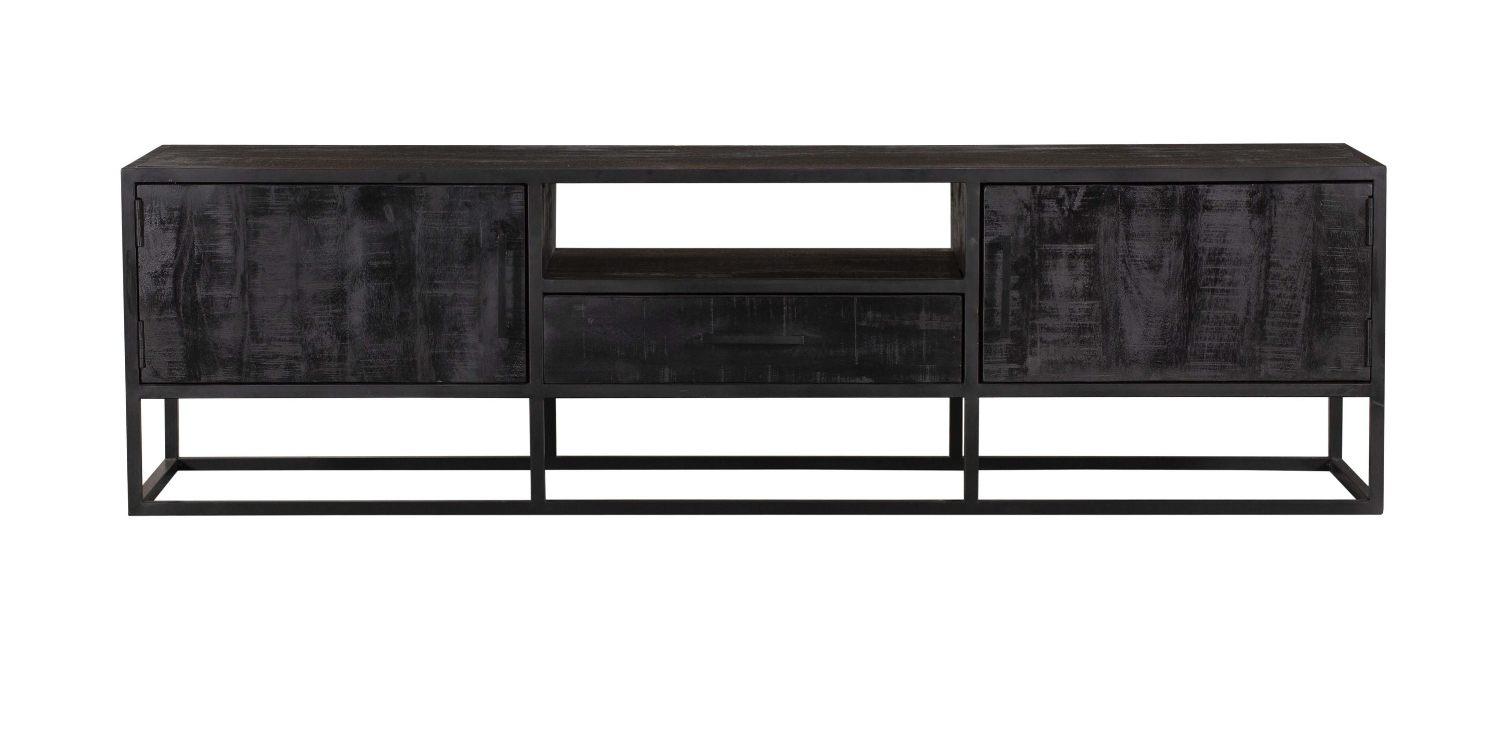 Das Sideboard aus unserer Serie Devereux Black verf ügt über vier Schubladen und zwei T üren. Es ist aus massivem Mangoholz gefertigt und mit einem schwarzen Lack behandelt. Sowohl der Rahmen als auch die Griffe sind aus Metall gefertigt und schwarz lackiert.Abmessungen: - Breite: 210/165 cm - Tiefe: 45 cm - Höhe: 75 cm Pflege: mit einem leicht feuchten Tuch abwischen.