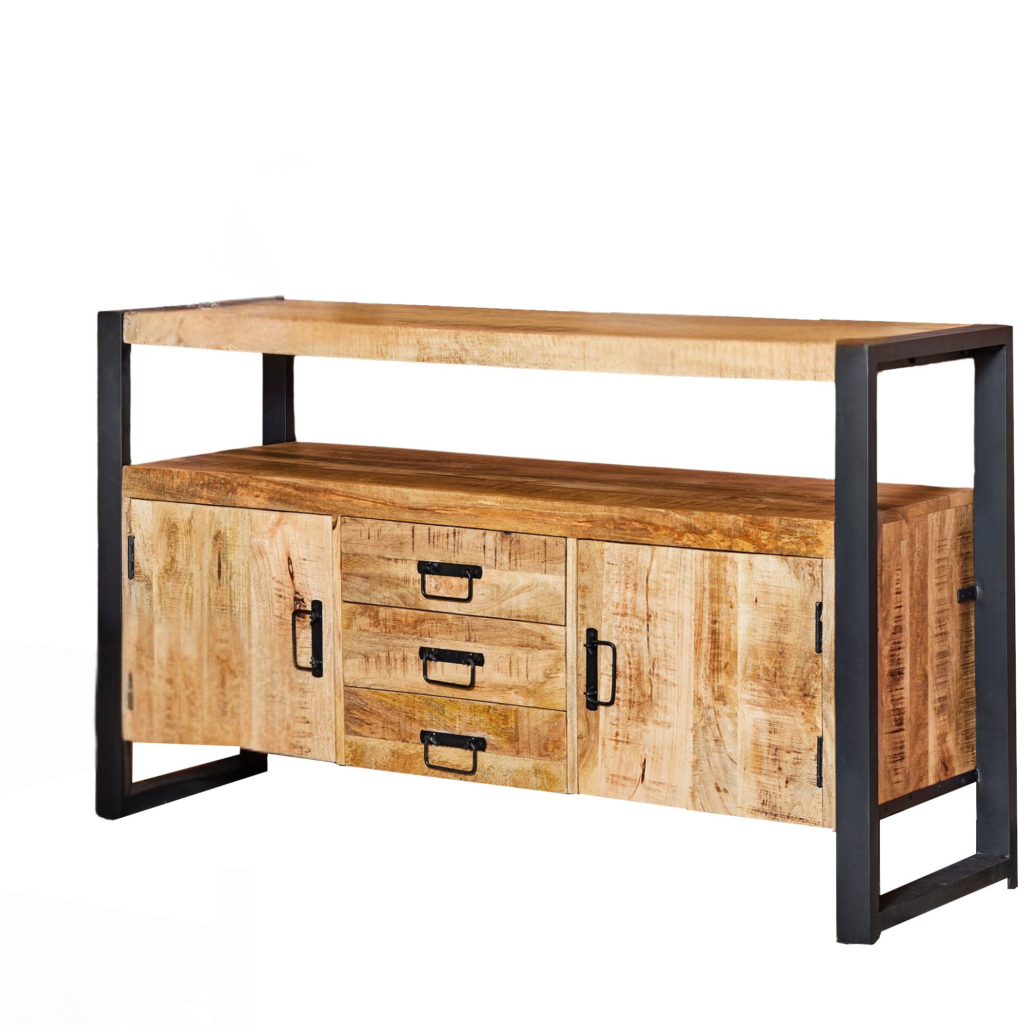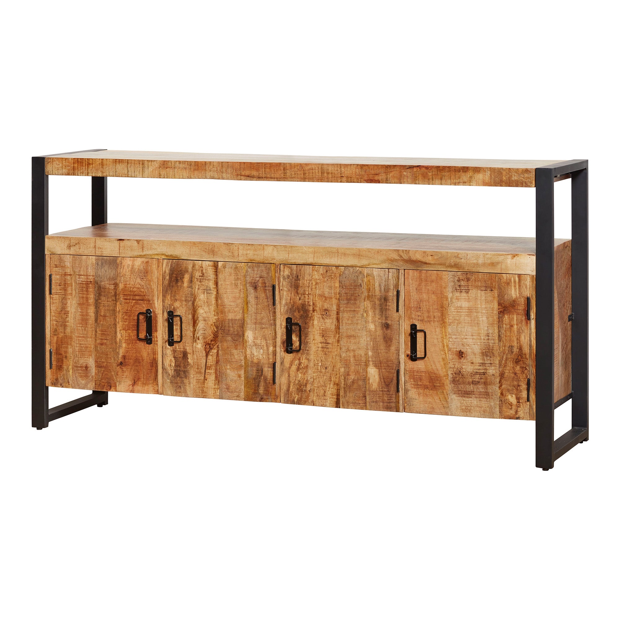 Das Sideboard Zavan präsentiert sich in einer Ausf ührung aus Mangoholz. Der Metallrahmen und die Metallgriffe sind mit schwarzem Lack überzogen. Dieses Modell ist mit zwei T üren und sechs Schubladen ausgestattet. Hinter den T üren befinden sich Regale. Mehrere Streifen aus lackiertem Holz sind in das Sideboard eingef ügt, was dem Möbelst ück seinen zeitgenössischen Charakter verleiht.Hinweis:Abmessungen Breite: 200/175/160/135 cm Tiefe: 40 cm Höhe: 80 cmPflege: mit einem leicht feuchten Tuch abwischen.