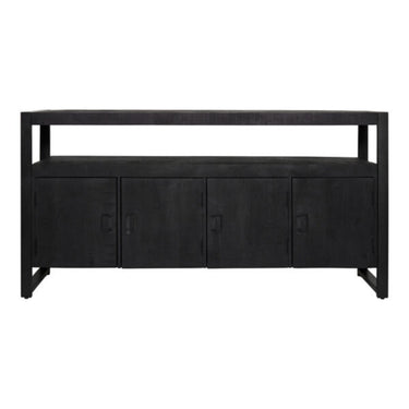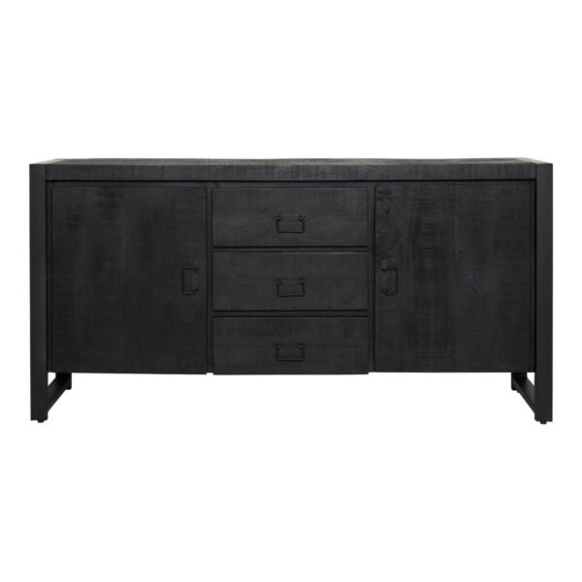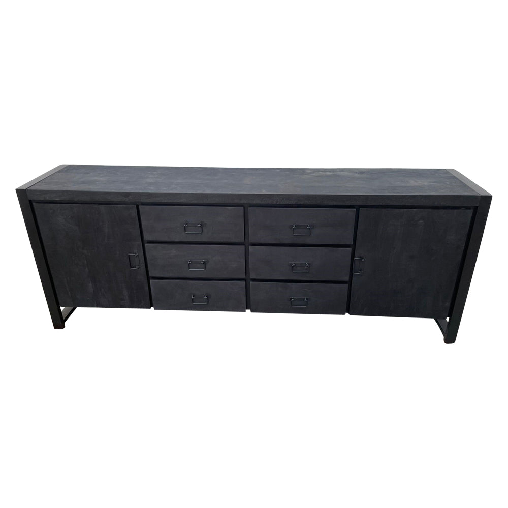 Das Sideboard Zavan Black besteht aus Mangoholz. Der Metallrahmen und die Metallgriffe sind mit schwarzem Lack behandelt. Dieses Modell verf ügt über zwei T üren und sechs Schubladen. Hinter den T üren befinden sich praktische Regale. Das Sideboard ist mit mehreren schwarz lackierten Holzstreifen eingelegt, was ihm seinen zeitgenössischen Charakter verleiht. Abmessungen Breite: 175 cm Tiefe: 45 cm Höhe: 90 cmPflege: mit einem leicht feuchten Tuch abwischen.