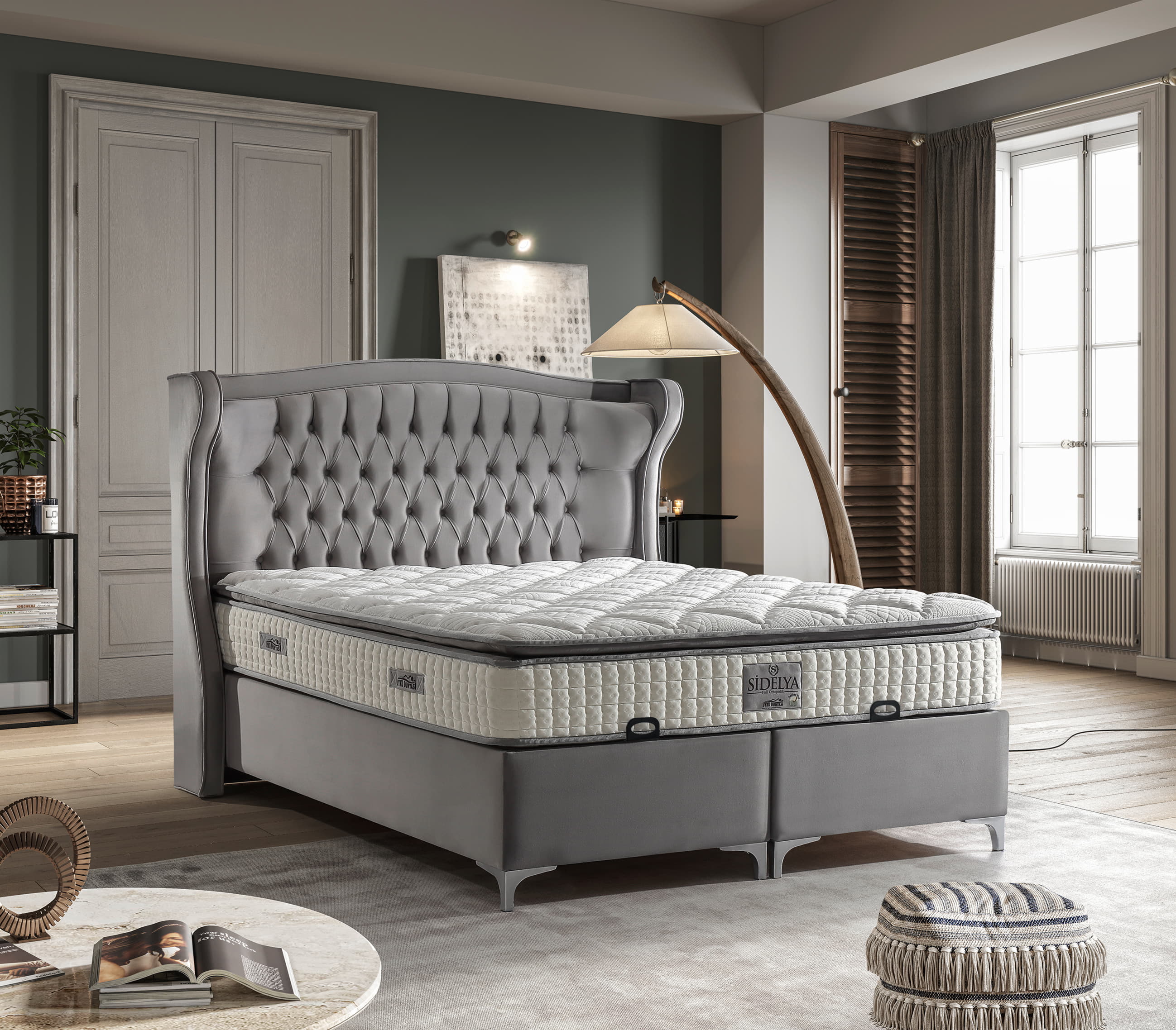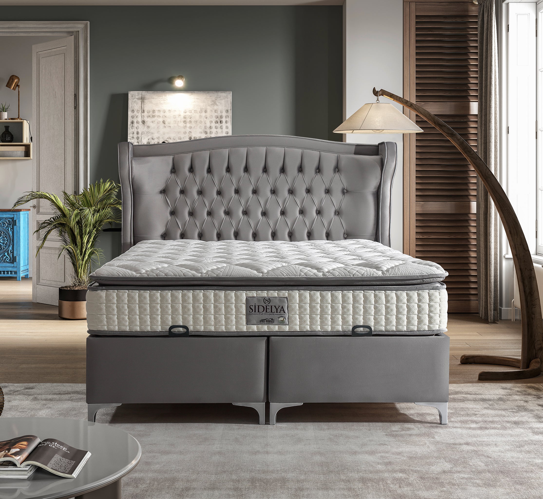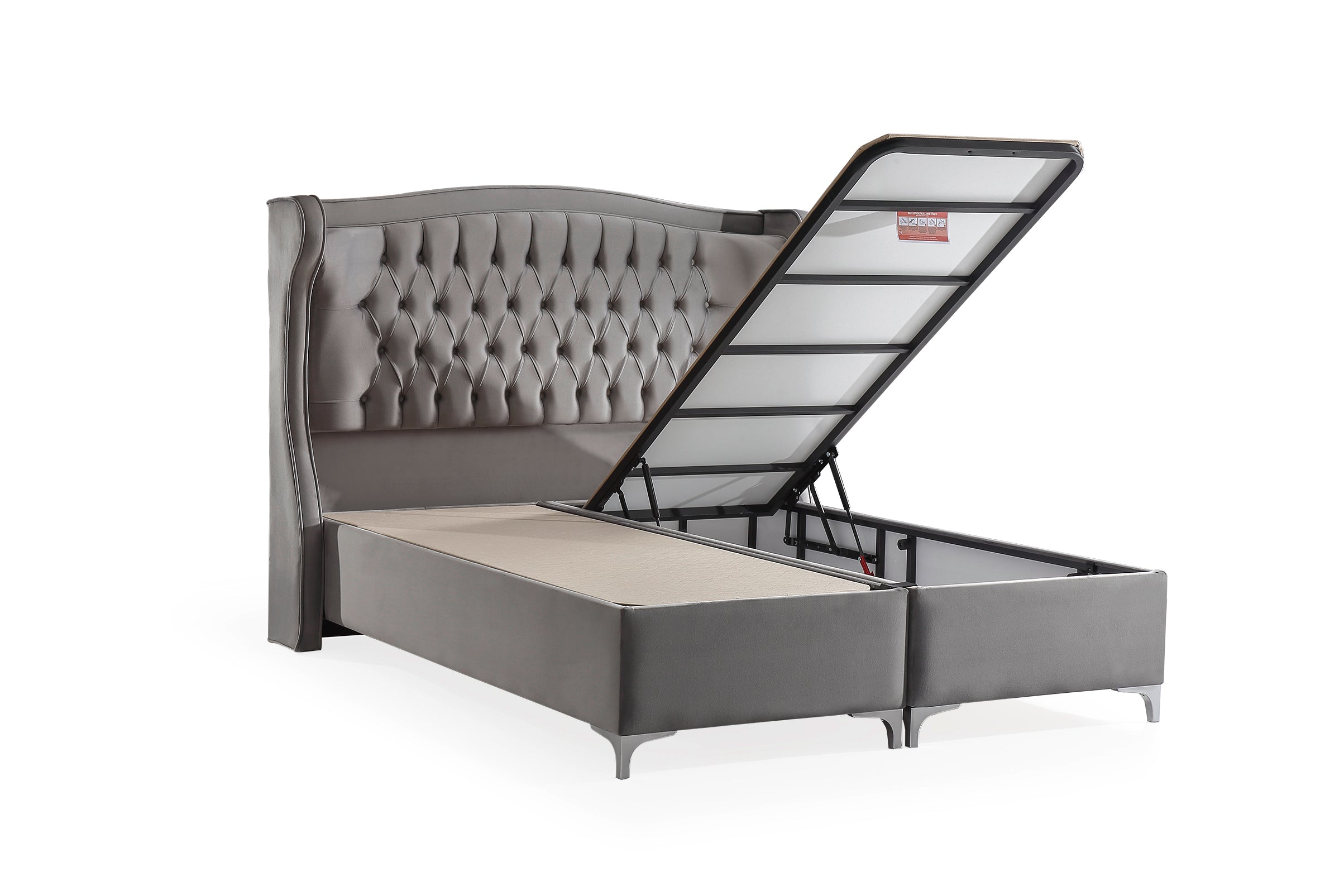 Dieses elegante Bett mit Stauraum verbindet luxuriöses Design mit höchstem Komfort. Das markante, handgefertigte Kopfteil mit tiefen Steppungen und geschwungenen Kanten verleiht dem Schlafzimmer eine stilvolle Atmosphäre. Die ergonomische Federkernmatratze mit Pillow-Top passt sich optimal dem Körper an und sorgt für erholsamen Schlaf. Der großzügige Bettkasten bietet reichlich Stauraum für Bettwäsche, Decken oder saisonale Kleidung und lässt sich dank des leichtgängigen Hebesystems mühelos öffnen. Der hochwertige Stoffbezug ist nicht nur weich und strapazierfähig, sondern auch pflegeleicht und langlebig. Die stabilen Metallfüße unterstreichen das edle Design und gewährleisten eine hohe Standfestigkeit. Erhältlich in verschiedenen Größen und Ausführungen, passt dieses Bett perfekt in jedes stilbewusste Zuhause.