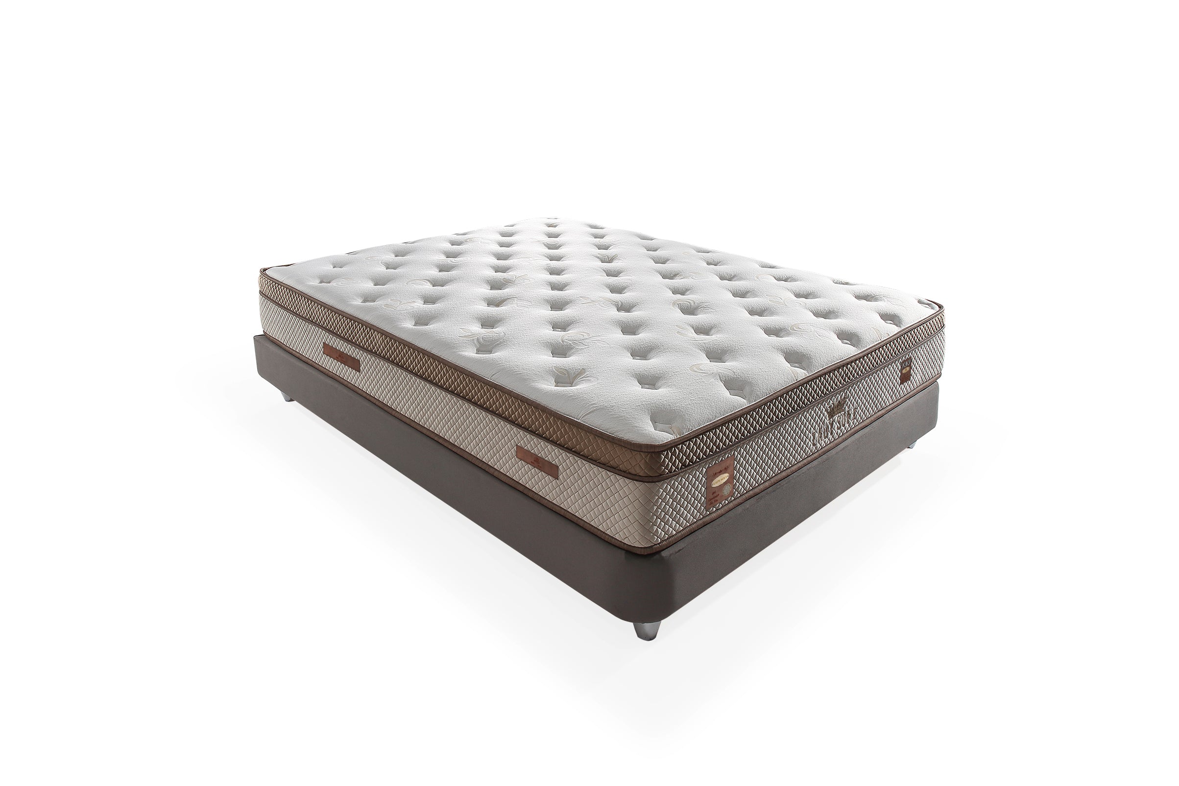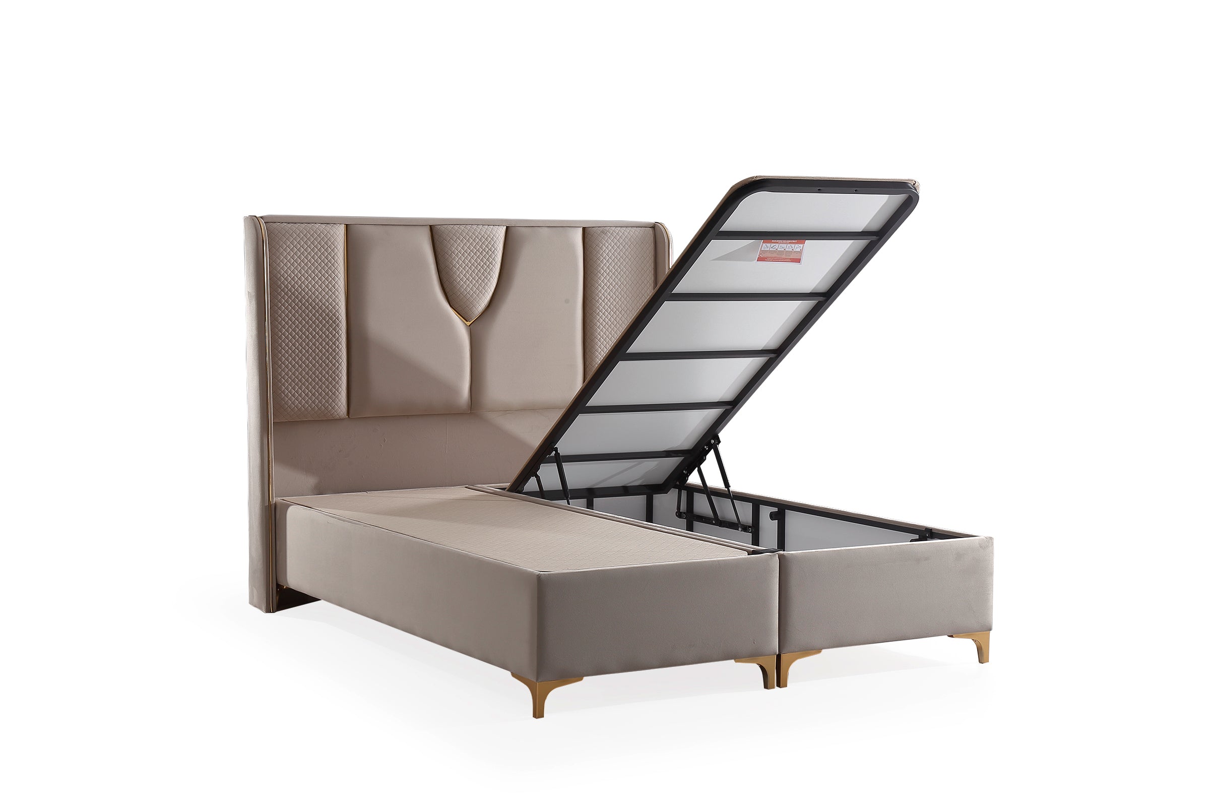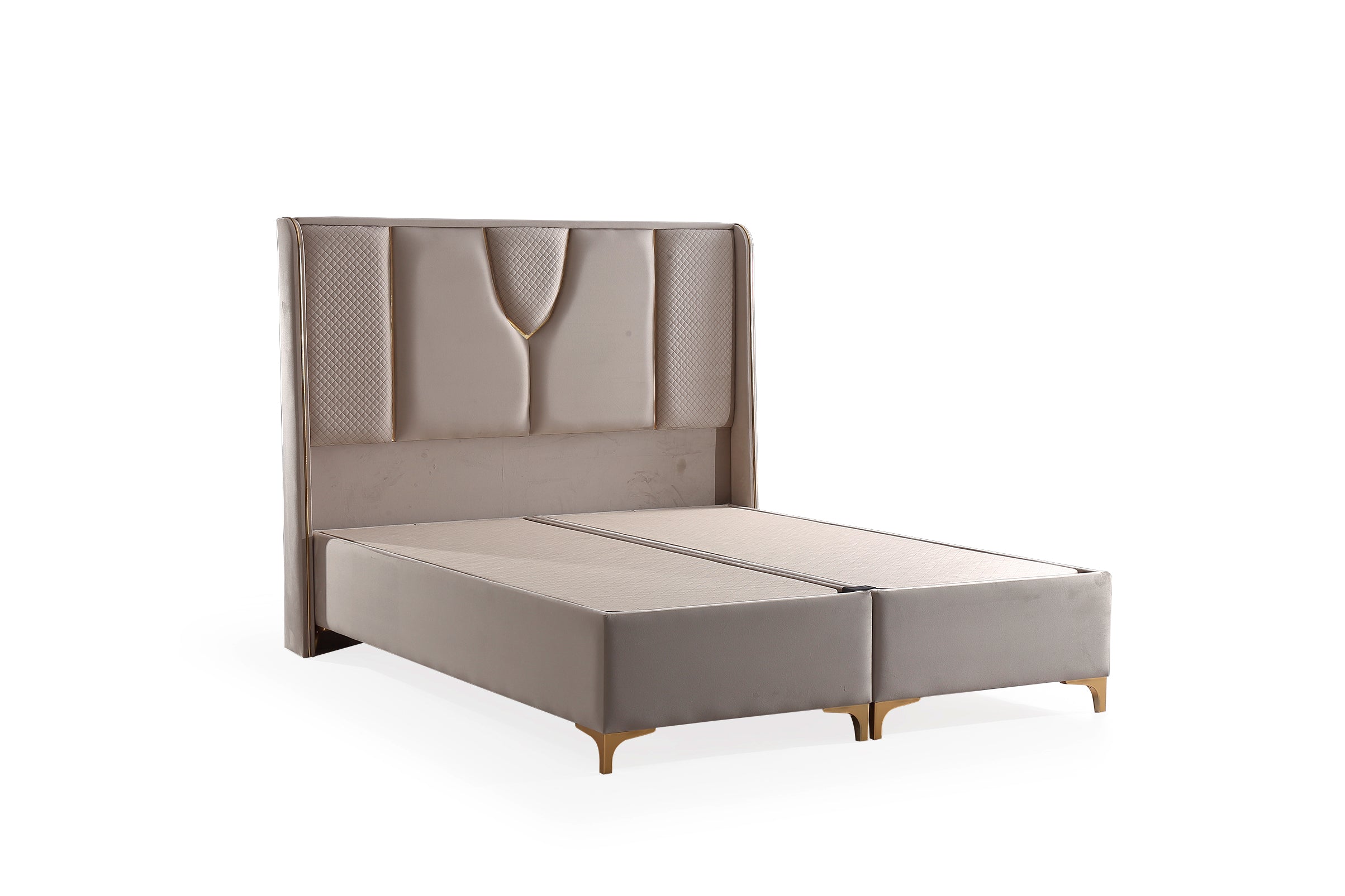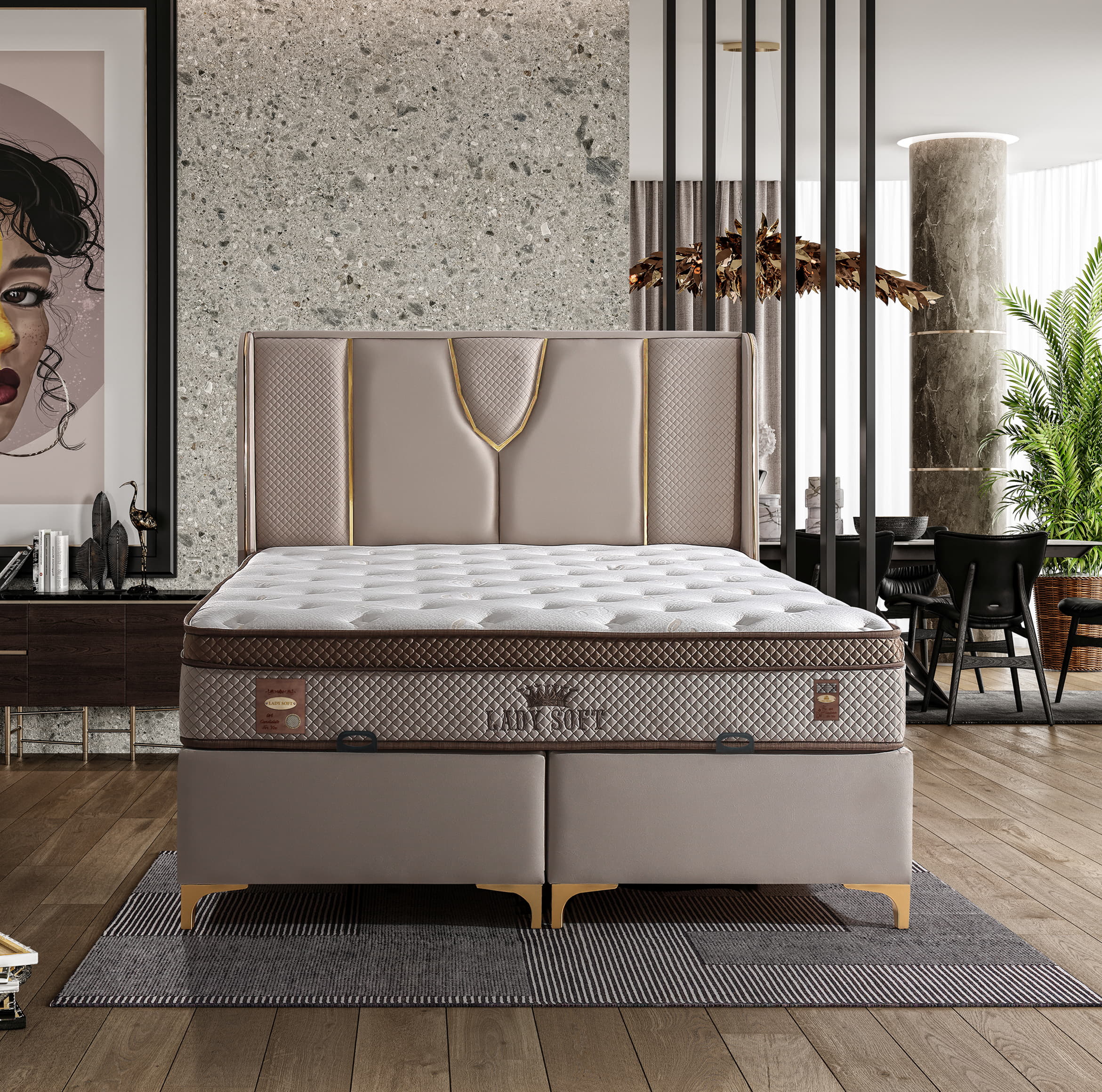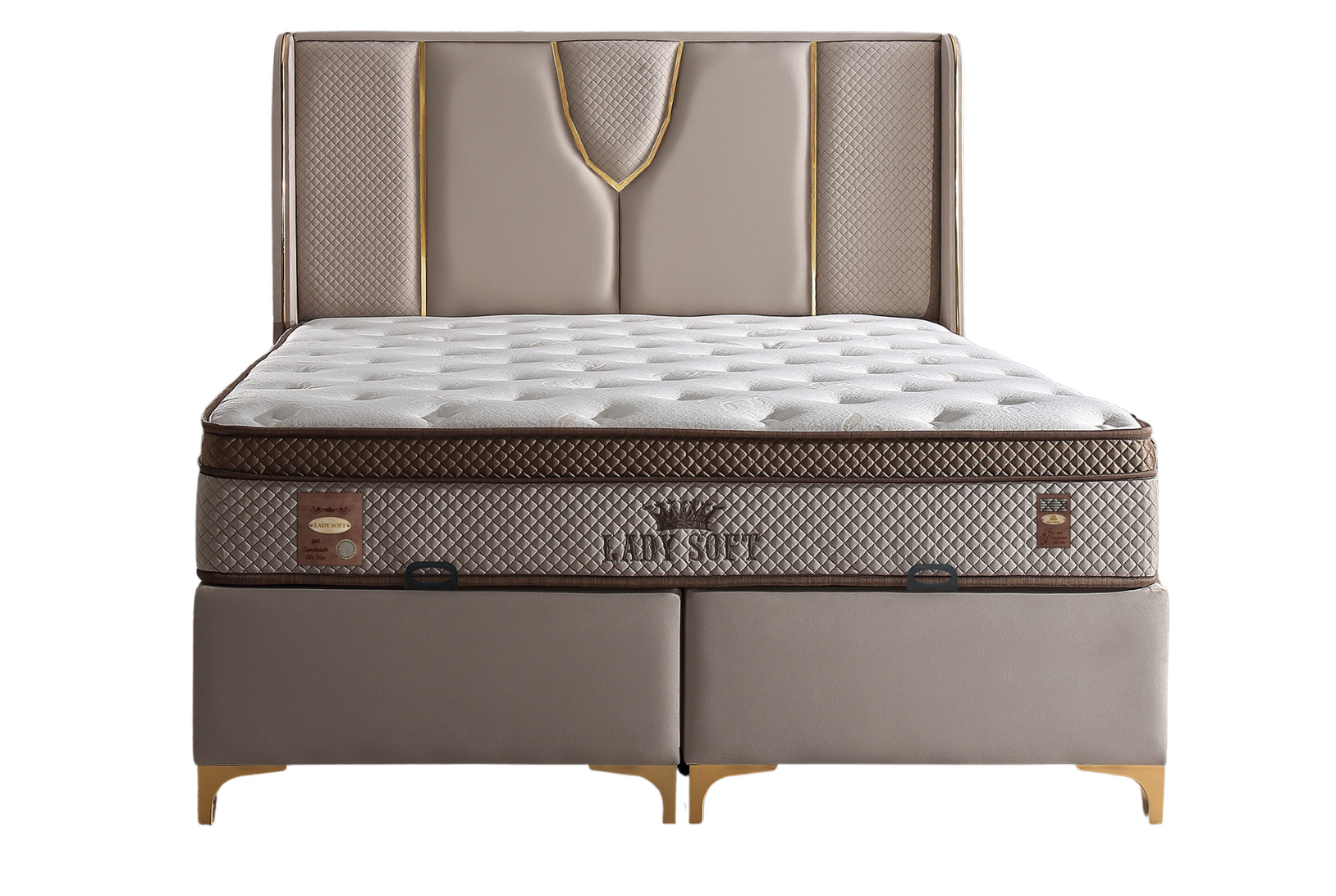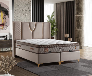 Das Lady Soft Boxspringbett beeindruckt mit einem einzigartigen, luxuriösen Design und exquisiten Details. Das aufwendig gestaltete Kopfteil mit gepolsterten Flächen, rautenförmigen Mustern und goldfarbenen Akzenten setzt stilvolle Akzente und verleiht dem Schlafzimmer eine elegante Note. Der samtig-weiche Stoffbezug sorgt für eine angenehme Haptik und ein edles Erscheinungsbild. Die solide Basis bietet eine langlebige Konstruktion, während die erhöhte Liegefläche für zusätzlichen Komfort sorgt. Der geteilte Unterbau ermöglicht eine einfache Montage und Stabilität. Die goldfarbenen Metallfüße runden das edle Design ab und sorgen für eine moderne, schwebende Optik. Dank der dezenten, aber eleganten Farbgestaltung in warmem Beige-Ton fügt sich das Lady Soft Boxspringbett harmonisch in verschiedene Einrichtungsstile ein. Es verbindet höchste Qualität mit anspruchsvollem Design – ideal für ein stilbewusstes Schlafzimmer.