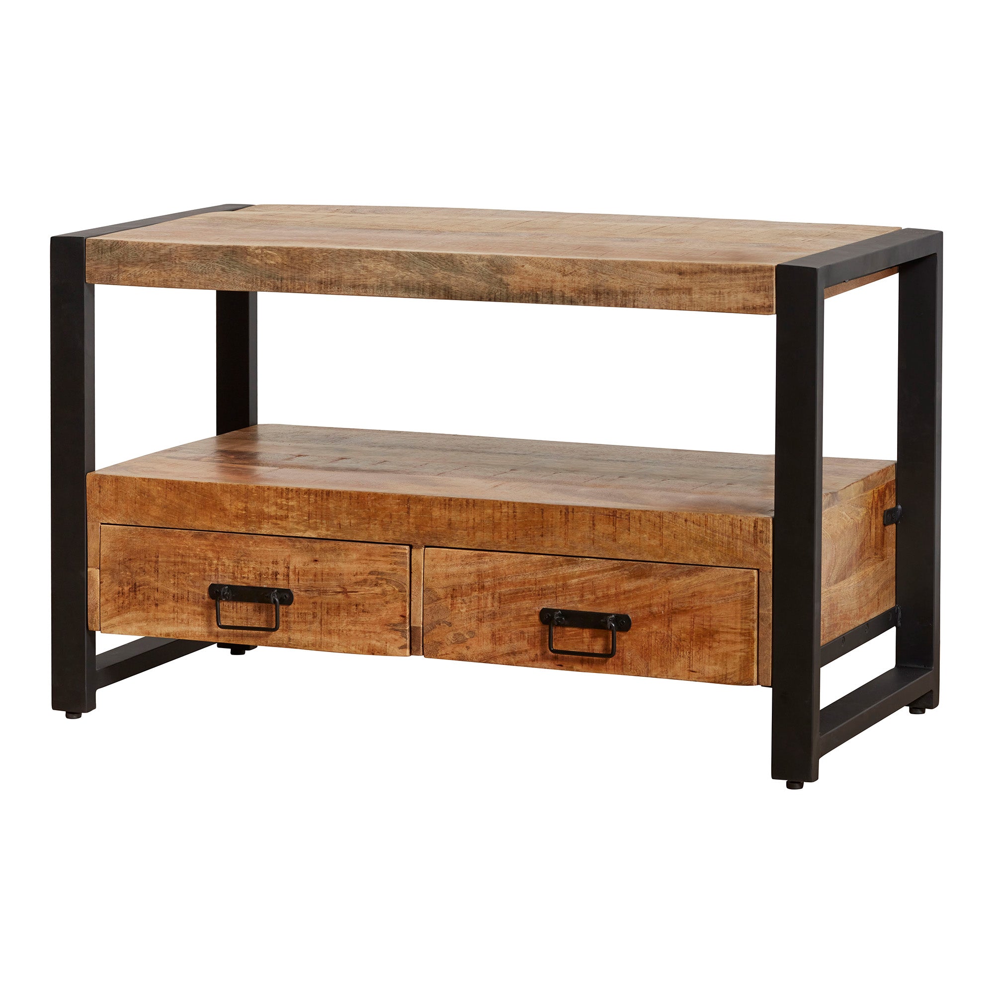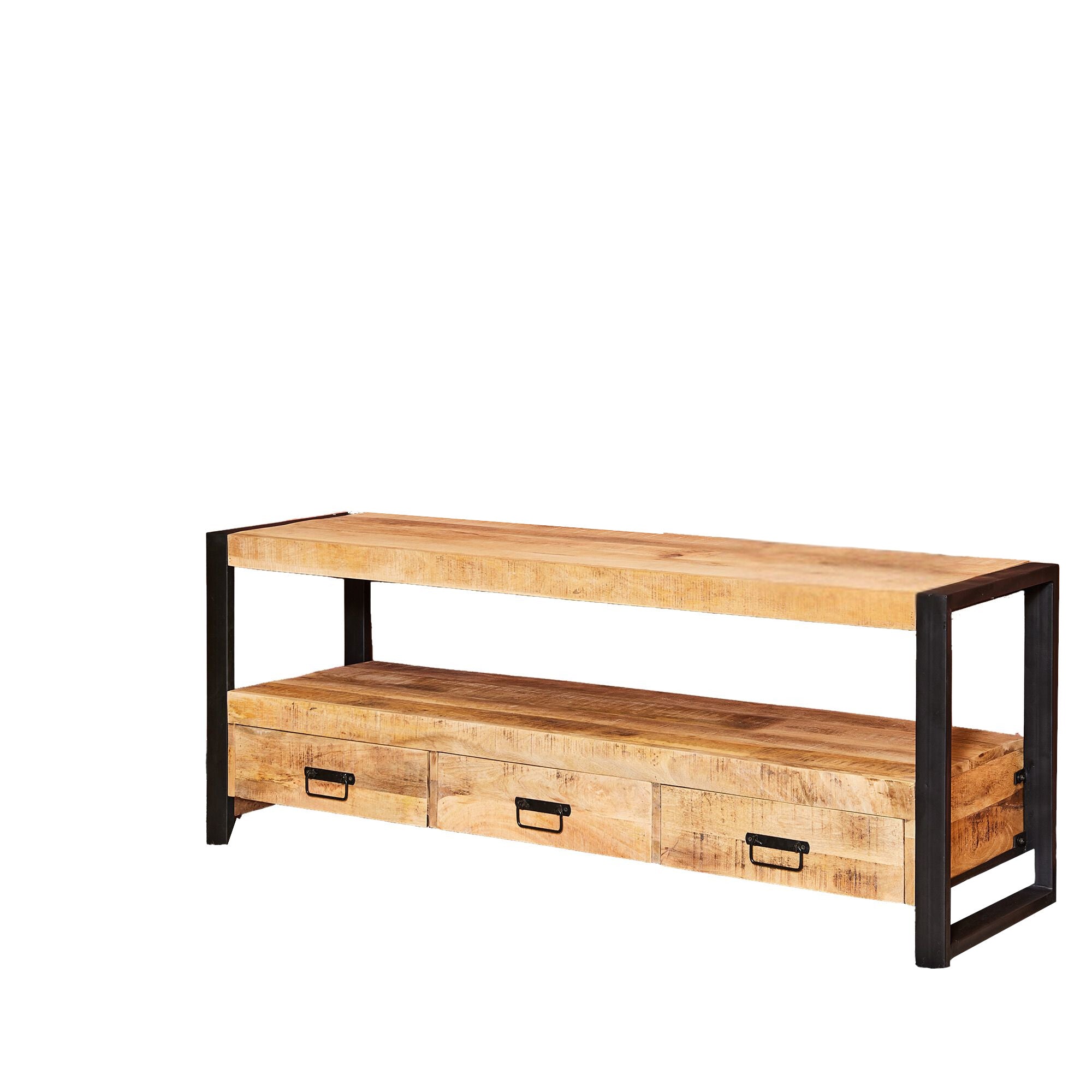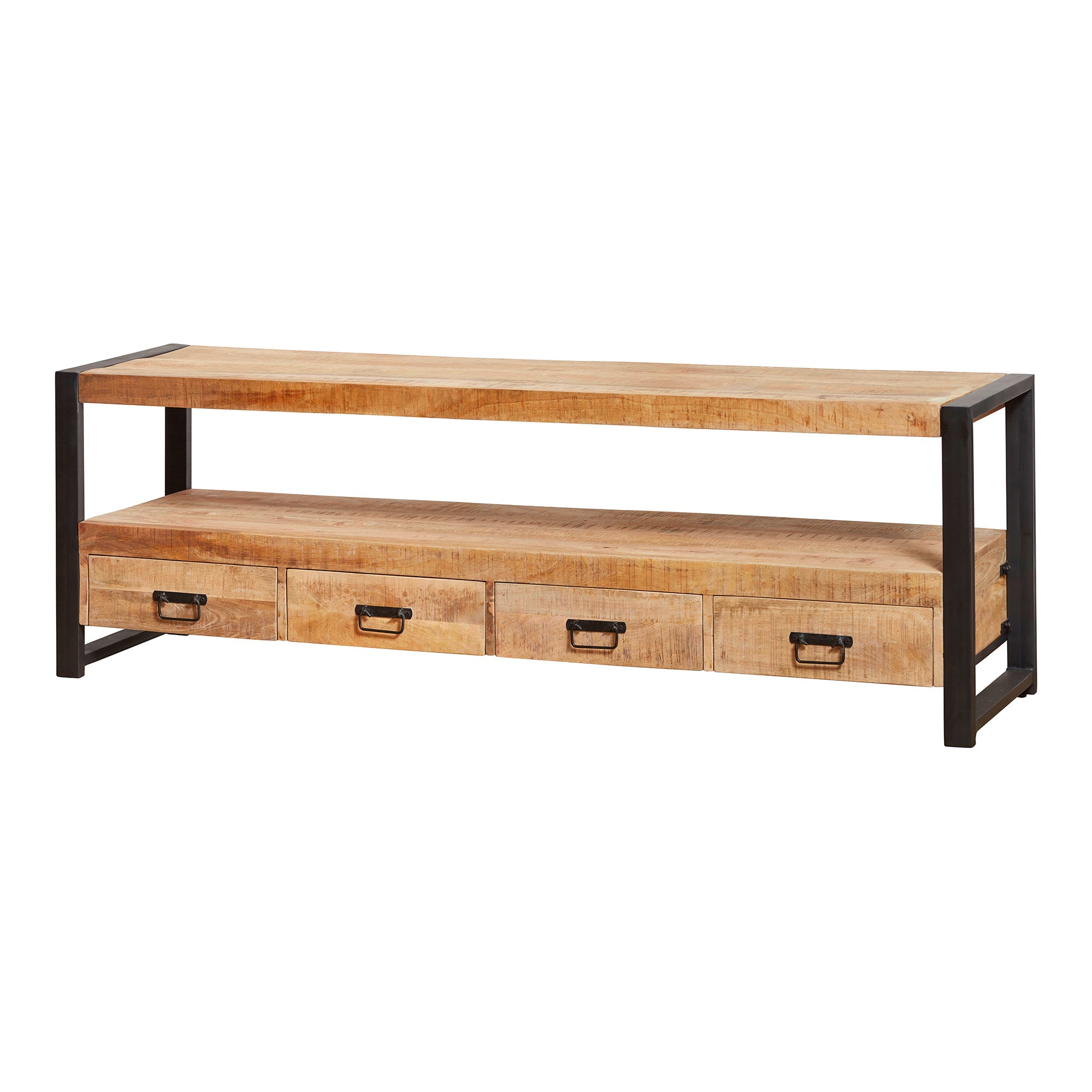Die TV-Möbel Zavan sind aus Mangoholz gefertigt, wobei der Metallrahmen und die Metallgriffe mit schwarzem Lack lackiert sind. Dieses Modell verf ügt über vier Schubladen und ein offenes Fach. Der TV-Schrank ist zudem mit mehreren Streifen aus lackiertem Holz eingelegt, was dem Möbelst ück seinen zeitgenössischen Charakter verleiht.Abmessungen: - Breite: 180/150/100 cm - Tiefe: 45 cm - Höhe: 60 cm Pflege: mit einem leicht feuchten Tuch abwischen.