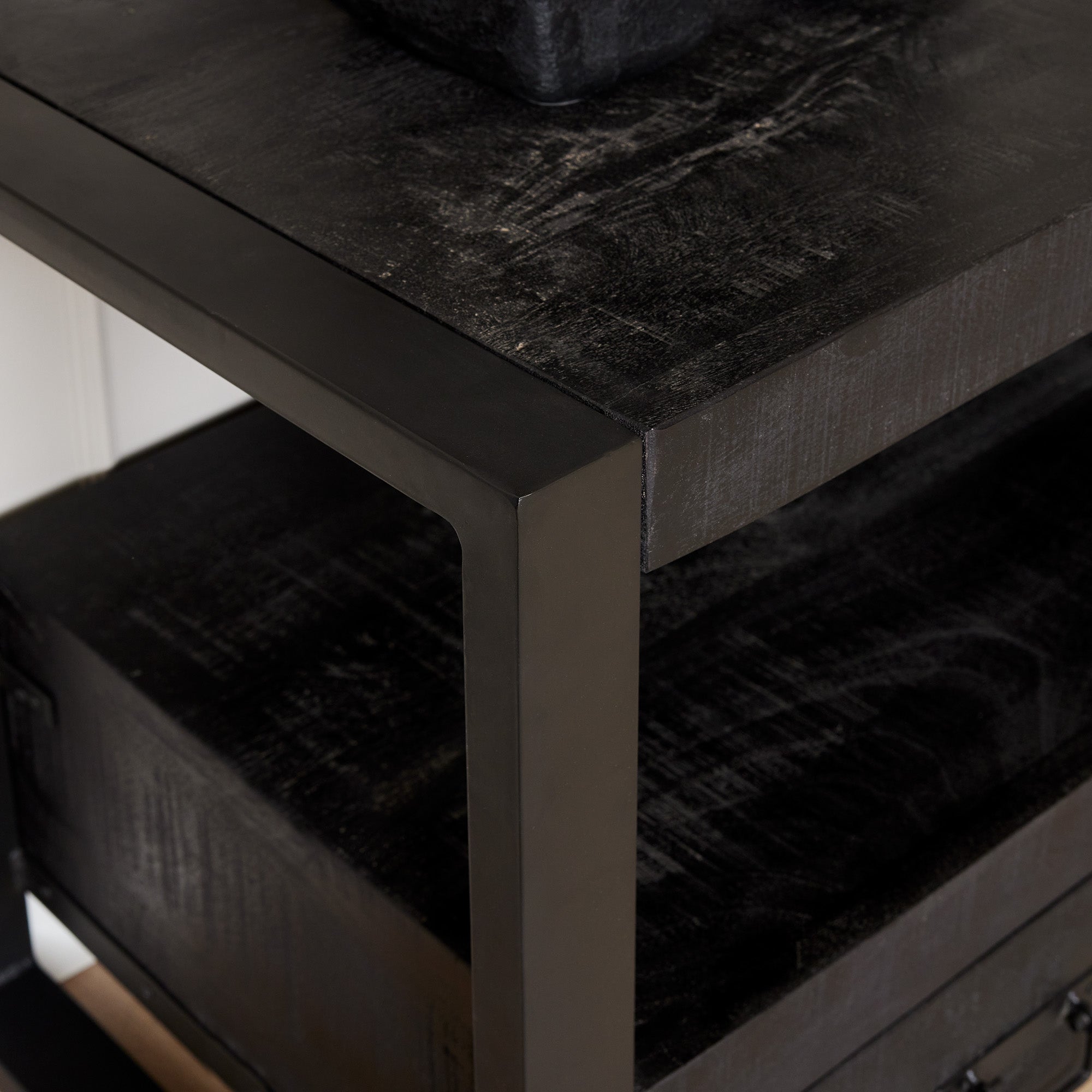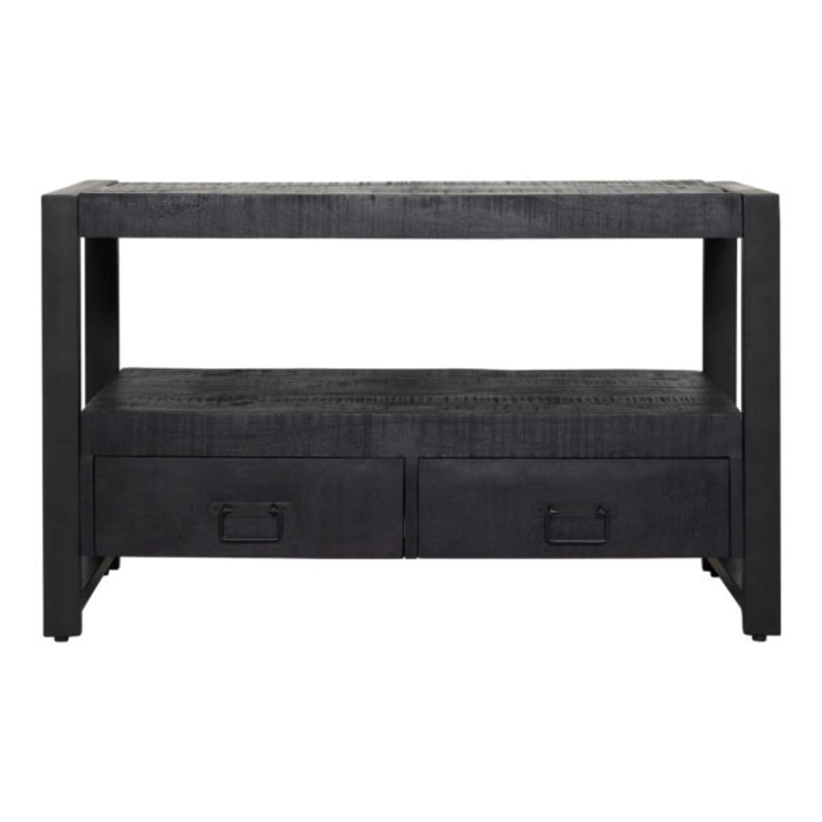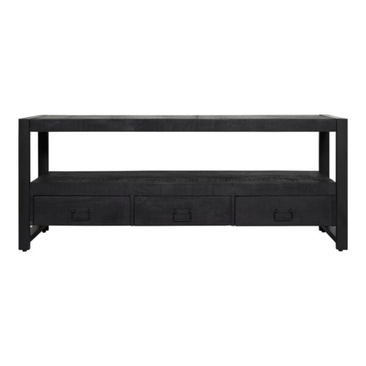 Das TV-Möbel Zavan Black ist aus Mangoholz gefertigt. Der Metallrahmen und die Metallgriffe sind mit einem schwarzem Lack versehen. Dieses Modell verf ügt über vier Schubladen und ein offenes Fach. Der TV-Schrank ist mit mehreren Streifen aus schwarz lackiertem Holz eingelegt, die dem Möbelst ück seinen zeitgenössischen Charakter verleiht.Abmessungen Breite: 180 cm Tiefe: 45 cm Höhe: 60 cm Pflege: mit einem leicht feuchten Tuch abwischen.