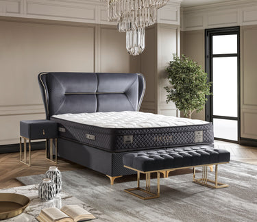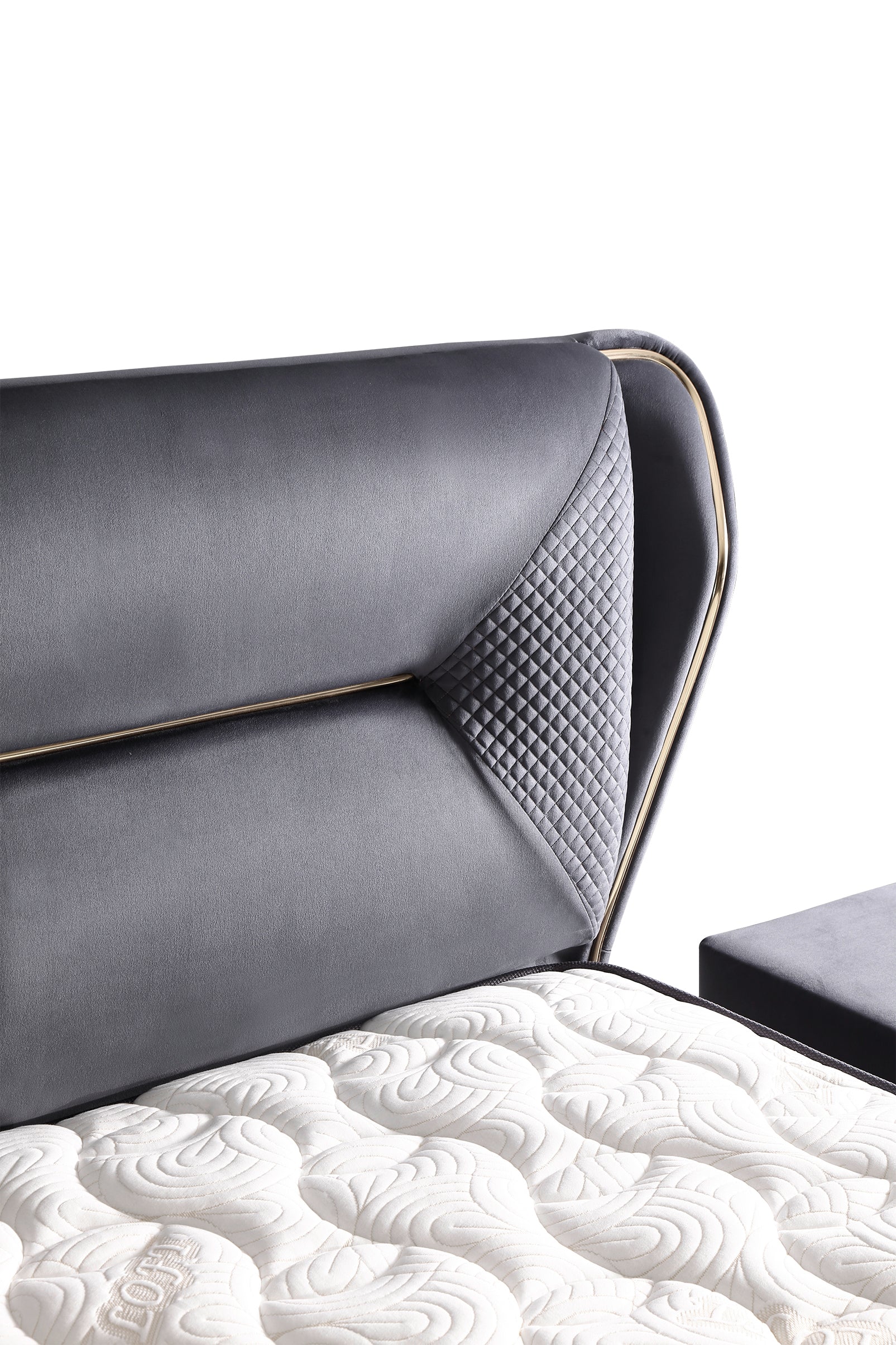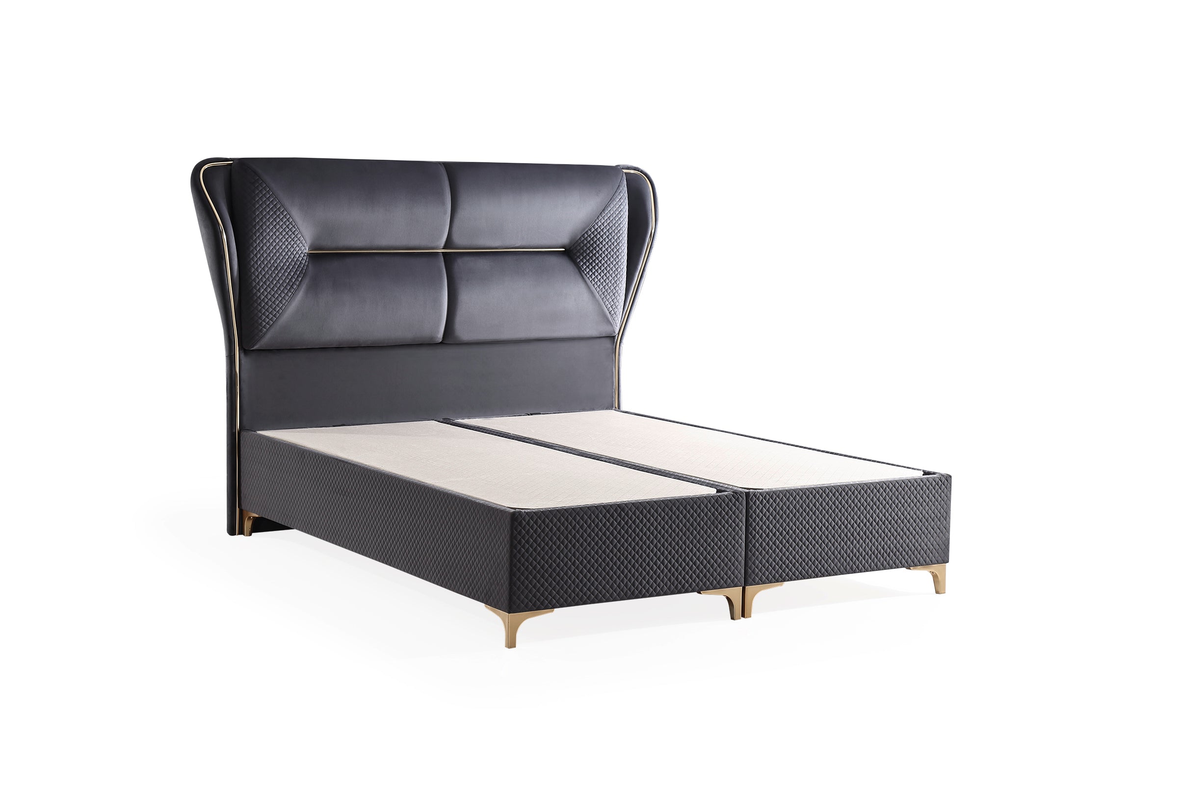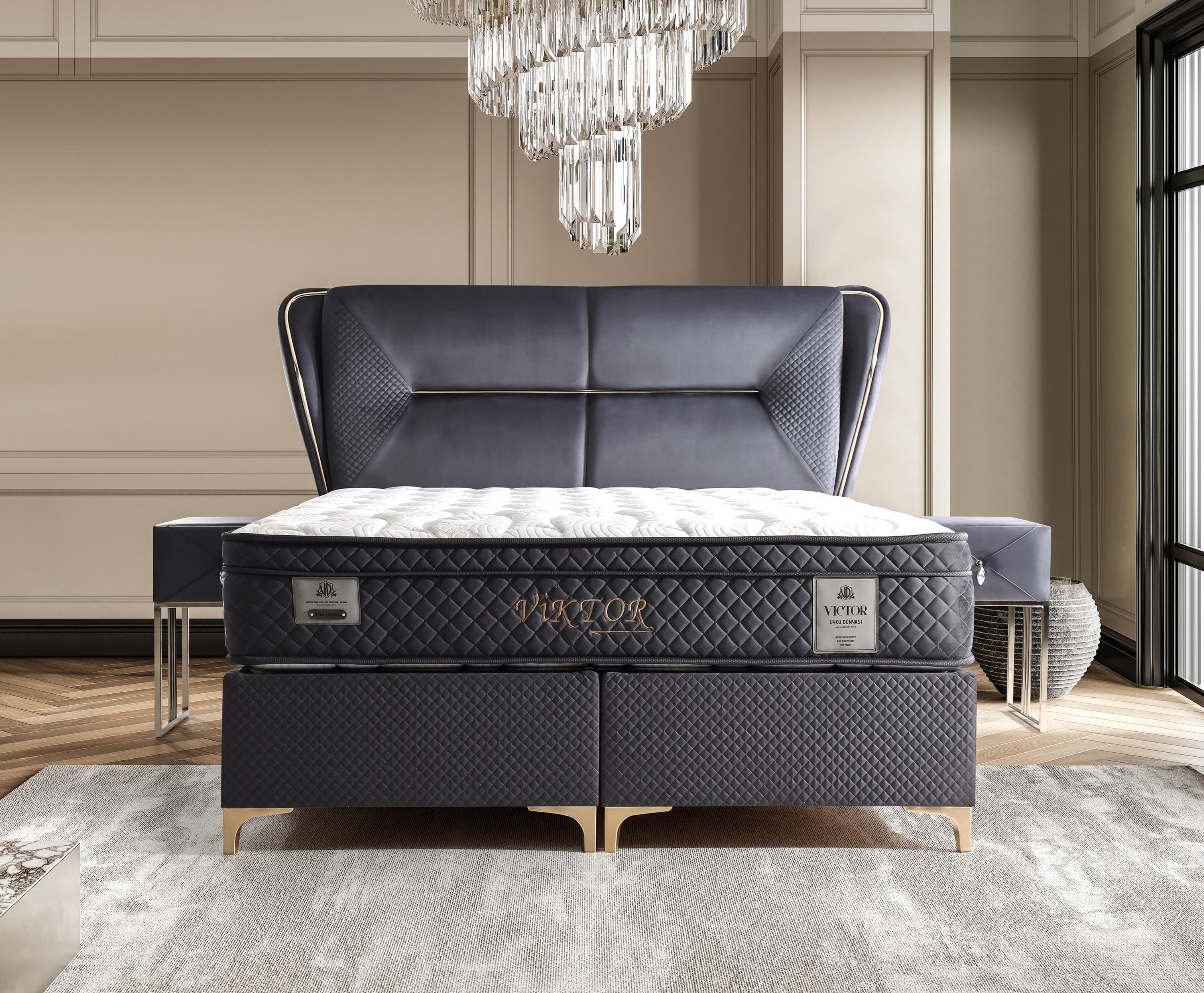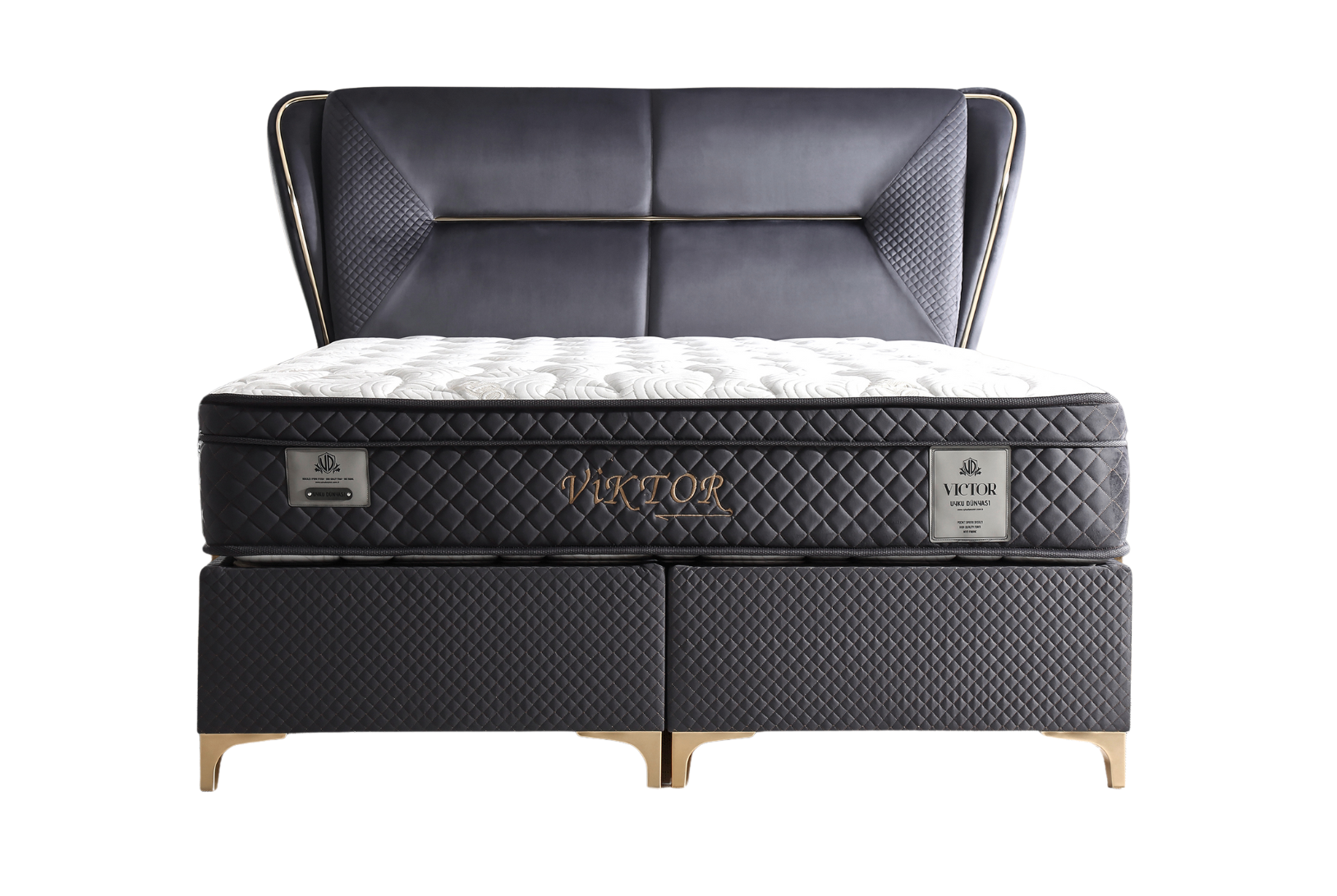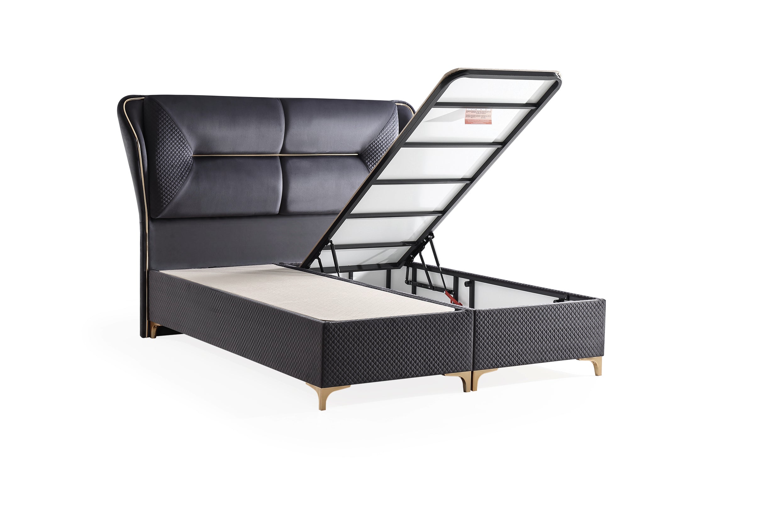 Das Viktor Bett kombiniert klare Linien mit abgesetzten Strukturen. Das hohe Kopfteil ist gepolstert und wird durch seitliche Flügel mit abgesteppten Flächen ergänzt. Goldfarbene Akzente betonen das Design und setzen Kontraste zum dunkelblauen Stoffbezug. Die Basis besteht aus einer stabilen Konstruktion mit einem integrierten Stauraum. Ein Hebemechanismus ermöglicht den Zugang zum Innenraum. Das Bettgestell ist rundum gepolstert und mit einem rautenförmigen Muster versehen. Die Kombination aus geometrischen Elementen und goldfarbenen Akzenten bestimmt das Erscheinungsbild. Die Material- und Farbwahl unterstreicht das Design.