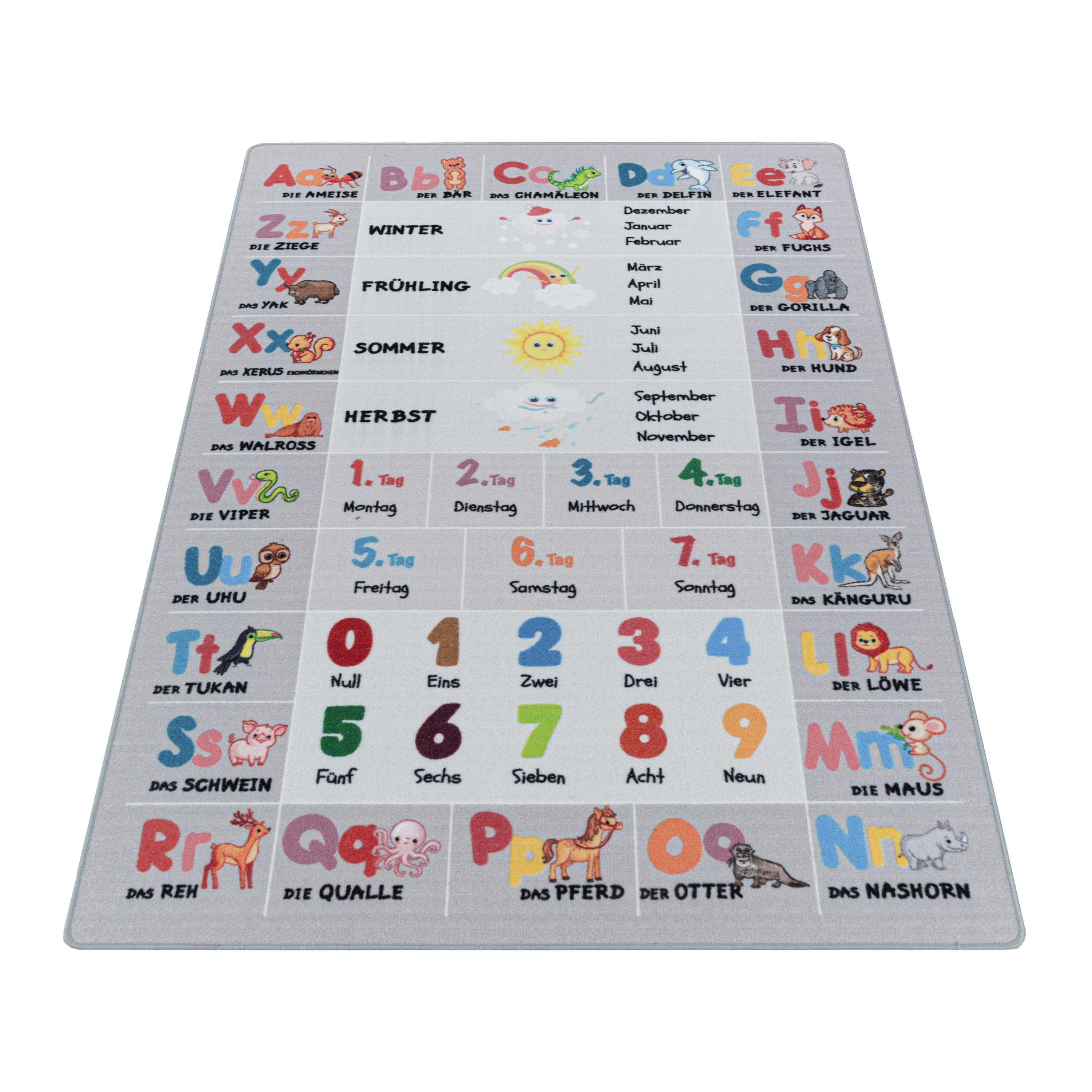 Der Kinderteppich Plaelle in Grau sorgt mit seinem Alphabet, Buchstaben, Zahlen und Tieren-Design für lehrreiche und spannende Stunden im Kinderzimmer. Die bunten, verspielten Motive fördern das Lernen von Buchstaben und Zahlen auf spielerische Weise. Gefertigt aus strapazierfähigem Polyamid und hochwertig gedruckt, ist der Teppich weich, rutschfest und besonders pflegeleicht. Ideal für das Kinderzimmer, Spielzimmer, Babyzimmer oder Jugendzimmer. Die robuste Verarbeitung sorgt für langlebigen Spielspaß, während der Teppich Ihre Böden zuverlässig schützt. Reinigung bequem per Handwäsche.